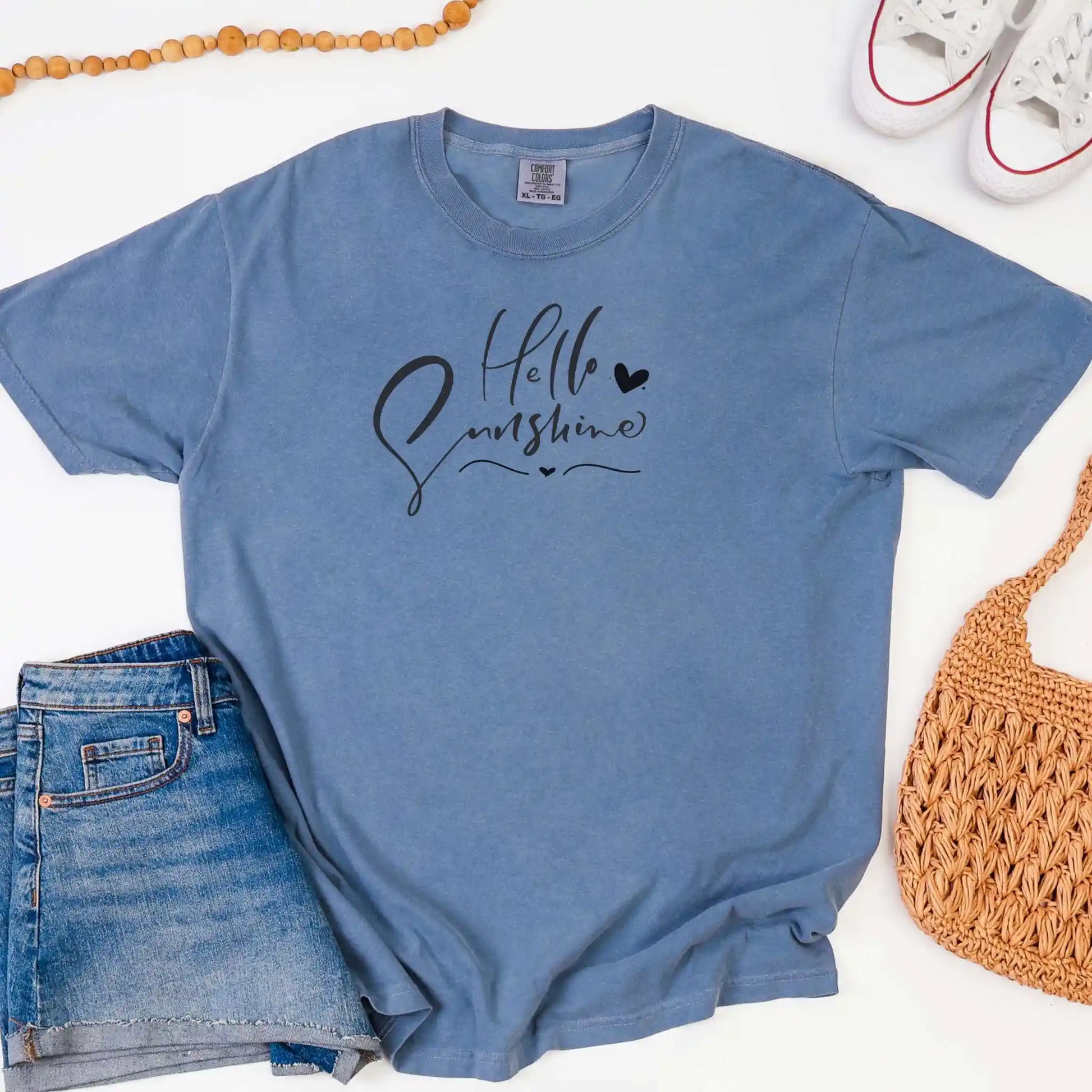 Features the phrase “Hello Sunshine” in flowing, handwritten script with playful heart accents and a graceful underline flourish. Sweet, uplifting, and full of charm.