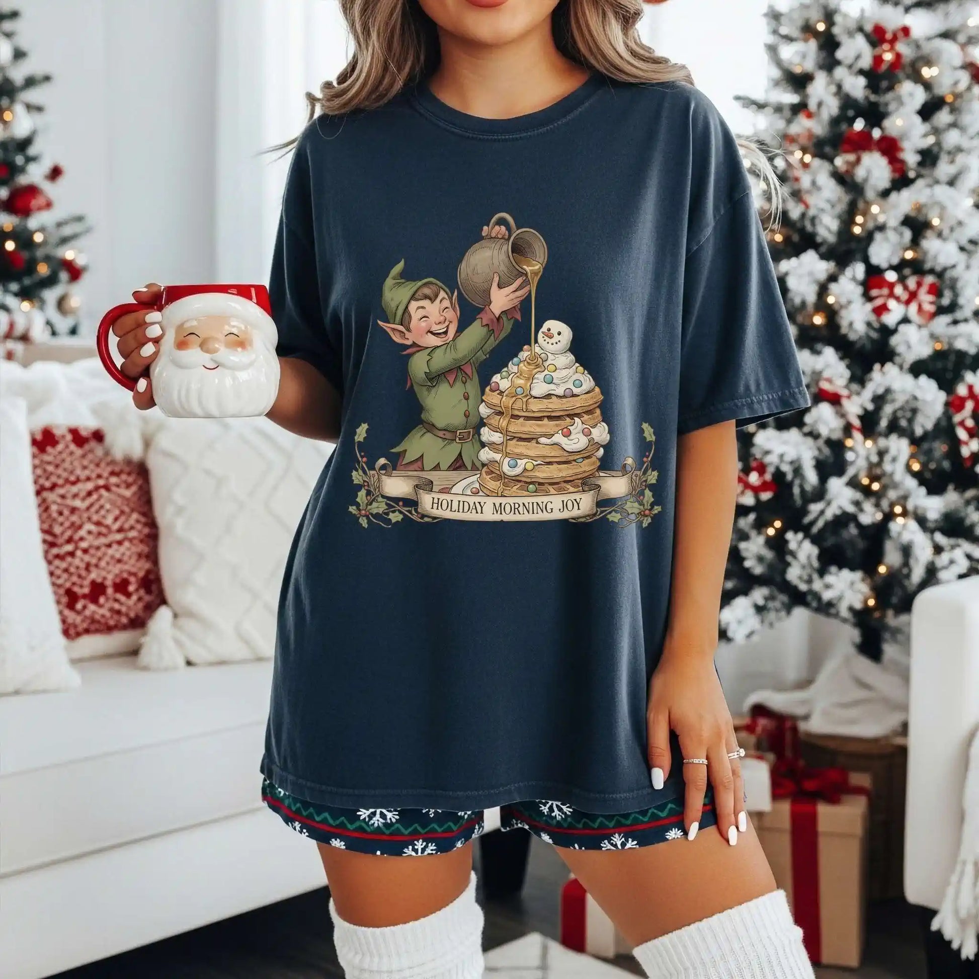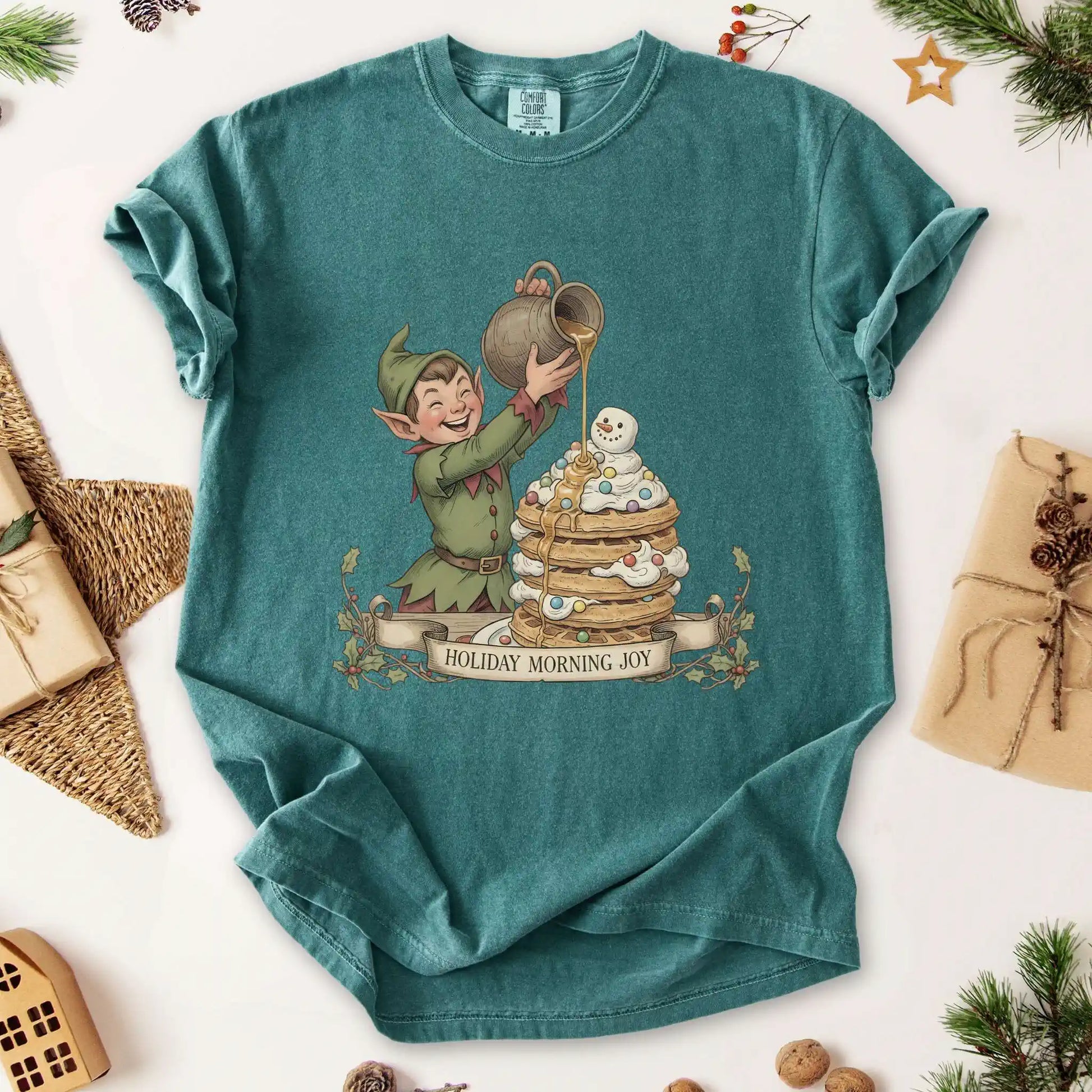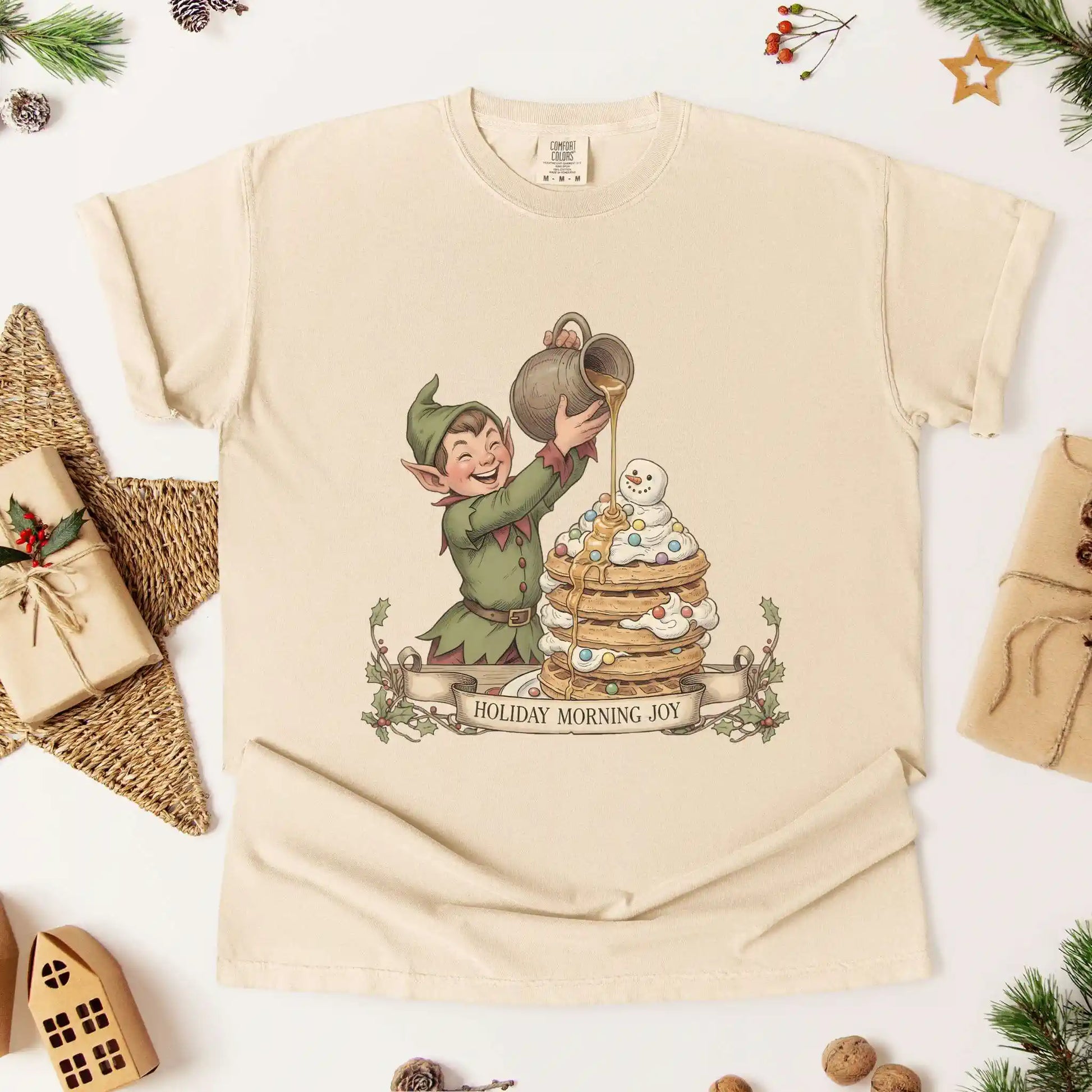 Our “Holiday Morning Joy” tee is a cheerful nod to the sweet moments of the season featuring an adorable elf pouring syrup over a stack of pancakes topped with holiday sprinkles and a mini snowman. It’s perfect for those who love breakfast, magic, and cozy holiday mornings.