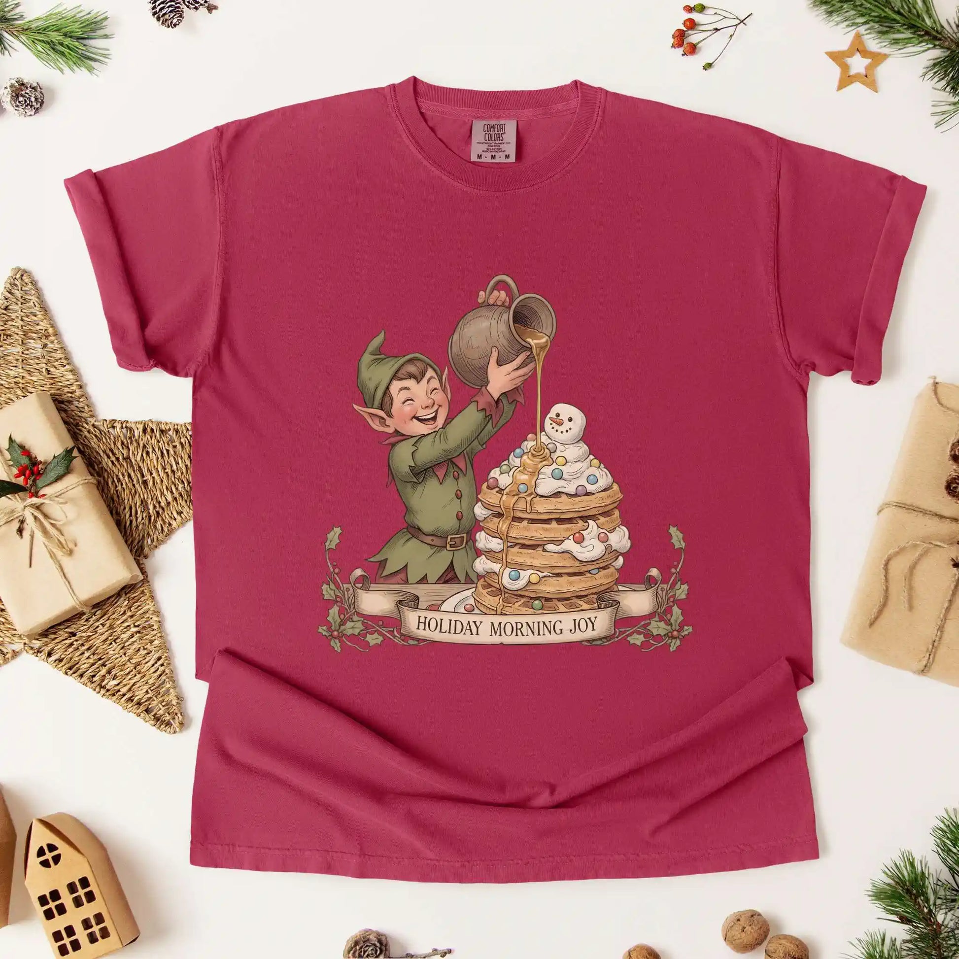 Features a front centered design with an elf joyfully pouring syrup over a delicious stack of pancakes, adorned with colorful holiday toppings. Printed on a comfy t-shirt ideal for holiday breakfasts, festive gatherings, or any day that could use a little extra cheer.