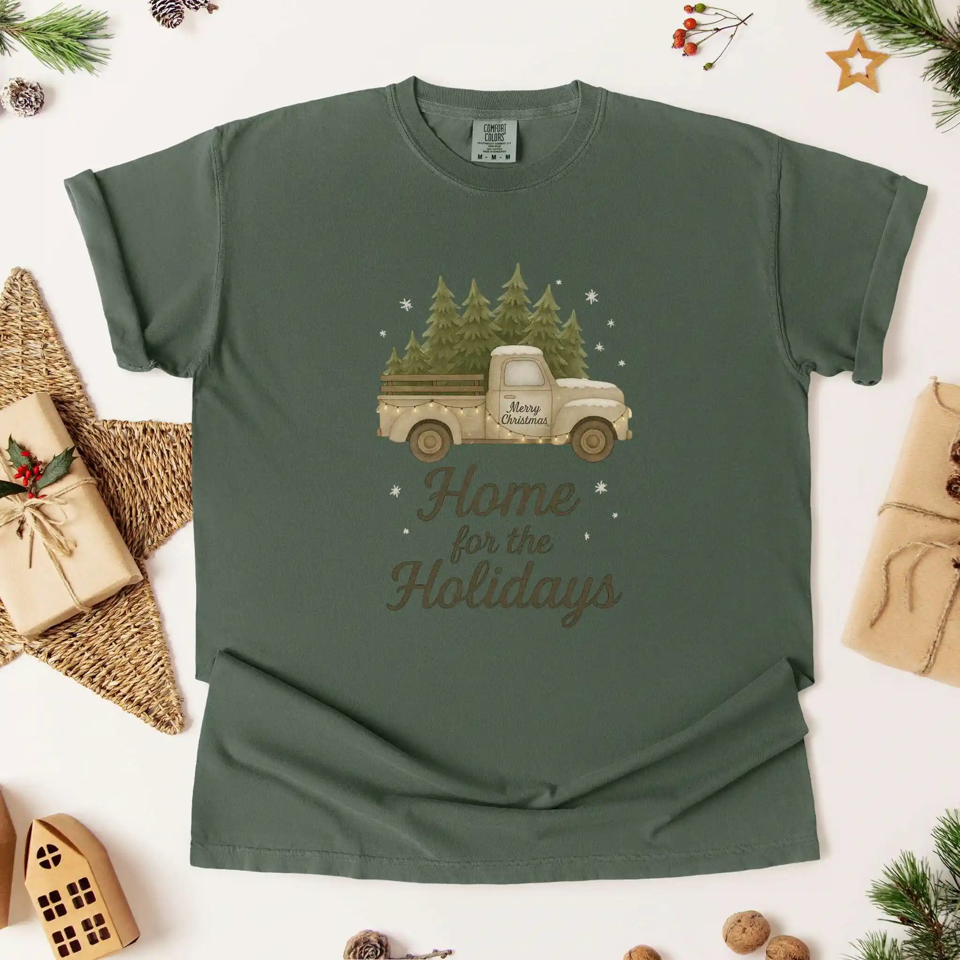 Features a front graphic of a vintage pickup truck carrying evergreen trees, dusted with snow and wrapped in glowing lights, with the phrase “Home for the Holidays” beneath. Printed on a t-shirt with a front placement — ideal for festive outings, gift giving, or relaxing by the tree.
