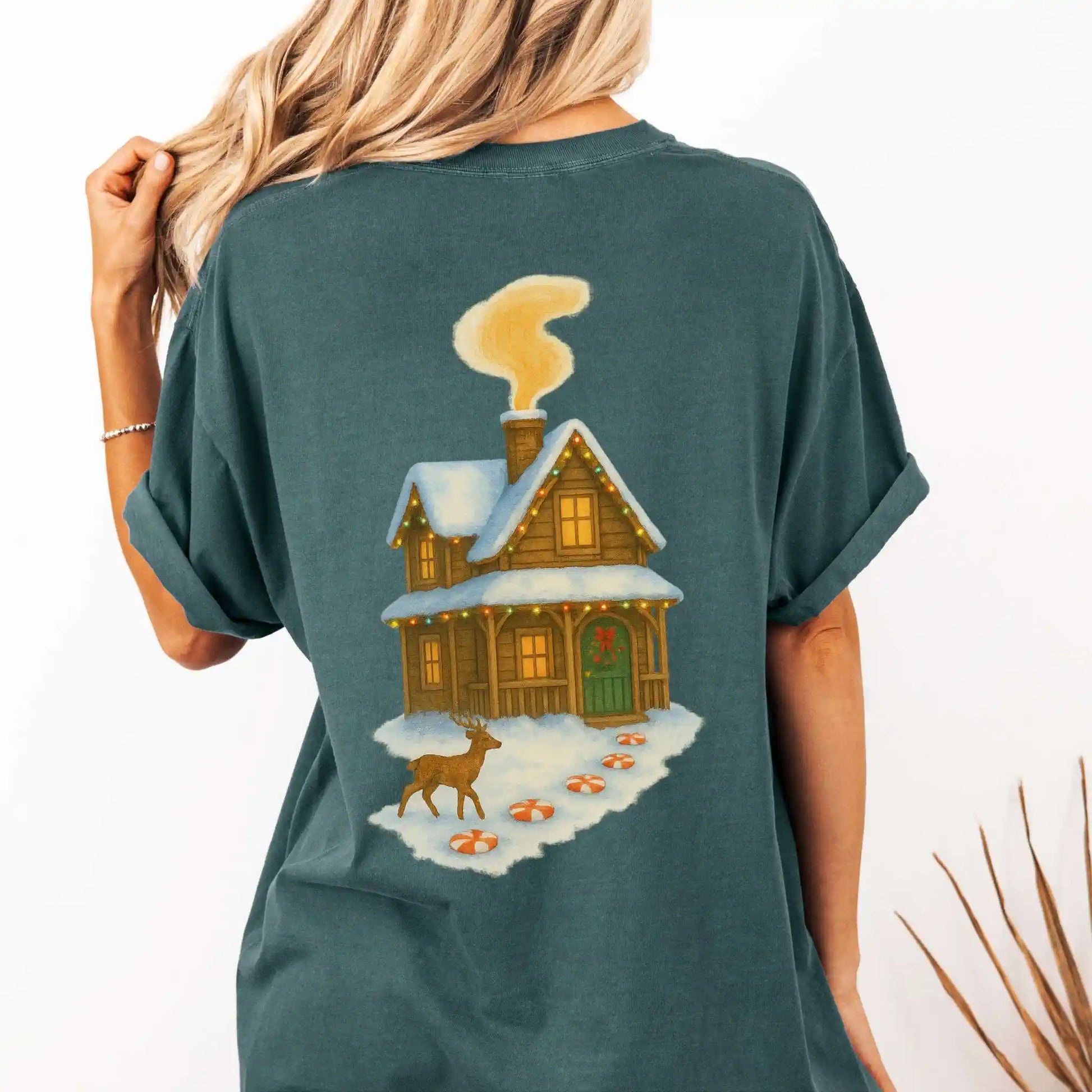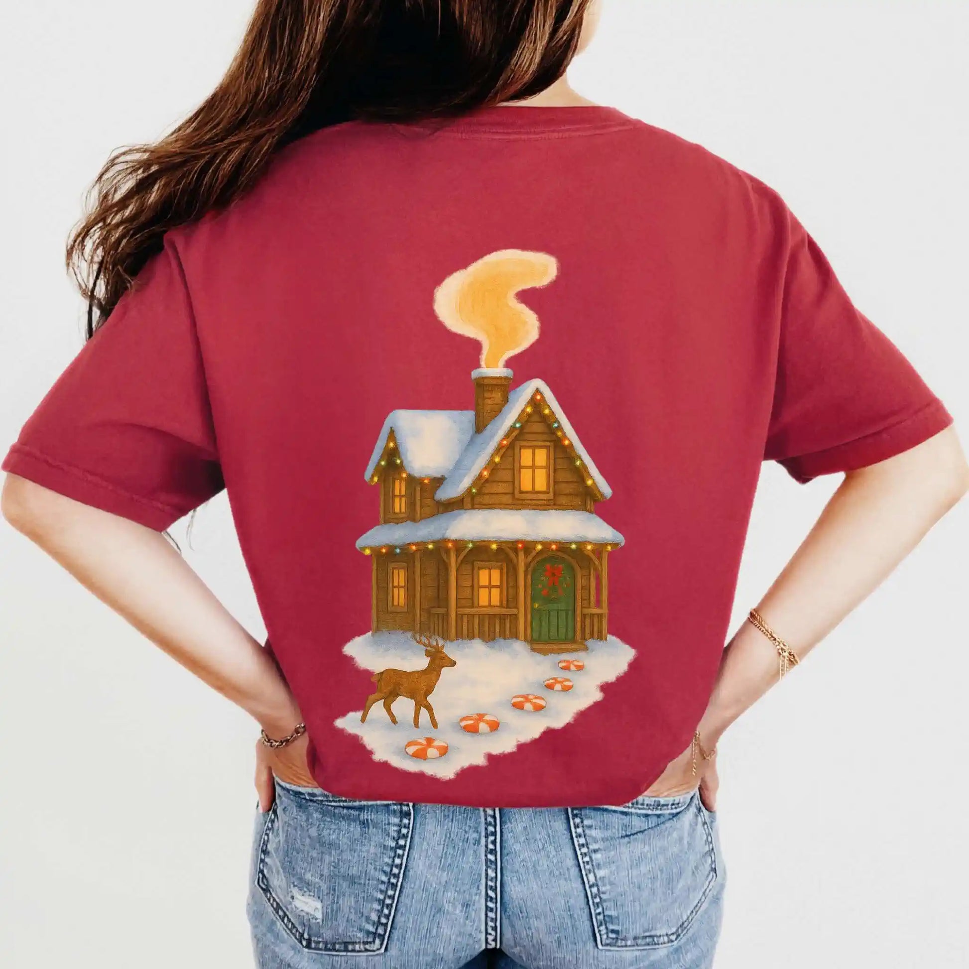 The front features the phrase “Home for the Holidays,” while the back showcases a snowy cabin adorned with glowing windows, twinkling lights, and a welcoming wreath — complete with a deer in the snowy yard. This front-and-back t-shirt makes a cozy choice for family gatherings, winter outings, or holiday movie nights.