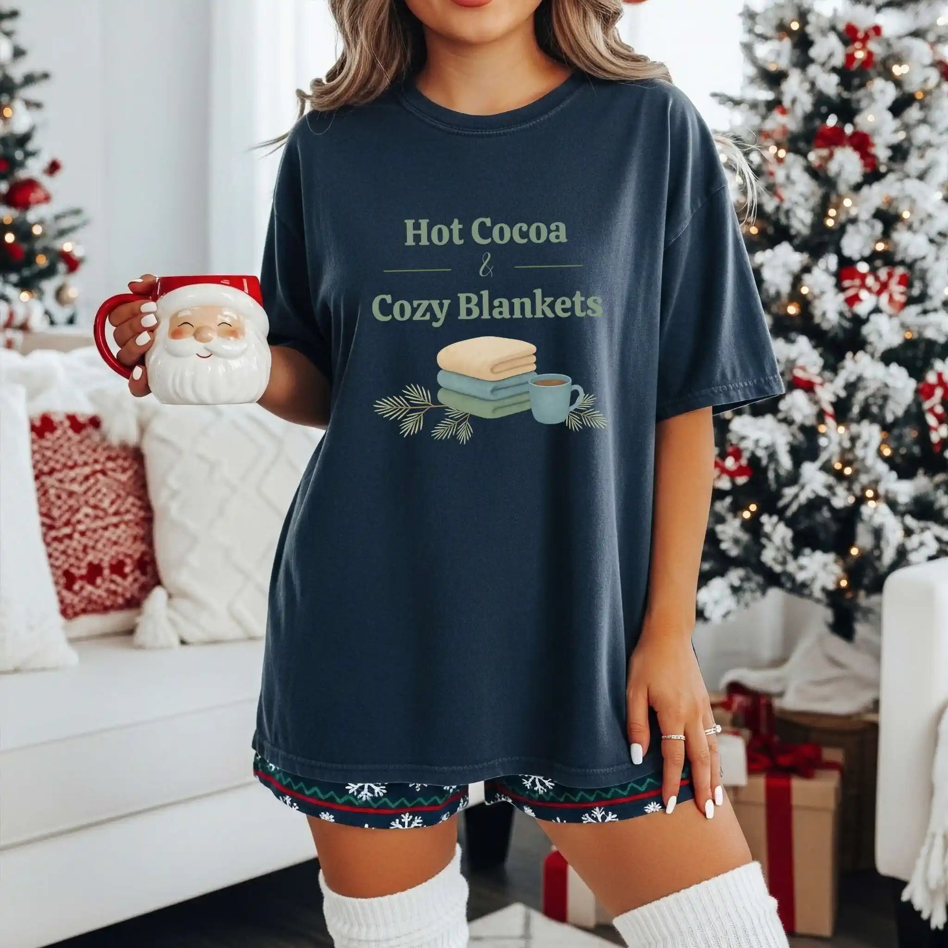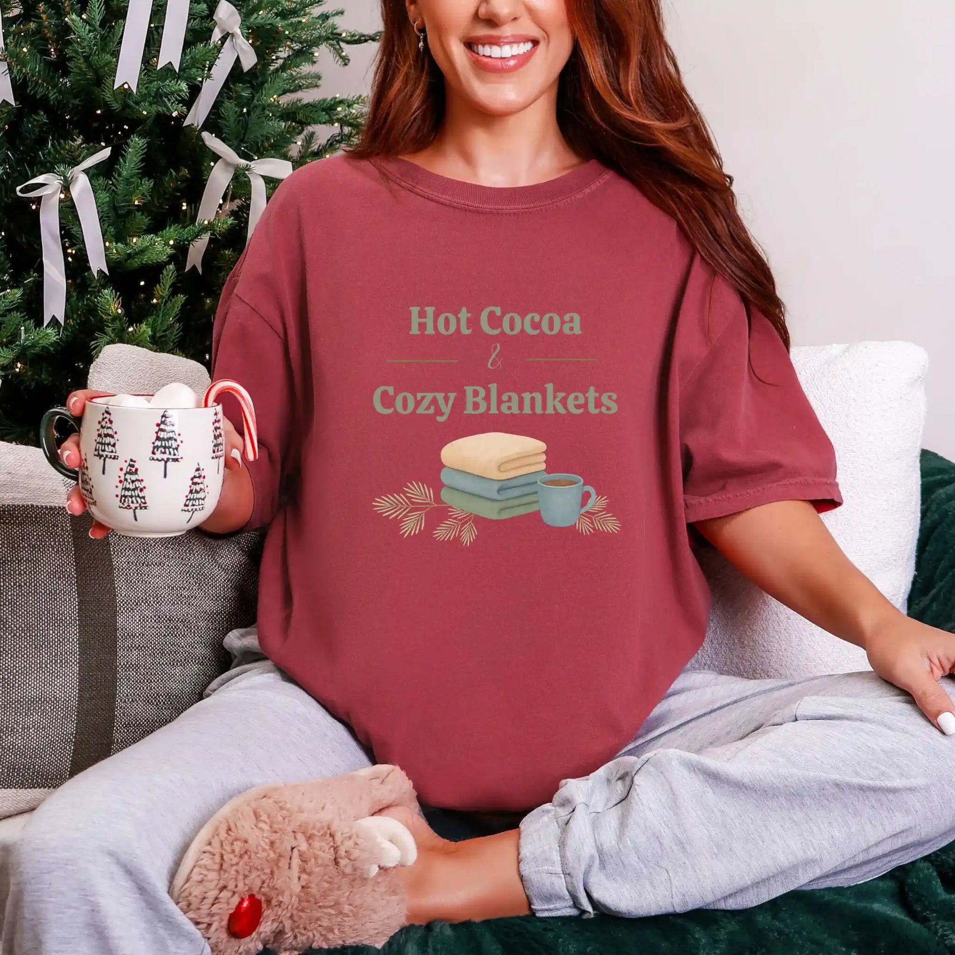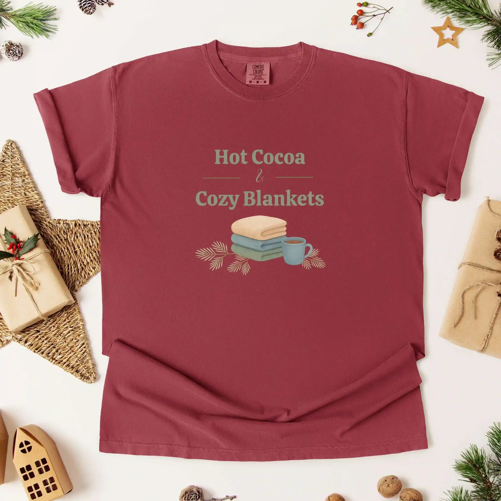 The front graphic showcases neatly folded blankets, pine sprigs, and a steaming cup of cocoa beneath the phrase “Hot Cocoa & Cozy Blankets.” Printed on a t-shirt with a centered front design, it’s a go-to piece for cold days, festive movie marathons, and fireside lounging.