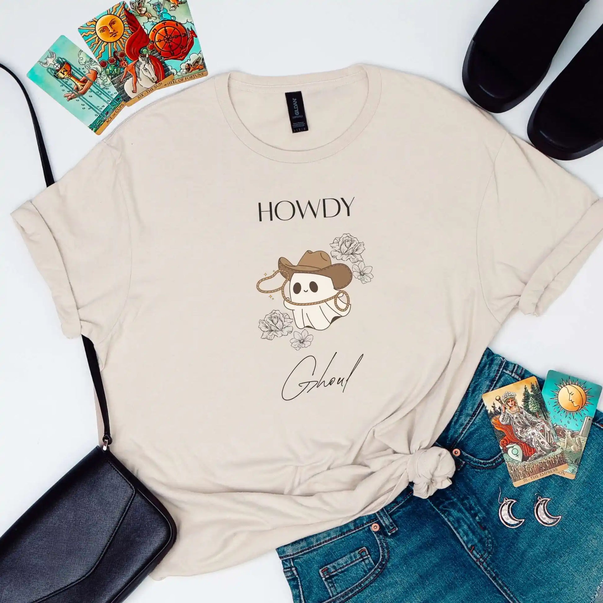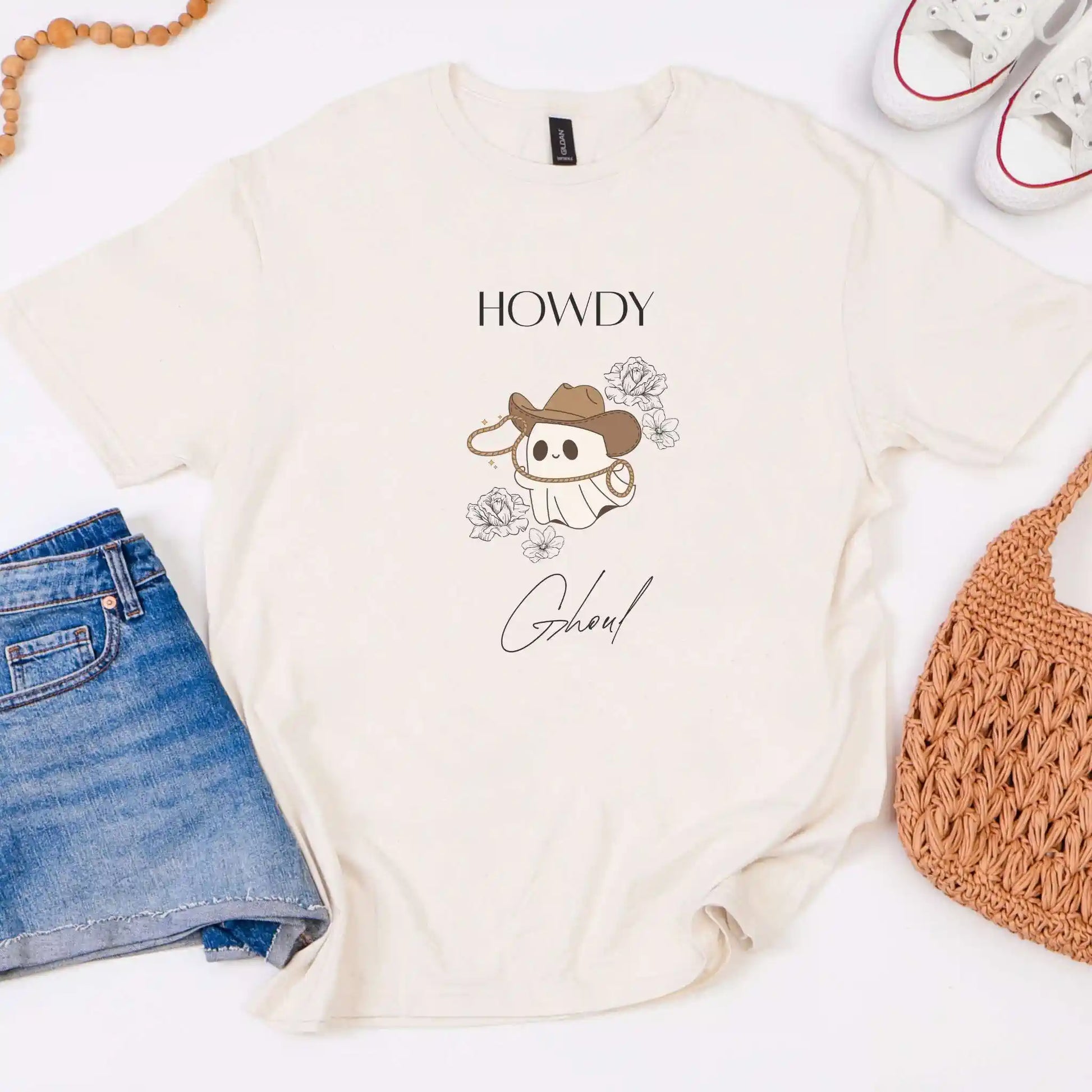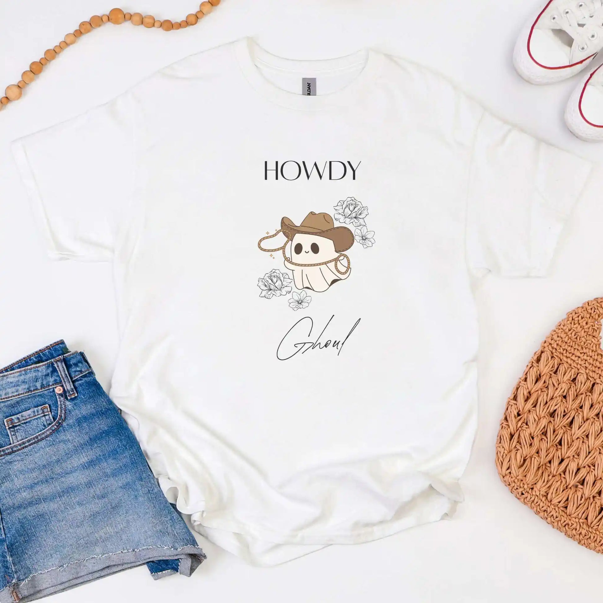 Express your unique style with our fun 'Howdy Ghoul' t-shirt. This charming front design features a delightful ghost in a cowboy hat and lasso, perfectly blending Western spirit with a touch of spooky fun.