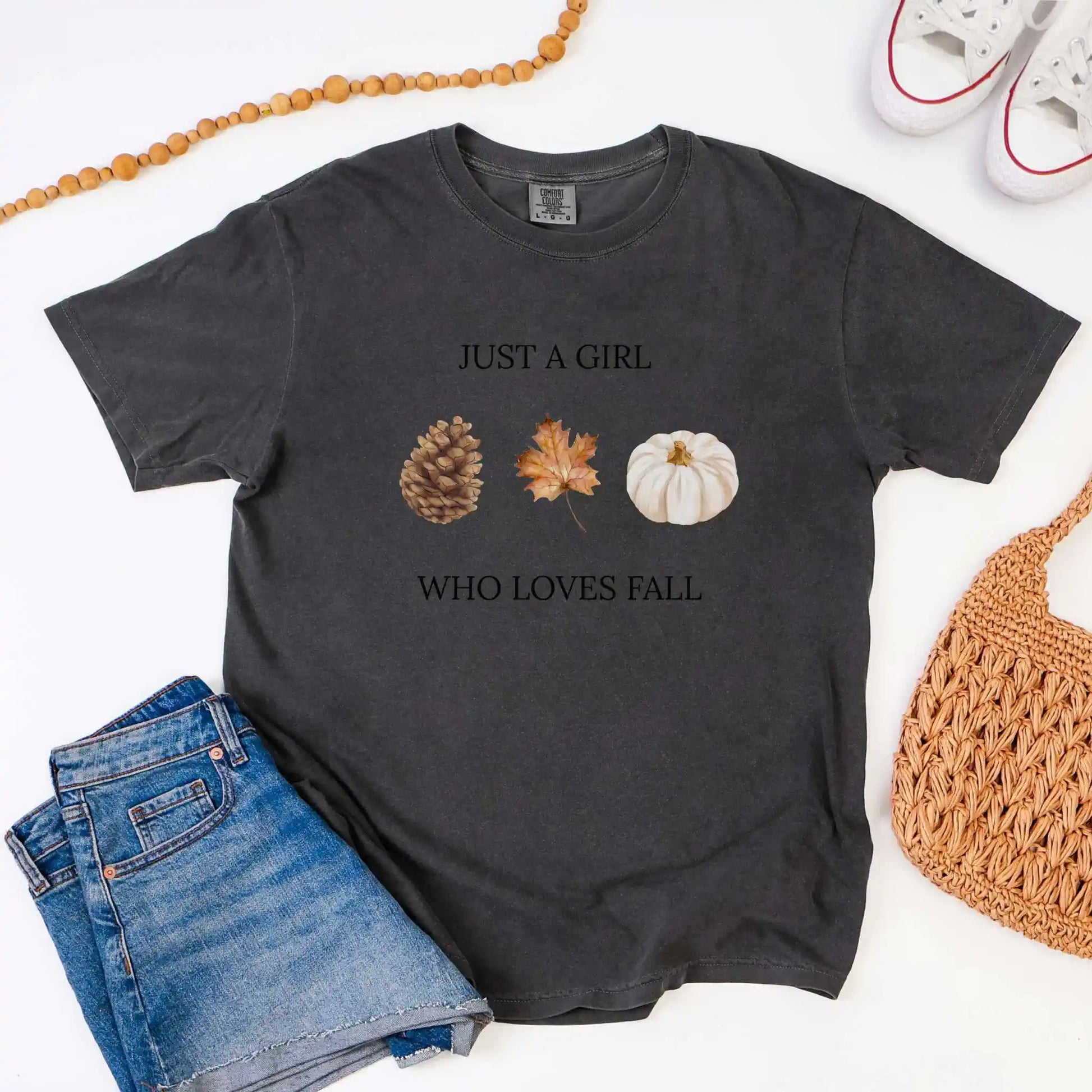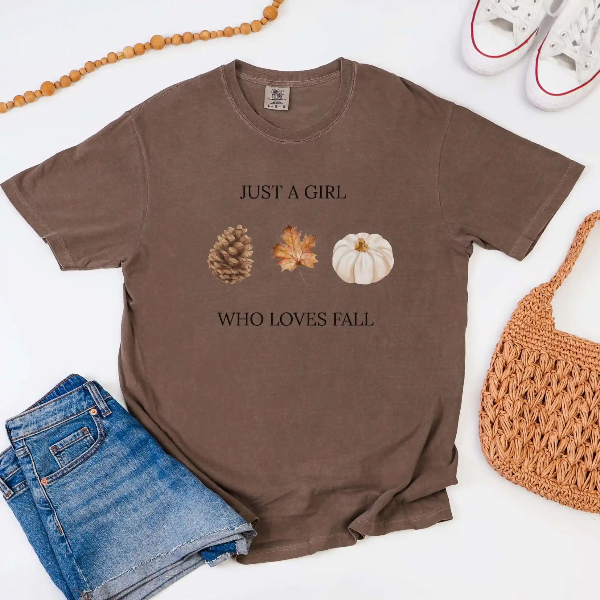 The front graphic features the text “Just a Girl Who Loves Fall” paired with warm illustrations of a pinecone, autumn leaf, and cream pumpkin. Centered on the front of a t-shirt, this design makes a charming choice for pumpkin patches, hayrides, or casual fall days with friends.