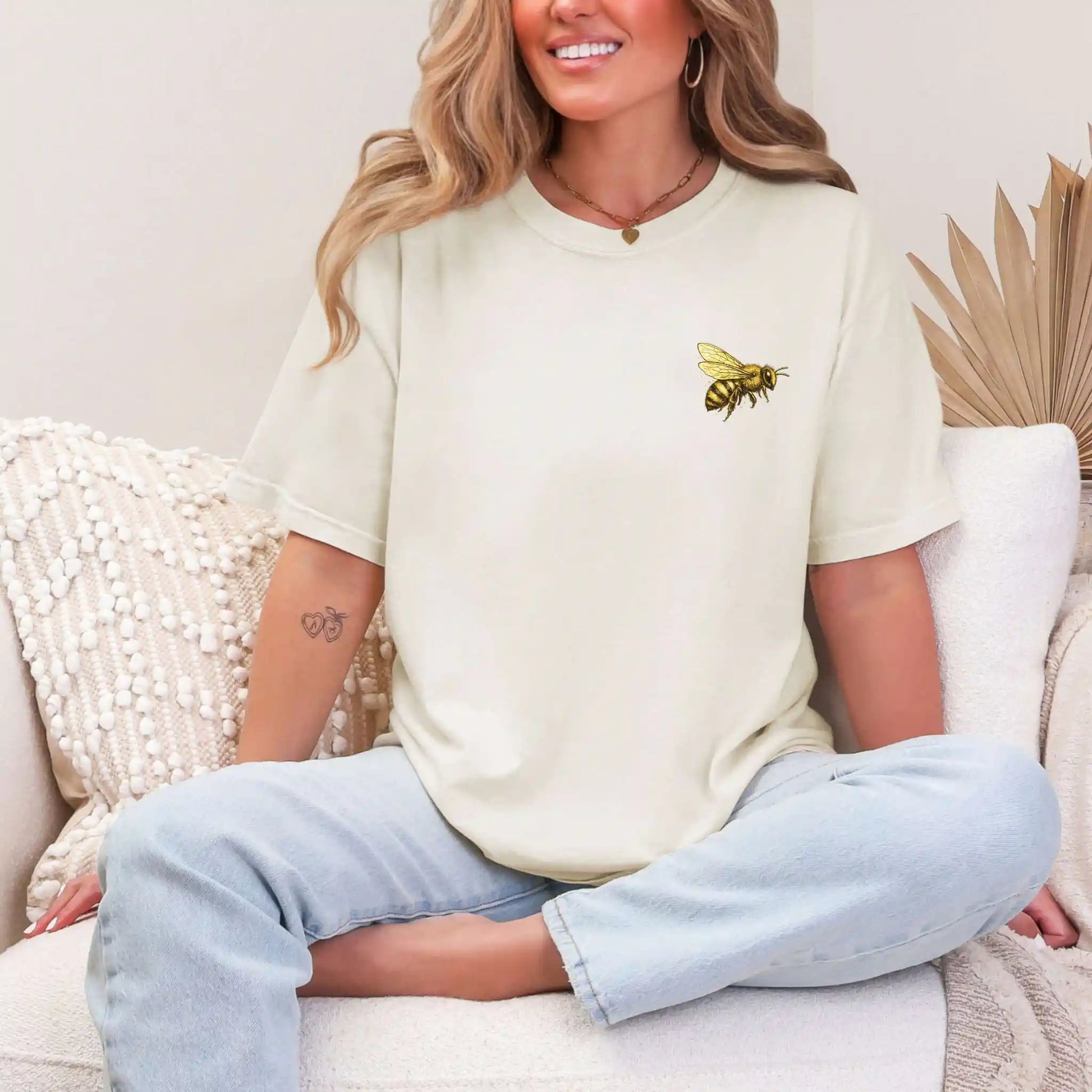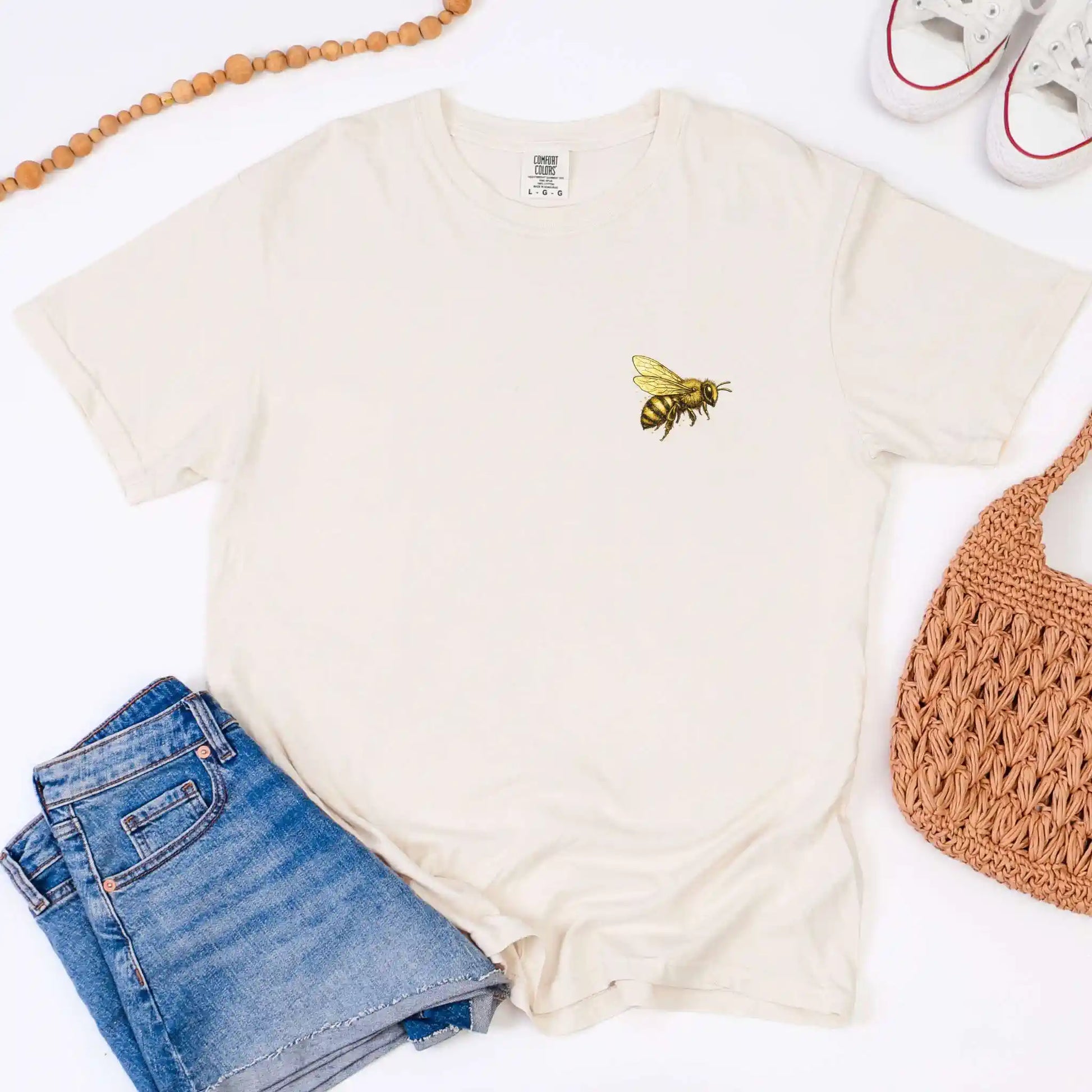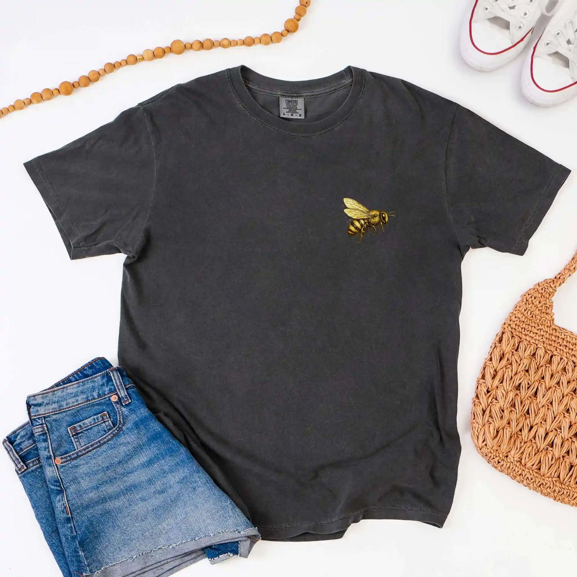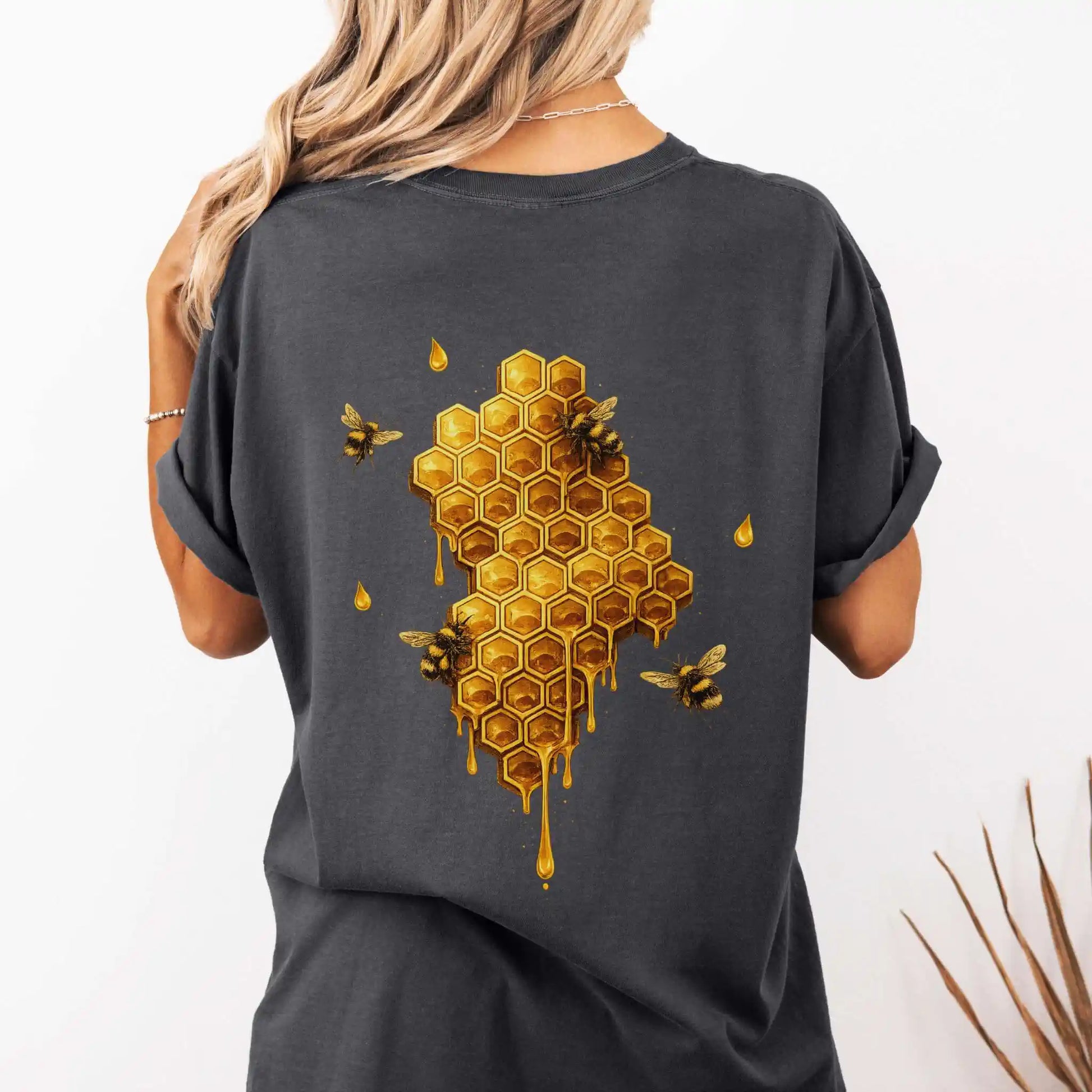 The back design features a detailed honeycomb formation with bees in motion, accented by flowing honey and organic texture that creates depth and warmth. A small bee graphic appears on the front pocket area for a subtle, balanced detail. This front-and-back design is printed on a t-shirt and carries a calm, rooted energy.