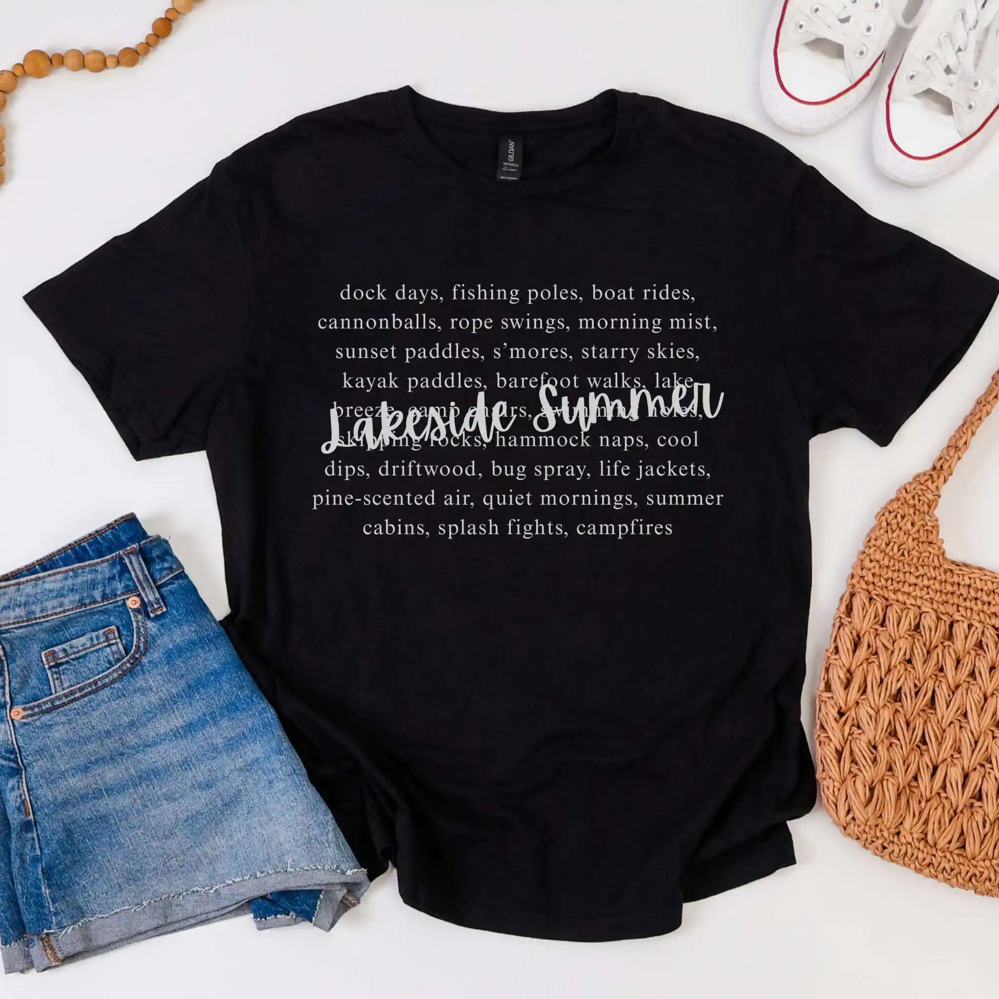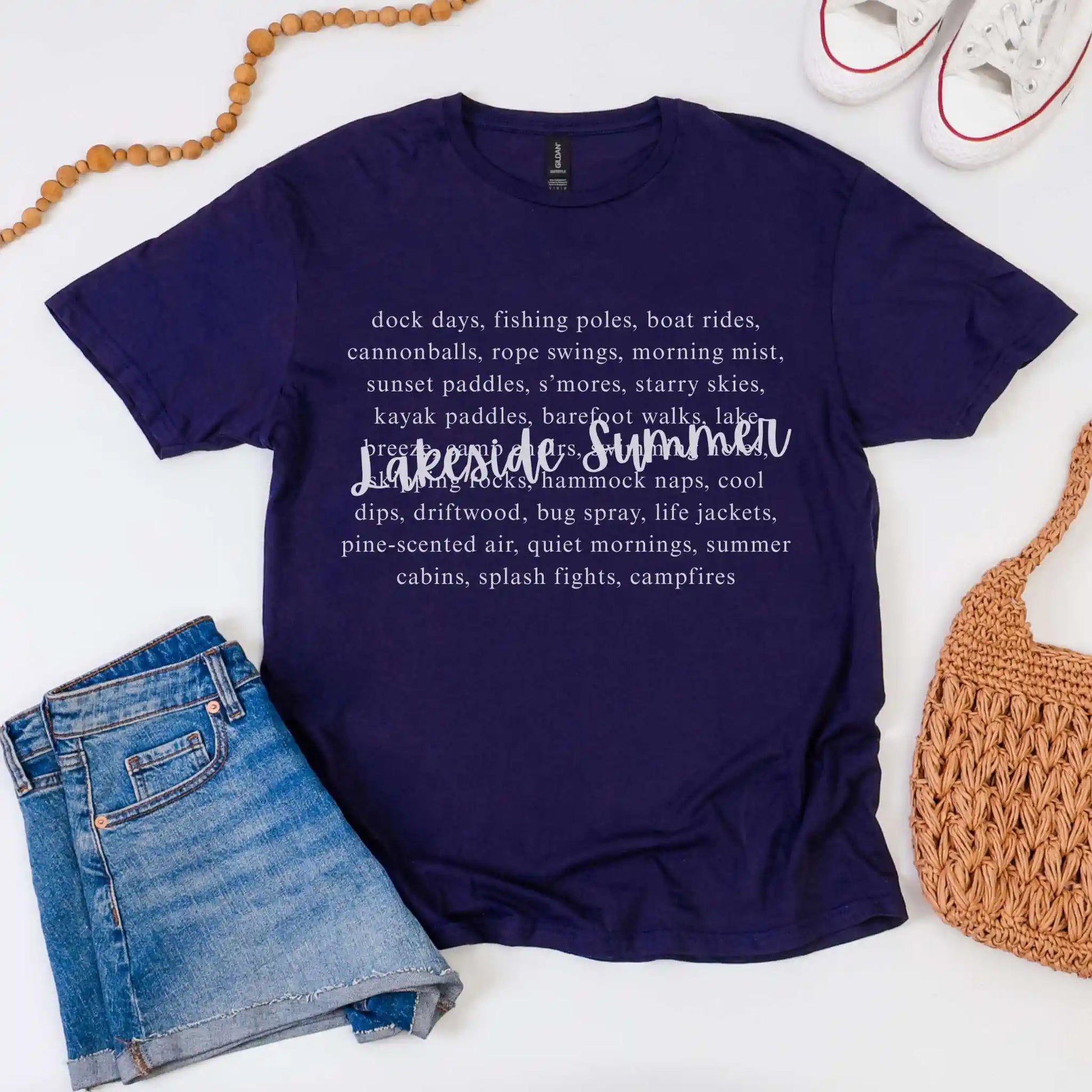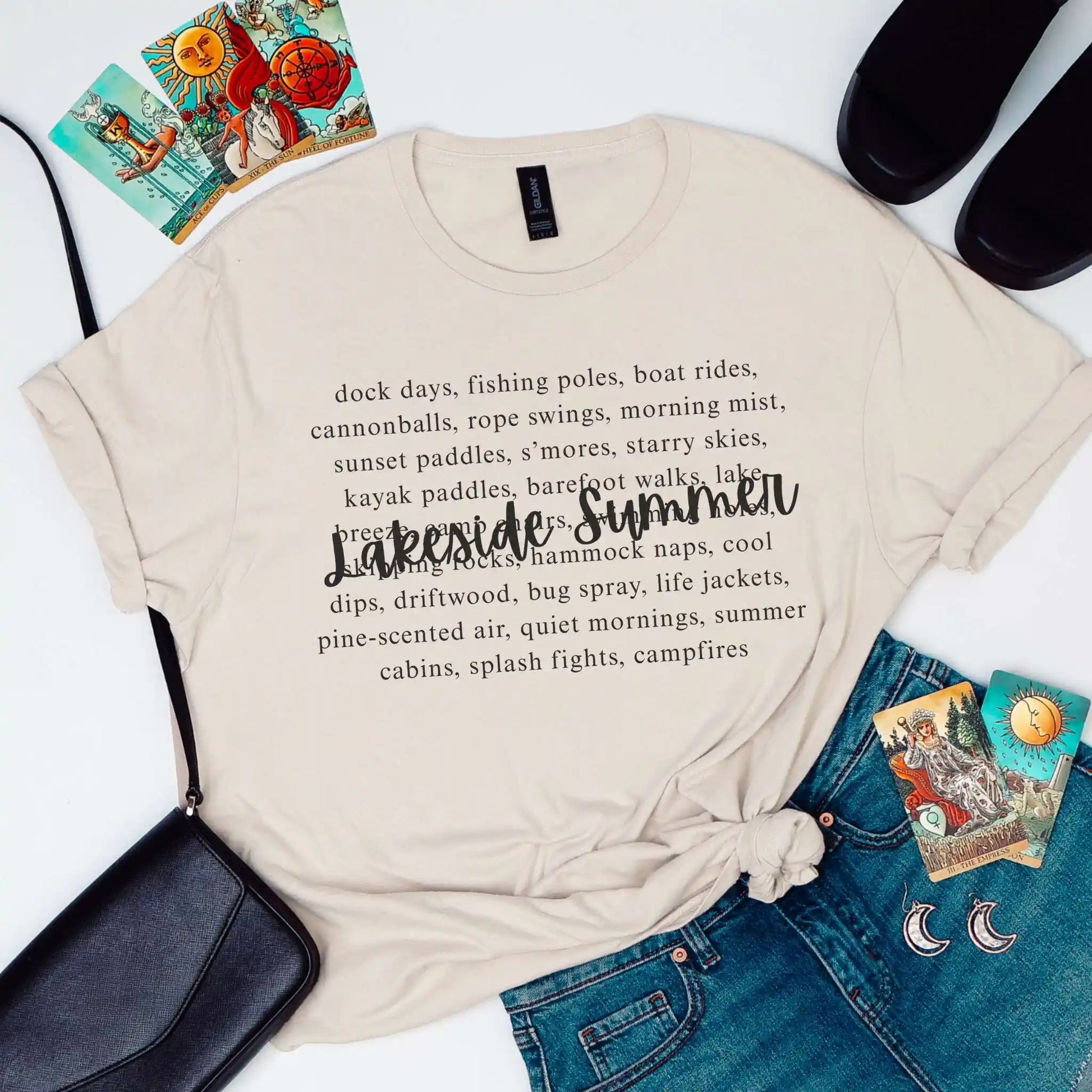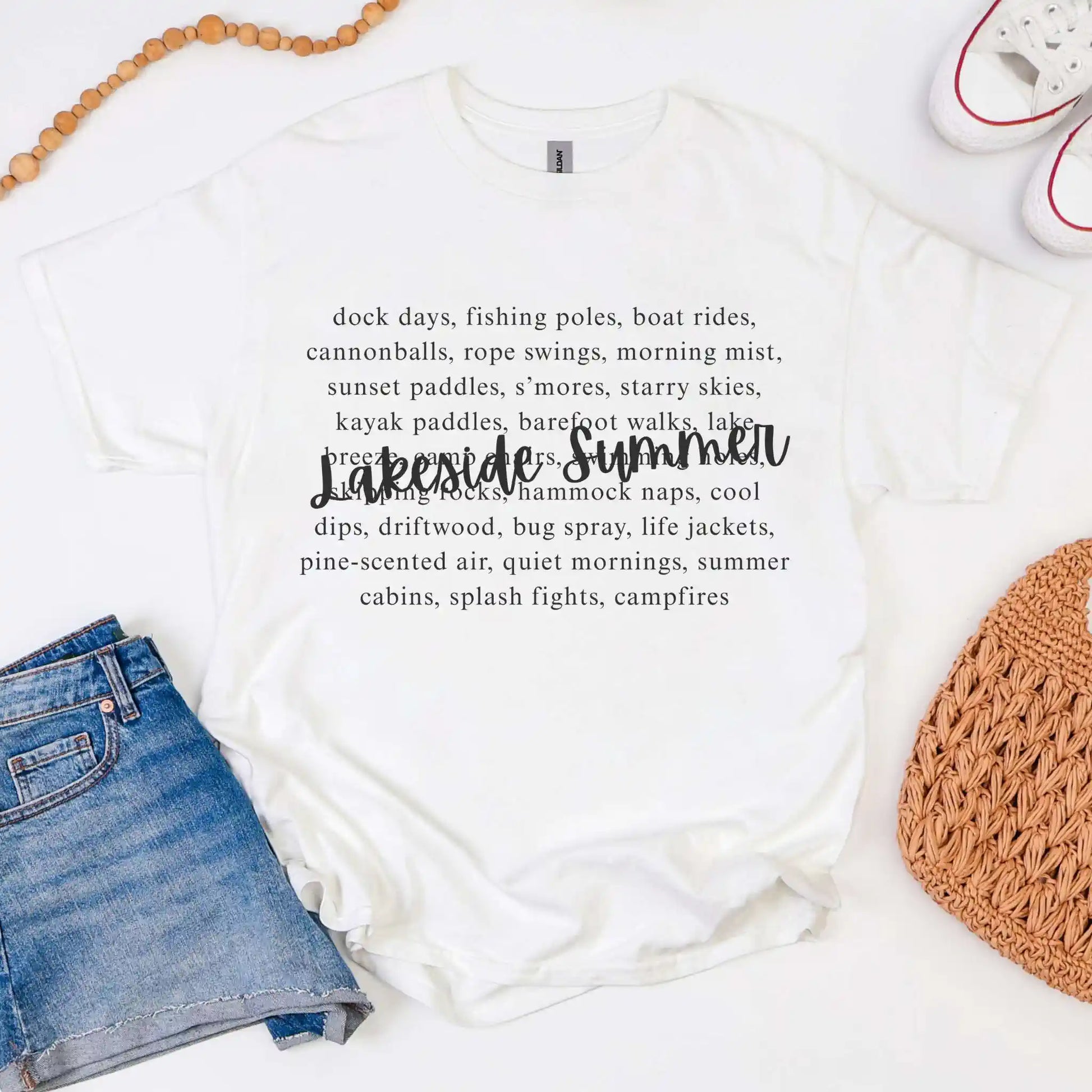 The design features a list of dreamy summer words like dock days, barefoot walks, and bug spray, layered behind the hand-lettered phrase Lakeside Summer in bold script. A visual time capsule for those slow, joy-filled days by the lake.