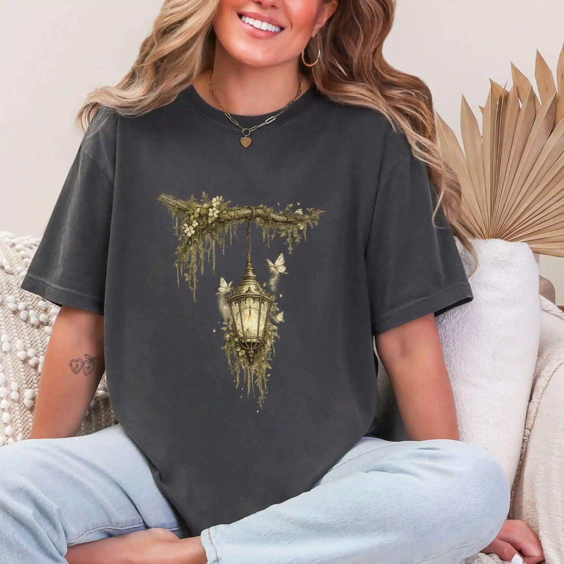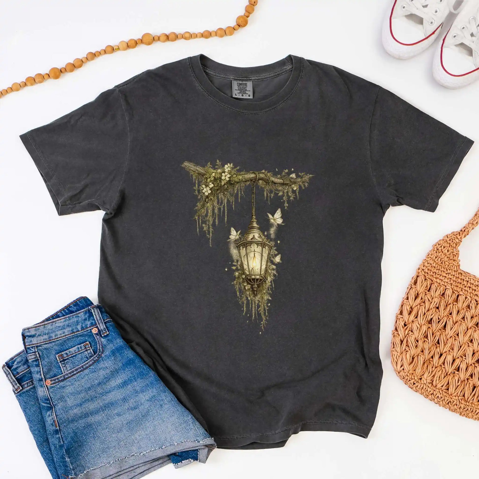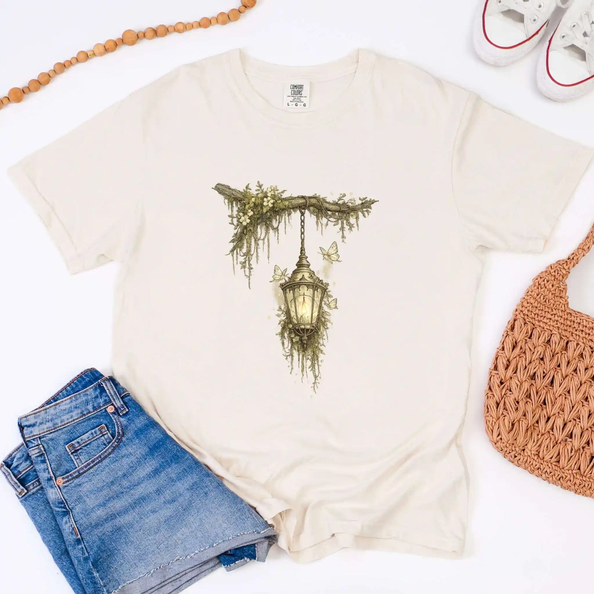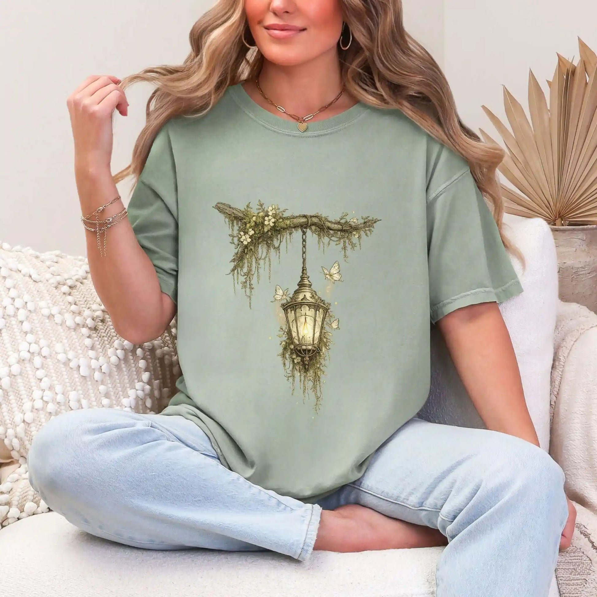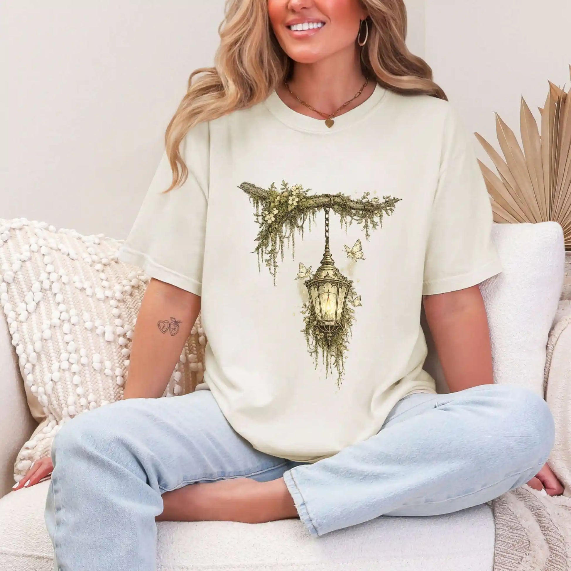 The centered front design showcases a vintage lantern draped in greenery and blossoms with delicate butterflies nearby. Ideal for forest walks and reflective evenings.