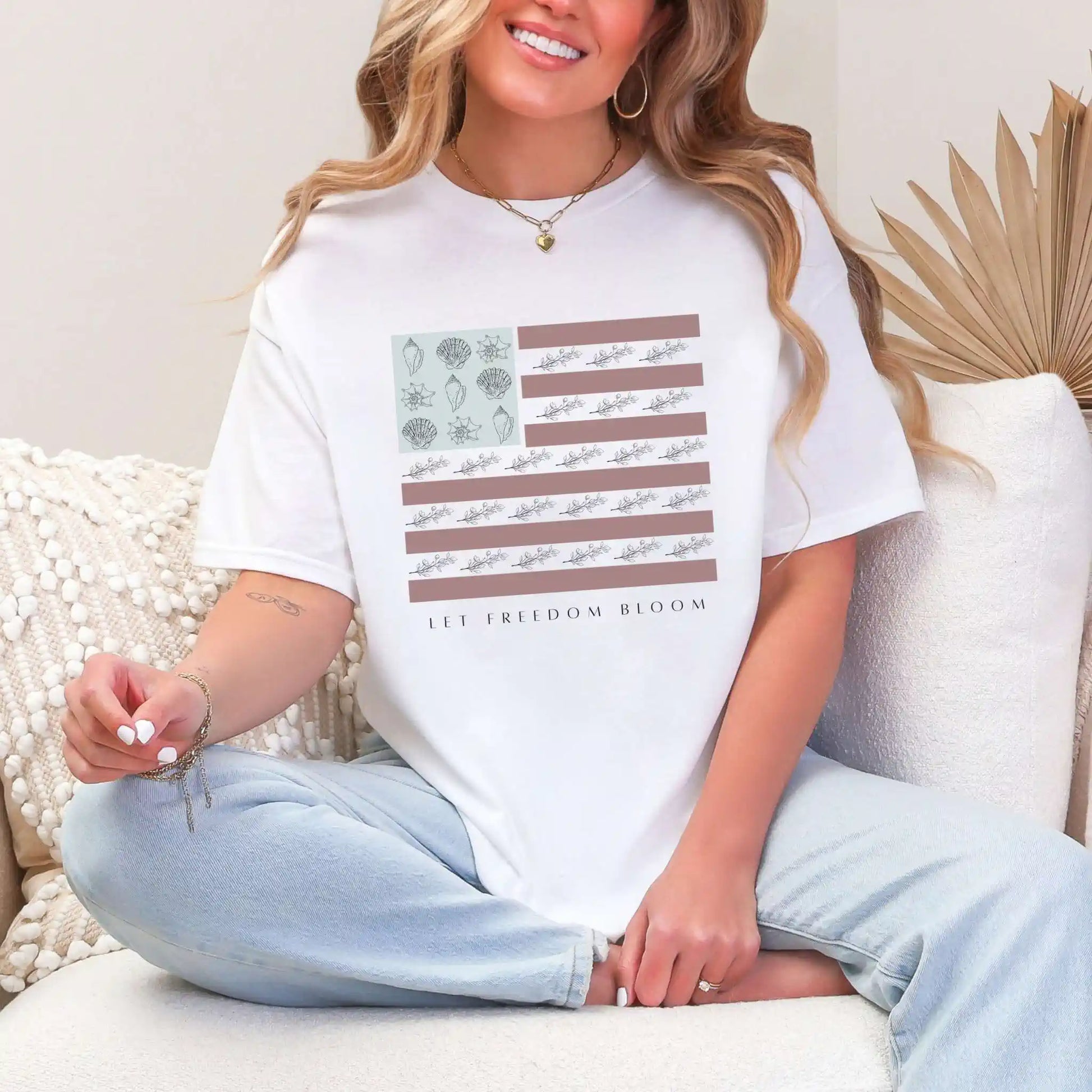 Featuring a front design of an artistic rendition of the American flag, where elegant floral sprigs form the stripes and charming conch and scallop shells replace the stars. This t-shirt embodies the essence of "Let Freedom Bloom" with a refreshing coastal twist, ideal for your Fourth of July celebrations.