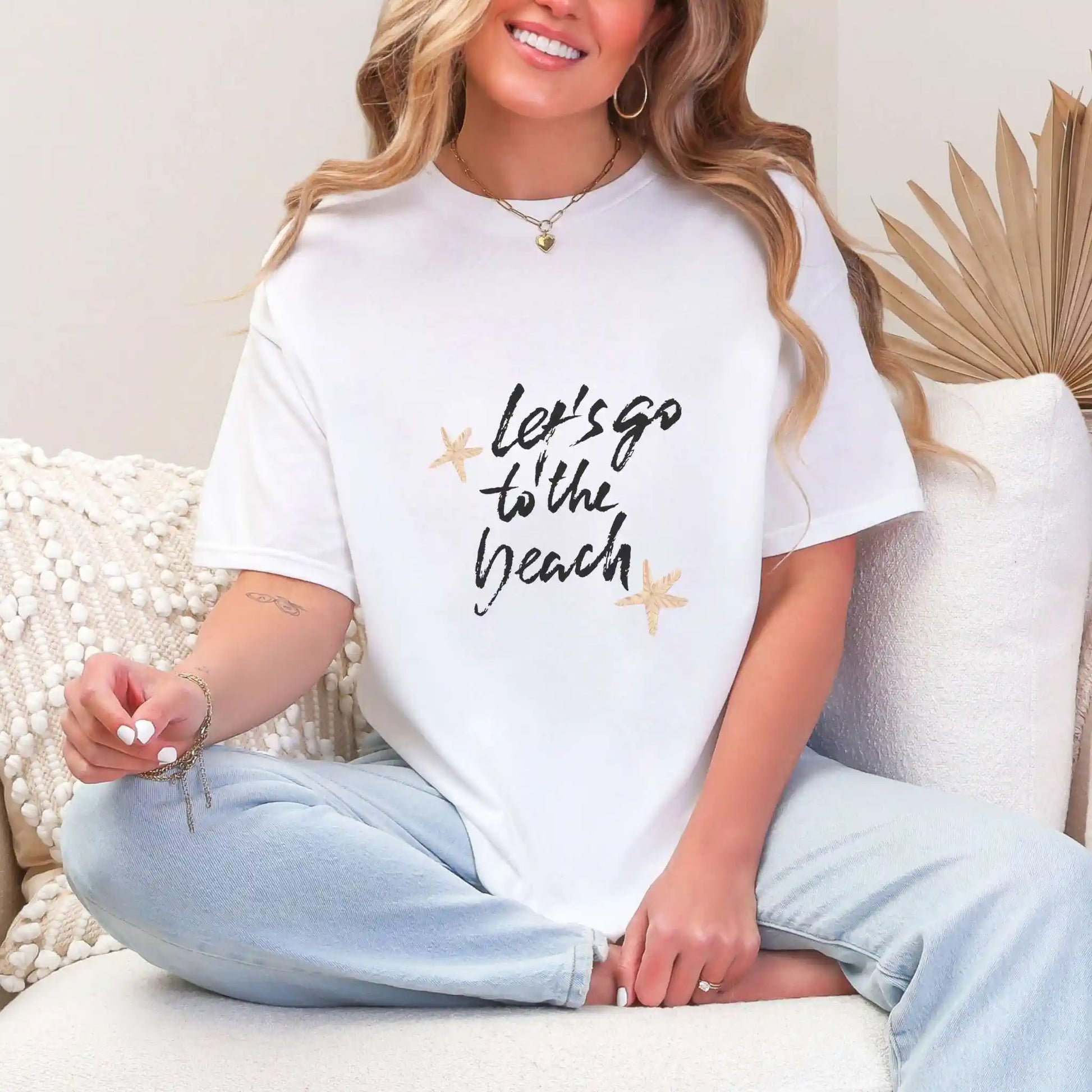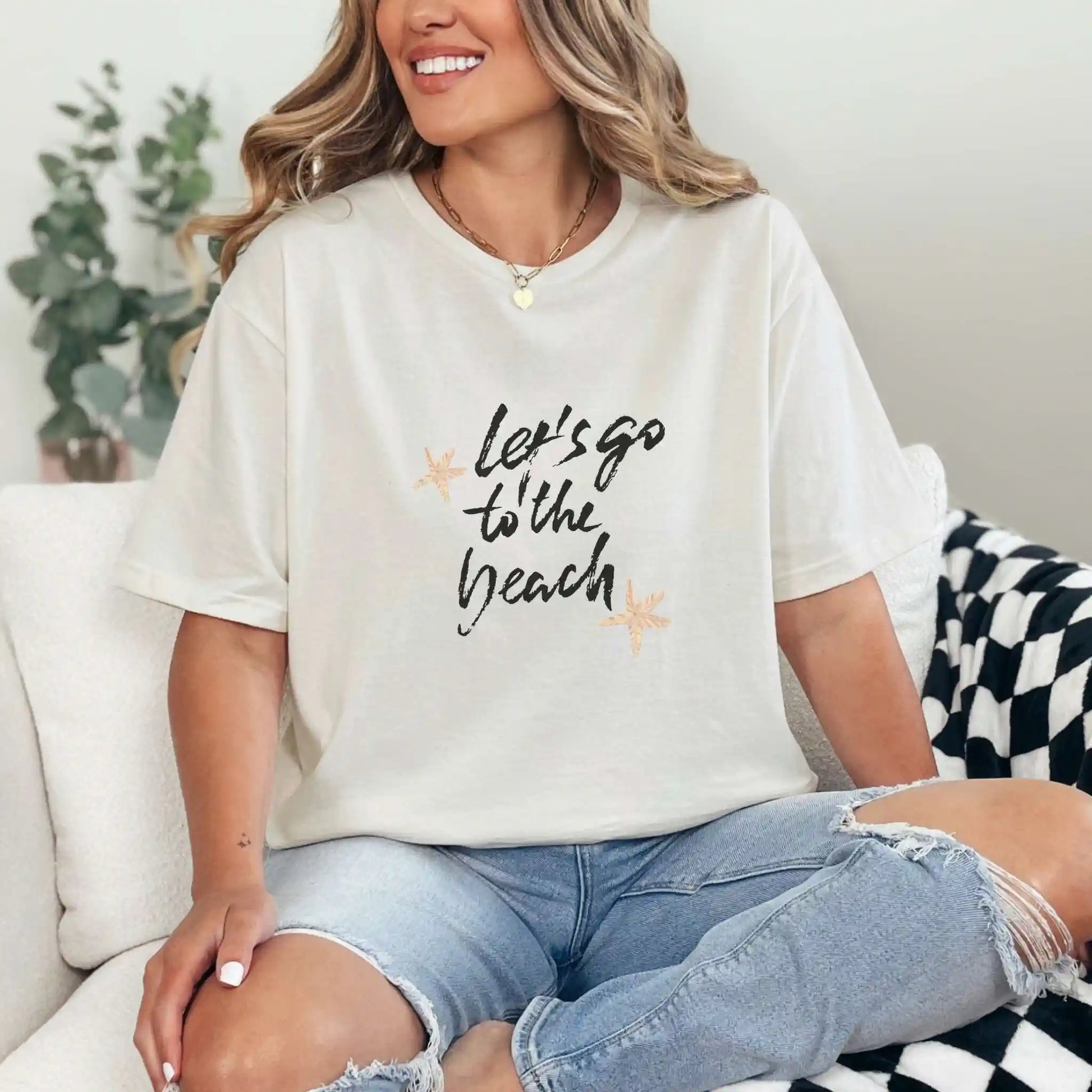 Features bold black brush lettering that reads “Let’s go to the beach,” accented with soft, hand‑drawn starfish in warm sandy tones. The contrast is striking and coastal‑cool — like a postcard from your happy place.