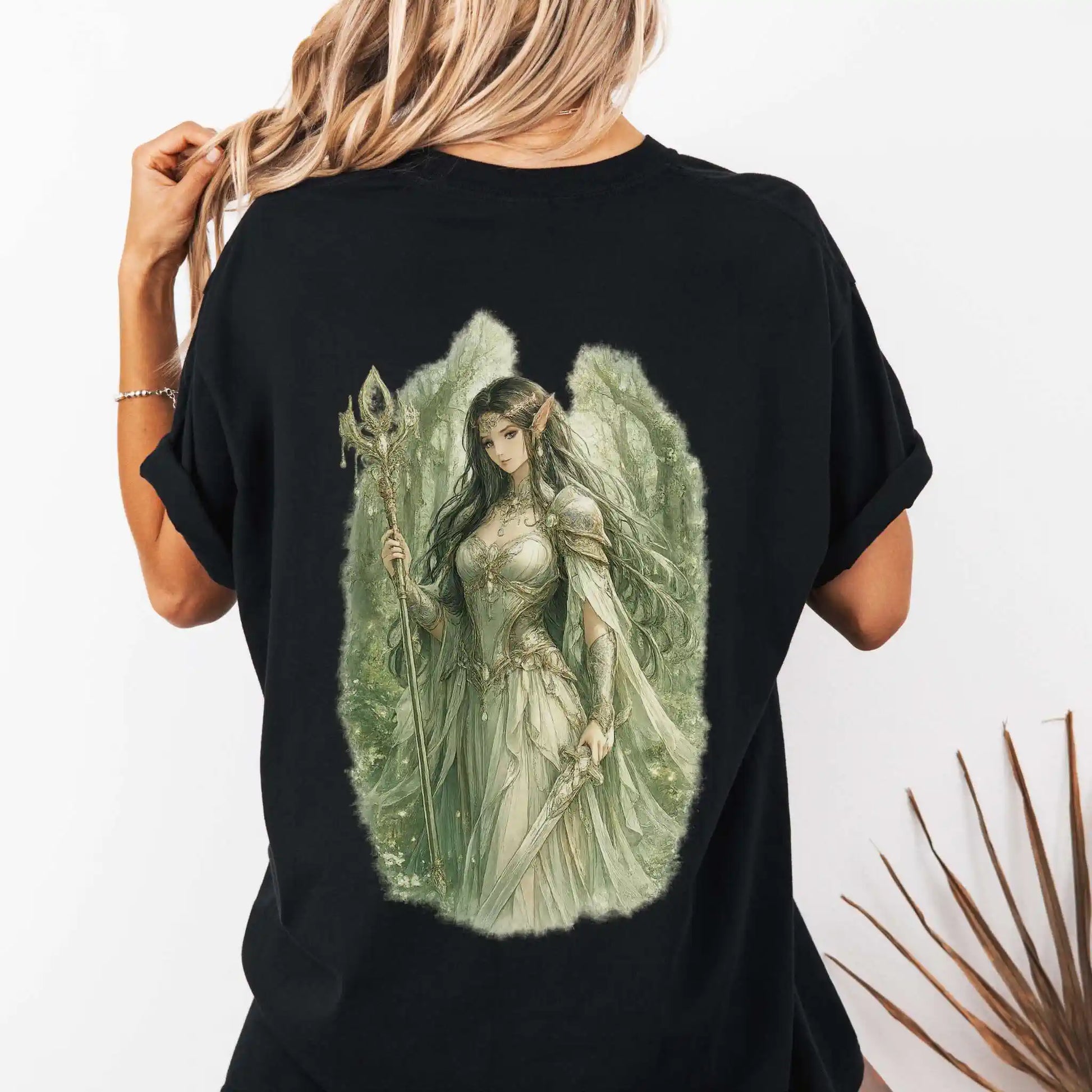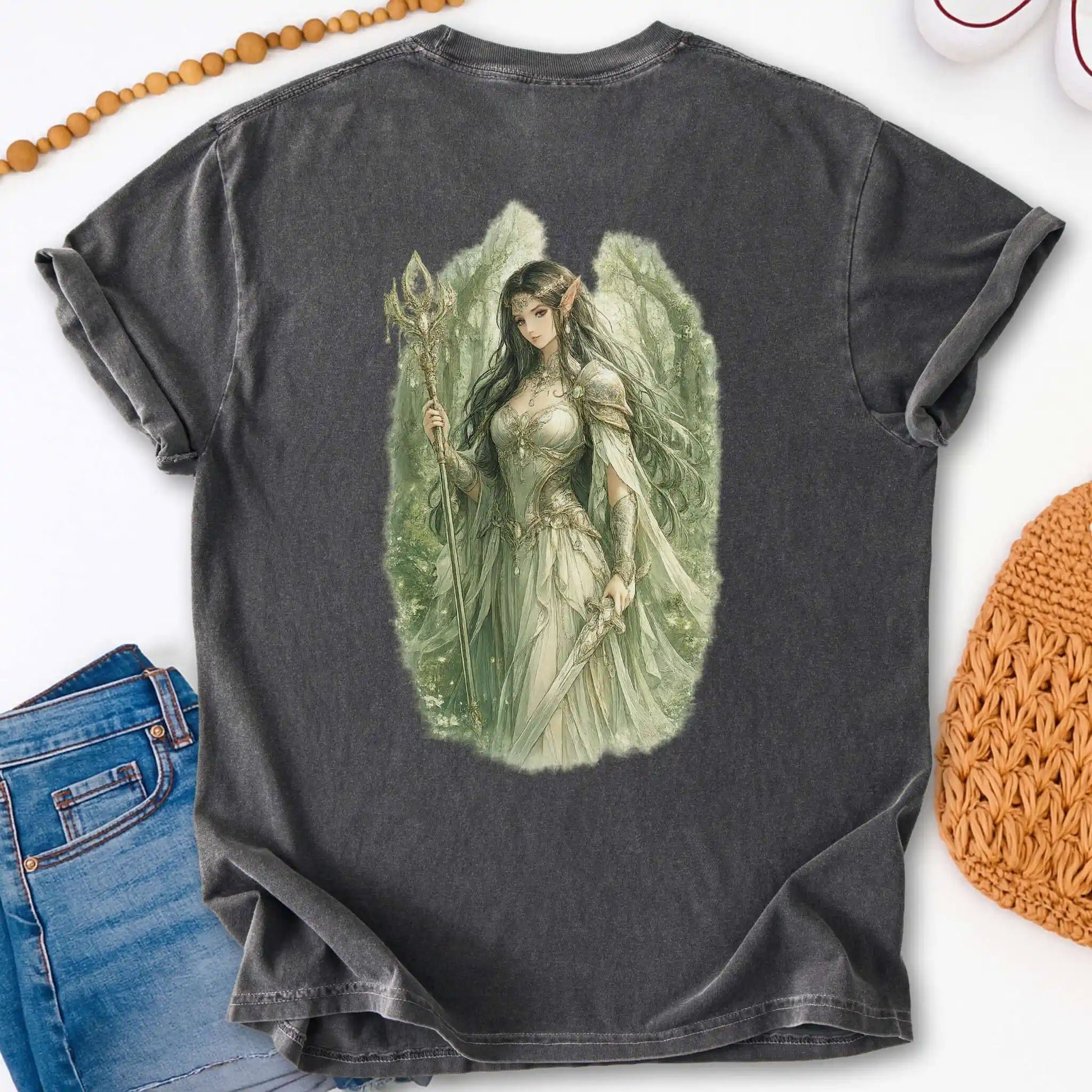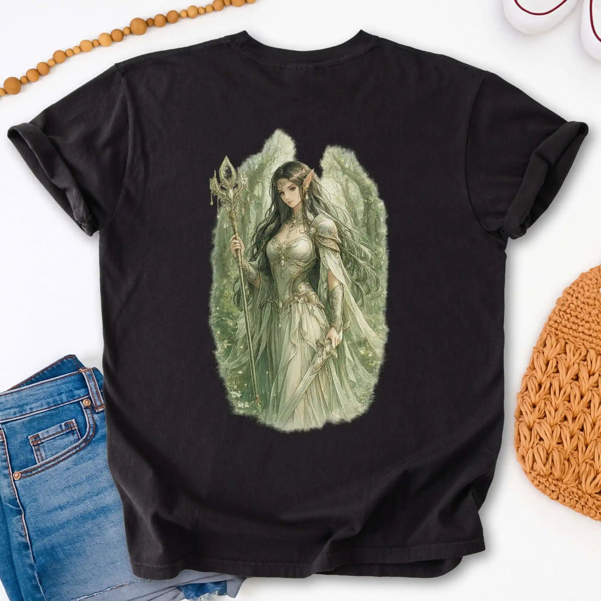 The back design features a detailed woodland guardian figure holding a staff and blade, illustrated in a soft, storybook style with flowing textures and natural elements. A coordinating graphic appears on the front pocket area of the shirt. This front-and-back design is printed on a t-shirt and conveys steady, grounded progress.