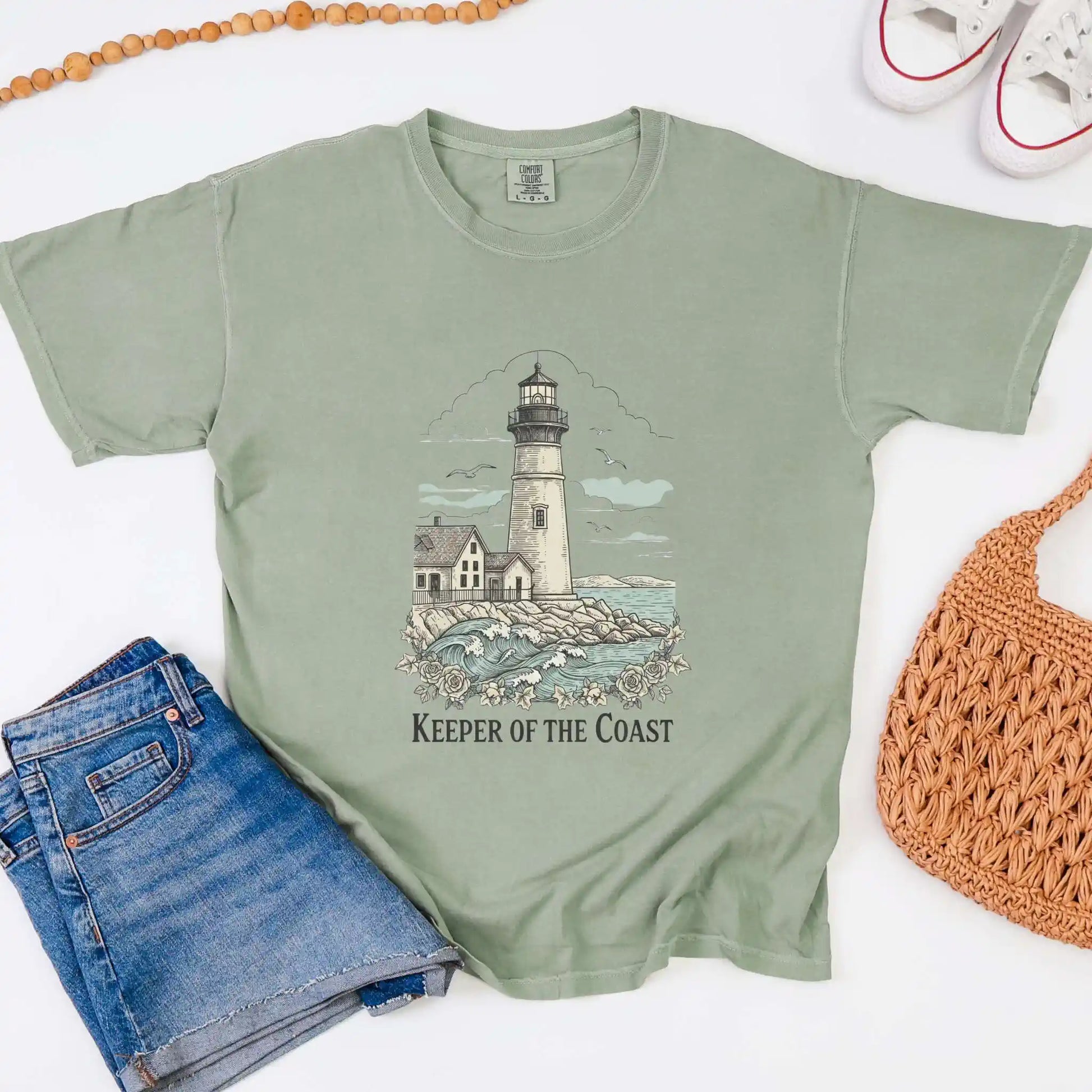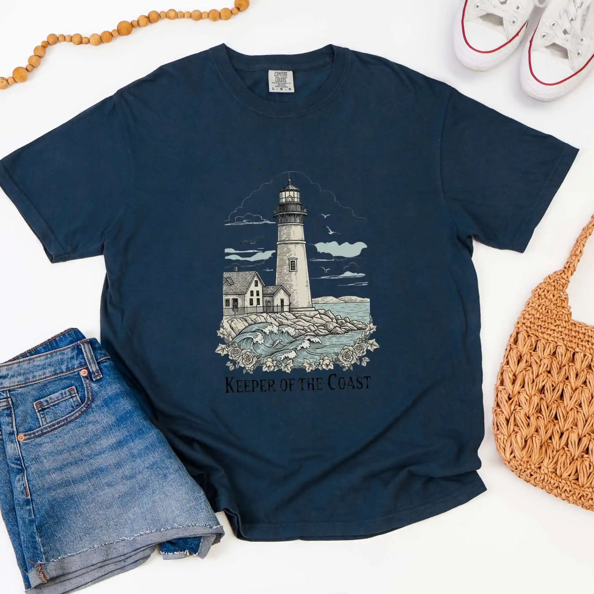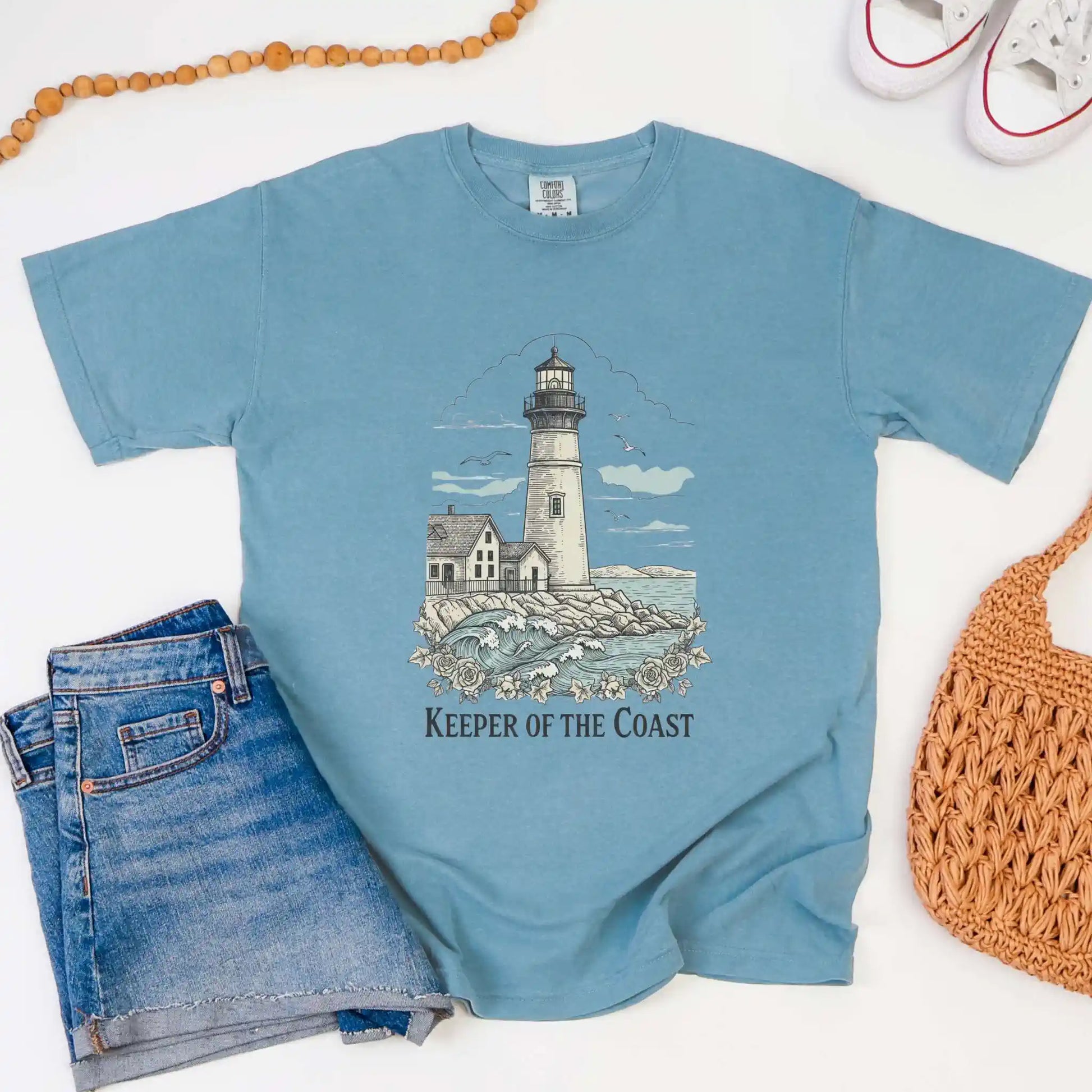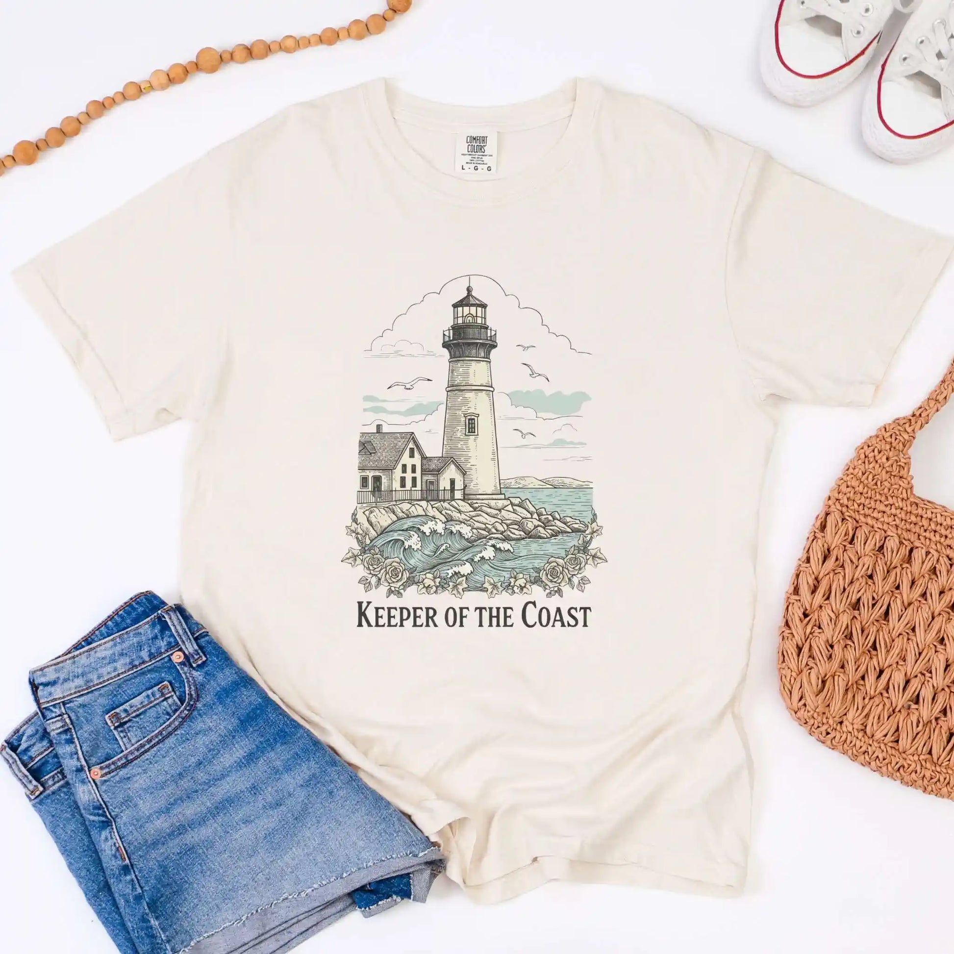 Features a front design of a lighthouse rising above rocky shores, framed by soft roses and crashing waves, with seagulls in flight. The phrase “Keeper of the Coast” anchors the artwork, making it ideal for beach wanderers, ocean dreamers, or anyone drawn to nautical style.