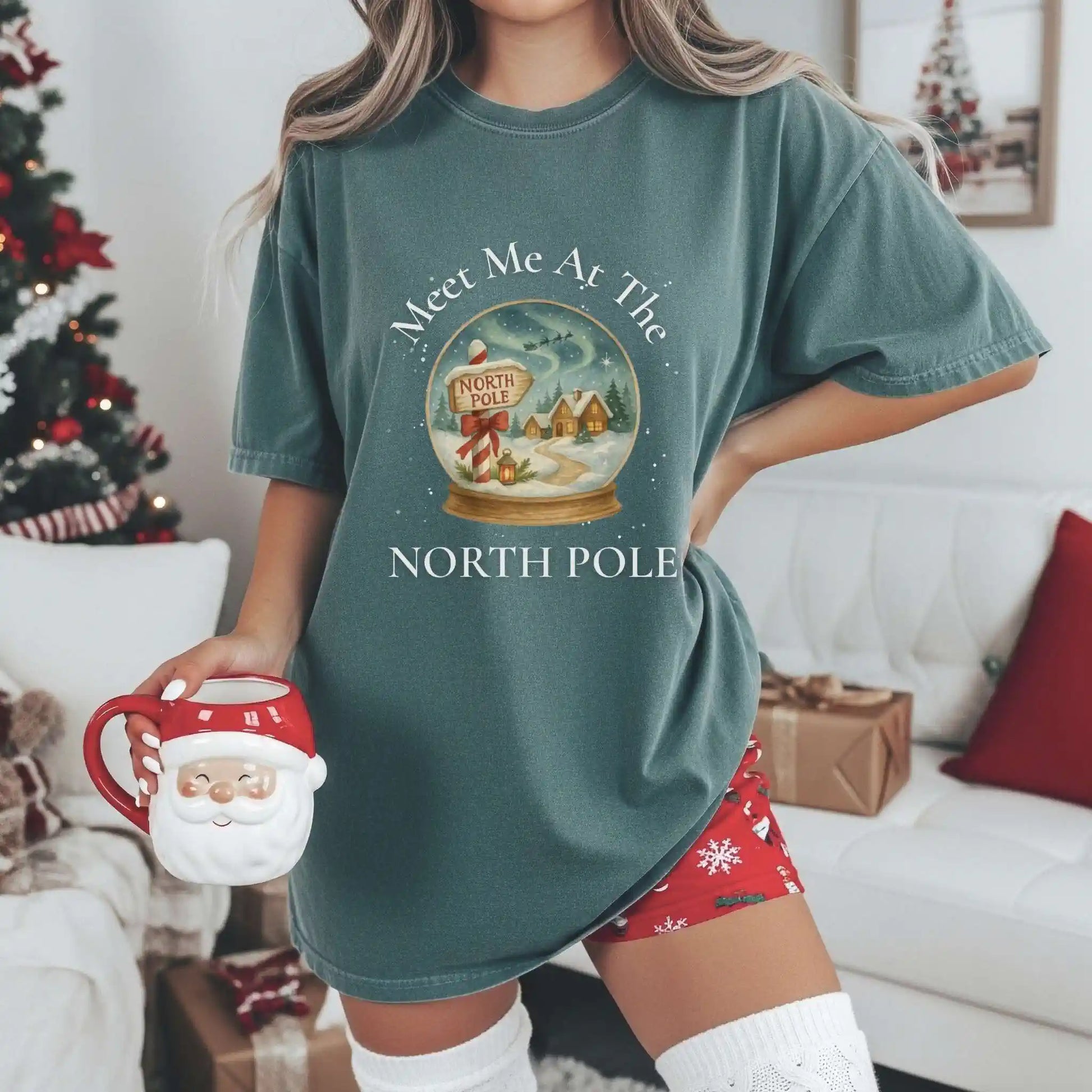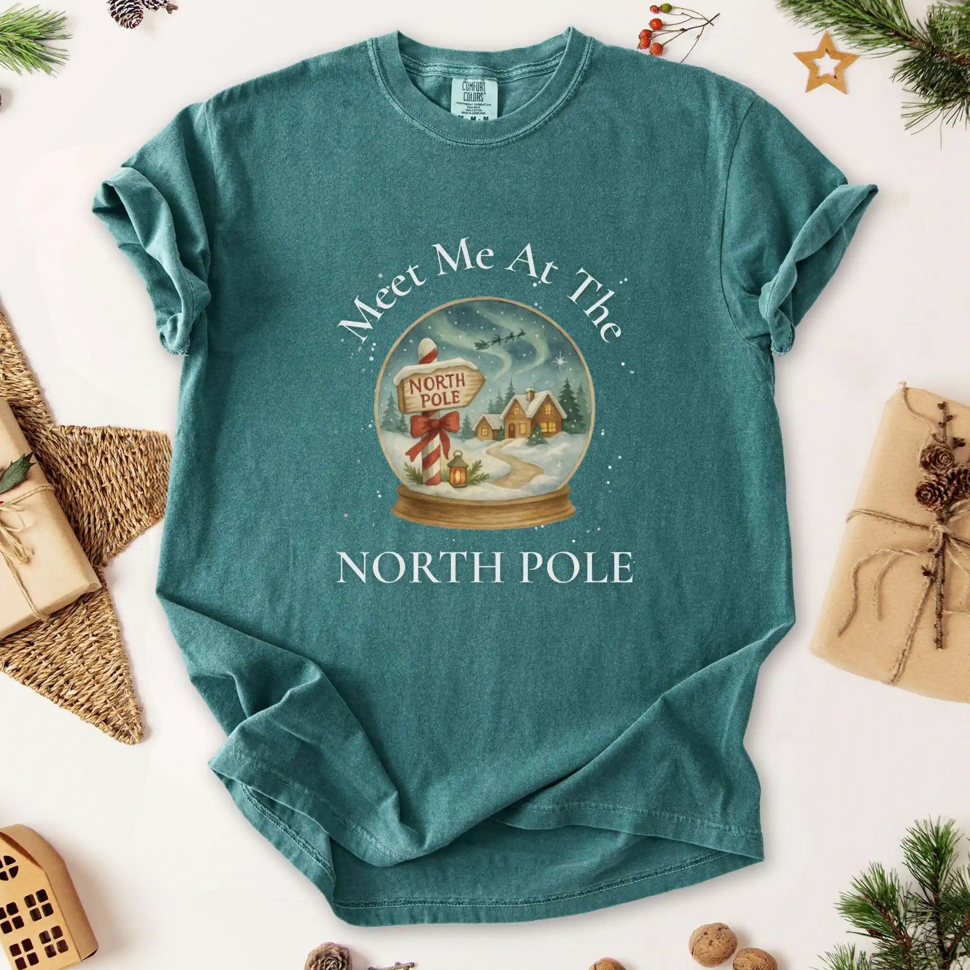 Features a snow globe-style illustration with a North Pole sign, glowing cottages, and a snowy path beneath the phrase “Meet Me At The North Pole.” Printed on the front perfect for tree farm adventures, cocoa dates, and cozy winter nights in.