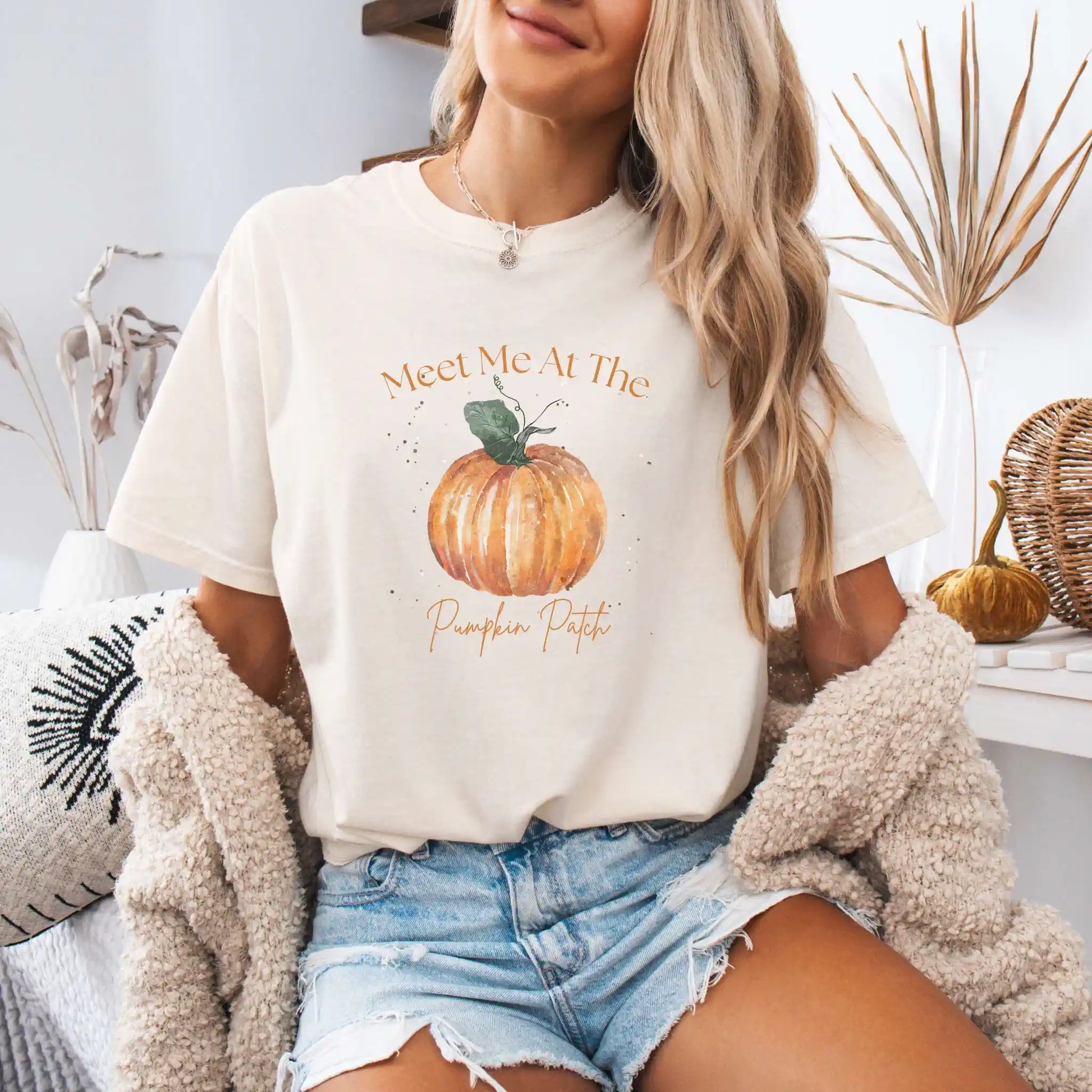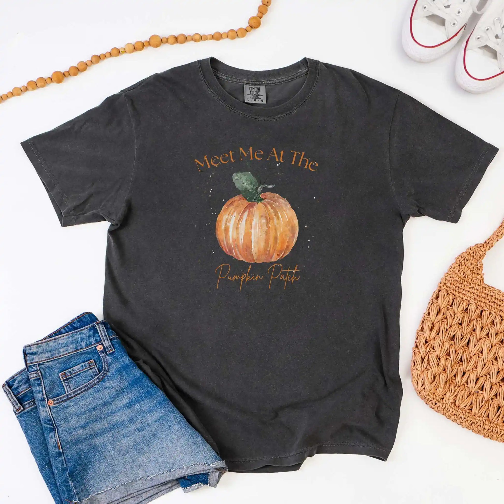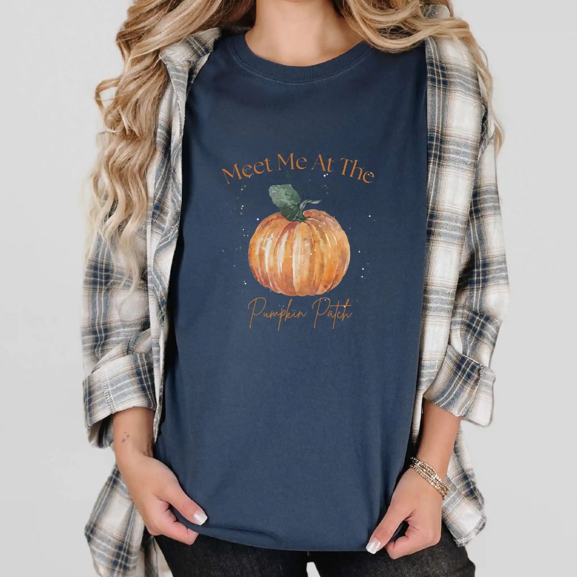 Design Details: A watercolor-style pumpkin anchors the words “Meet Me At The Pumpkin Patch” in whimsical lettering. Printed on the front of a soft t-shirt, it’s a festive staple for all your harvest adventures — from farmers’ markets to family photo days.