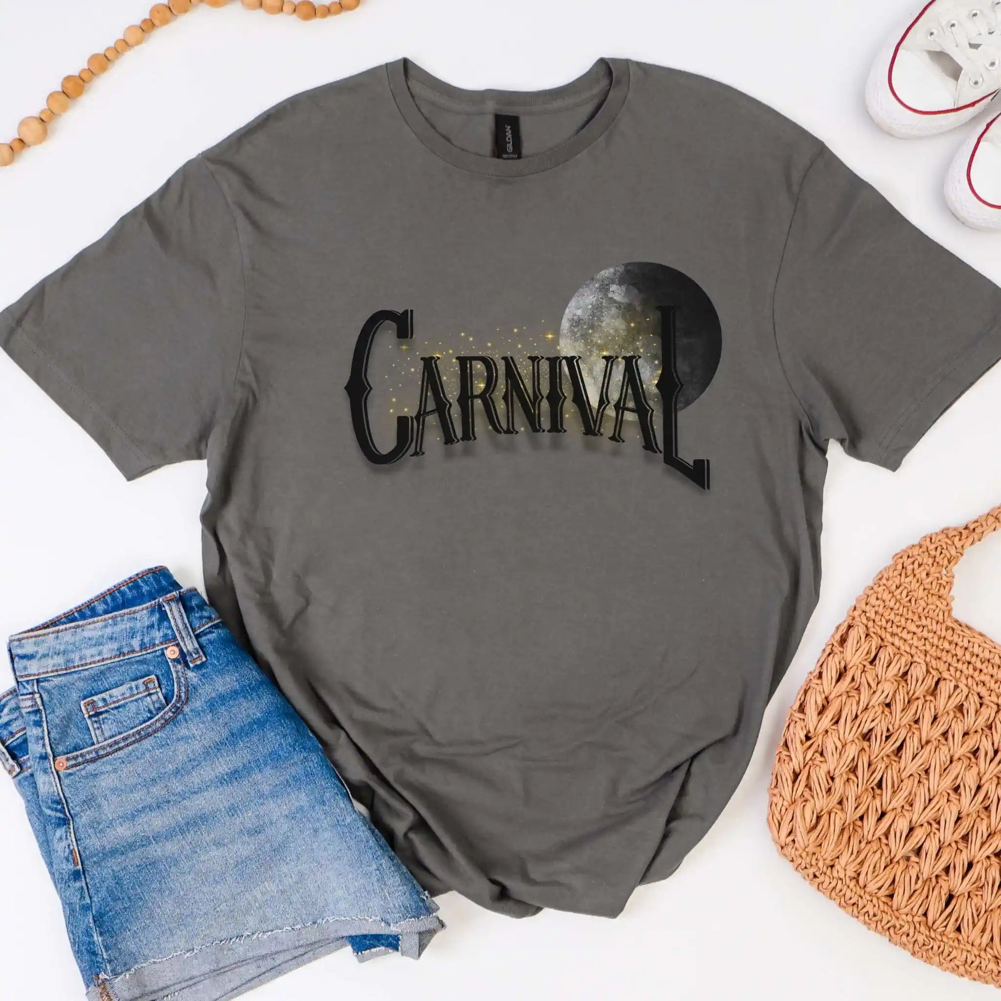 This dramatic front design features the word “CARNIVAL” in tall vintage lettering, arching across a black-and-white moon backdrop with scattered golden sparkles. It's haunting yet playful, like a forgotten fairground at midnight.