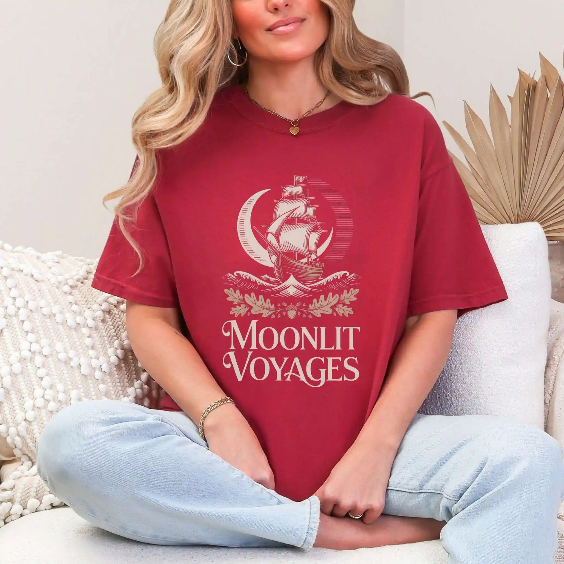 Features a front design of a tall ship sailing across waves, framed by a crescent moon and accented with oak leaves and acorns. The phrase “Moonlit Voyages” completes this timeless nautical look, perfect for coastal evenings, seaside getaways, or those who dream of journeys beyond the horizon.