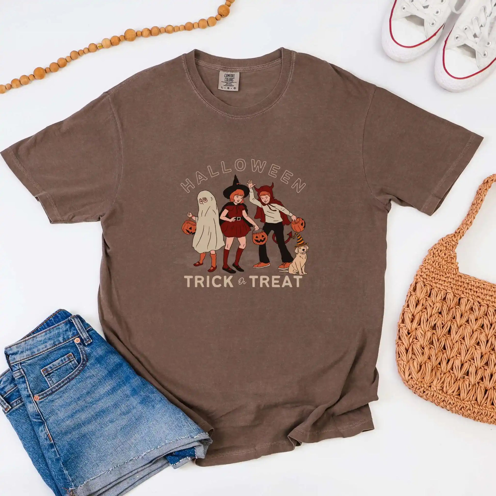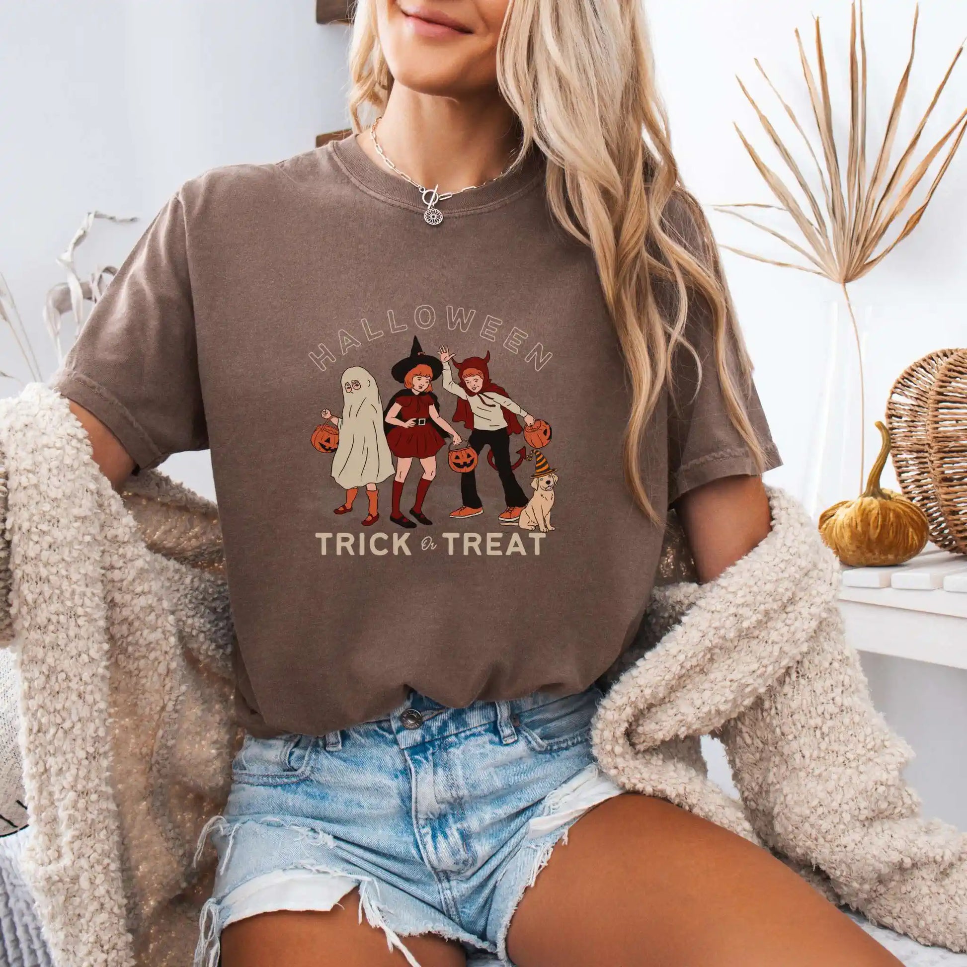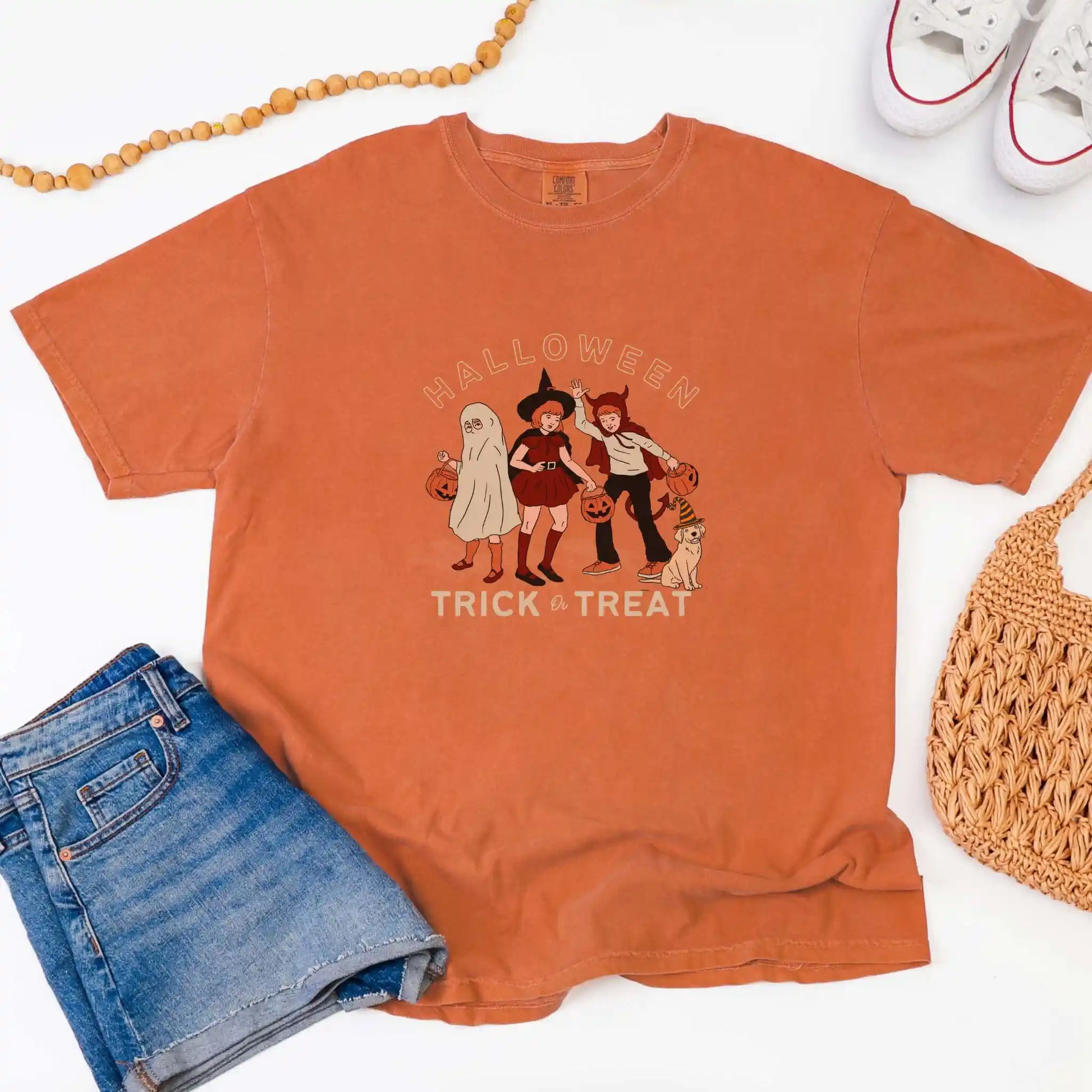 This t-shirt features a centered front design in warm, vintage tones, perfect for lovers of nostalgic style, neighborhood strolls, and timeless trick-or-treat traditions.