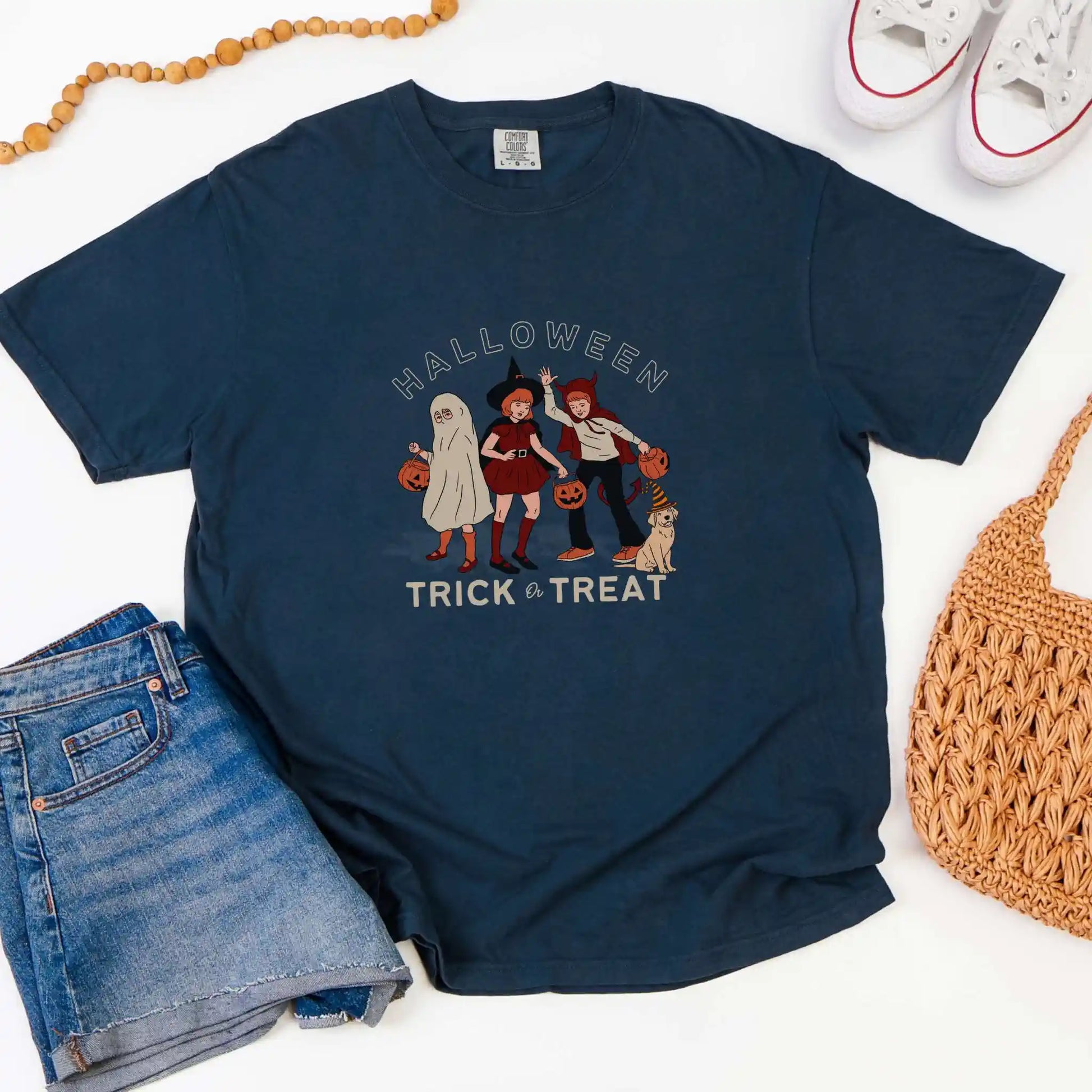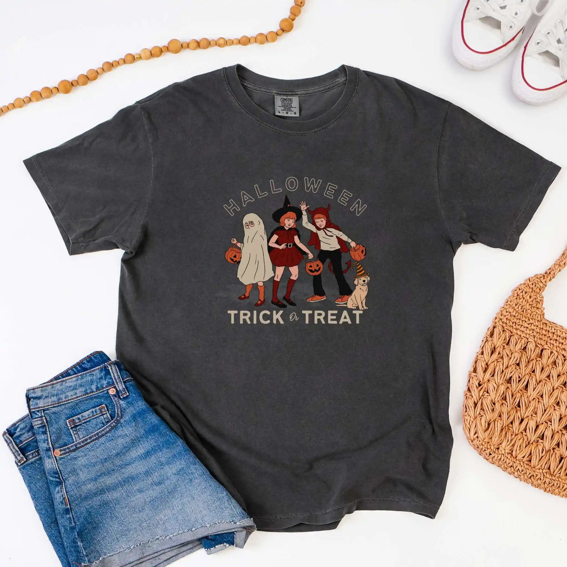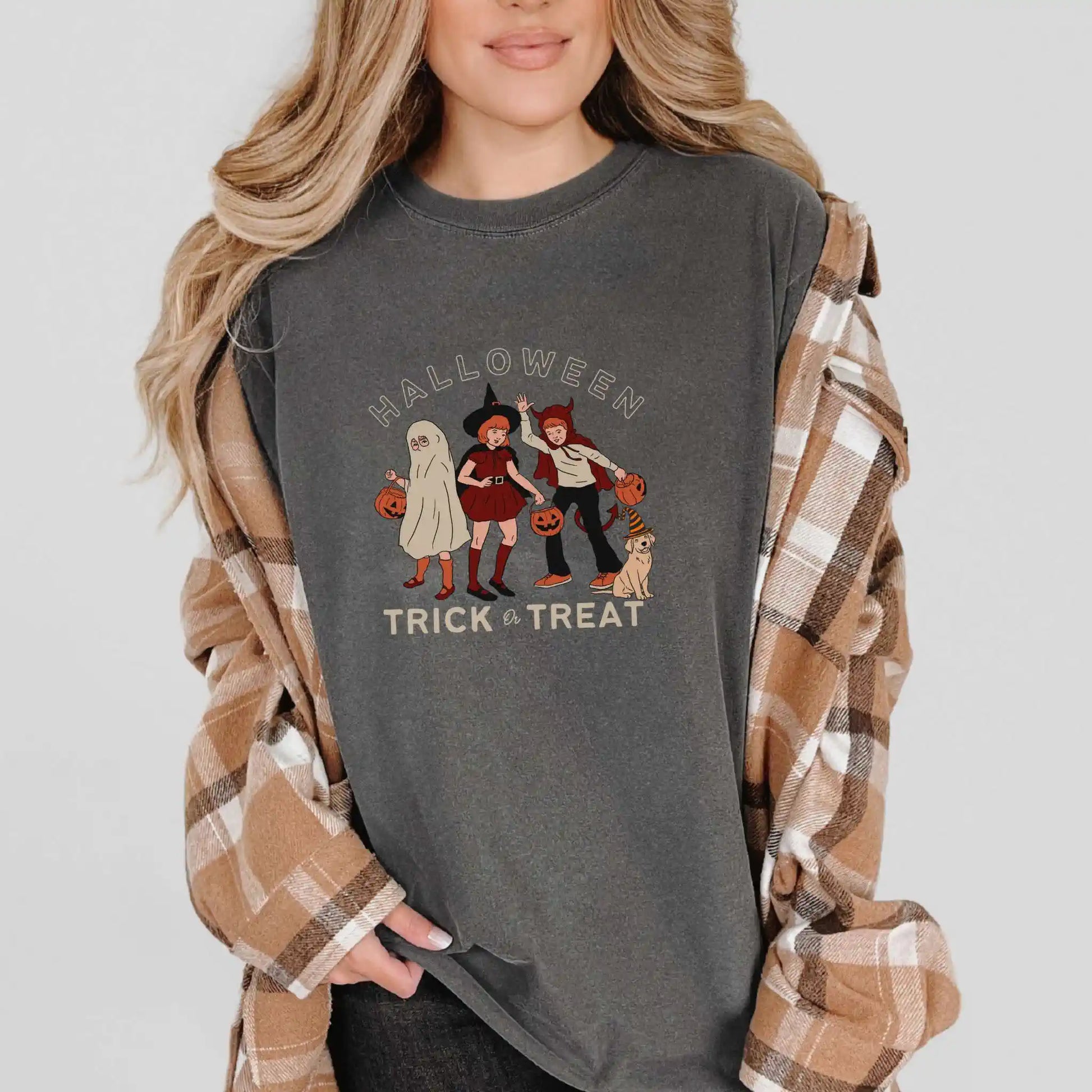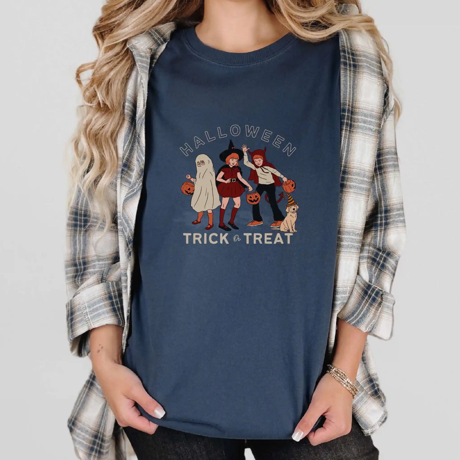 This t-shirt features a centered front design in warm, vintage tones, perfect for lovers of nostalgic style, neighborhood strolls, and timeless trick-or-treat traditions.