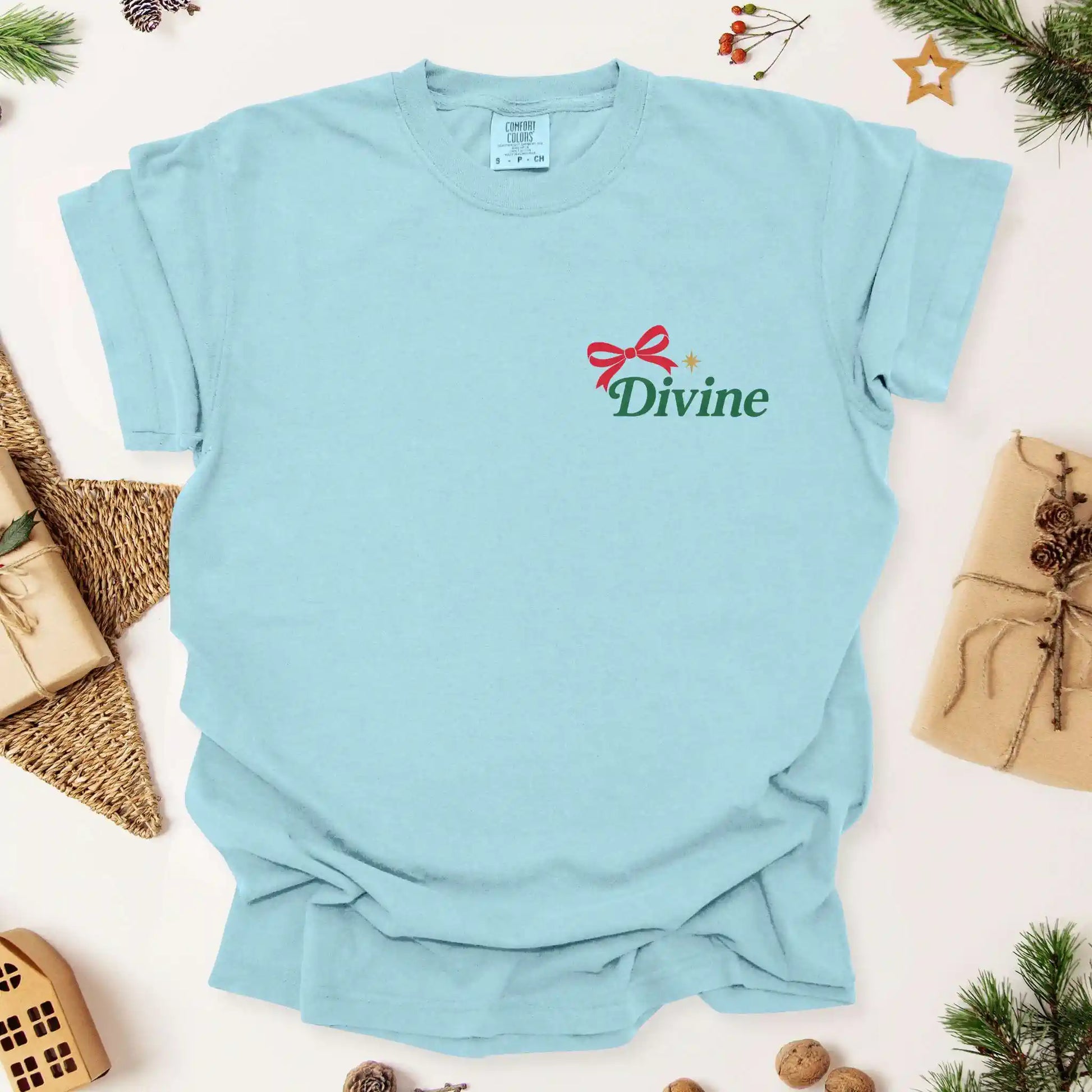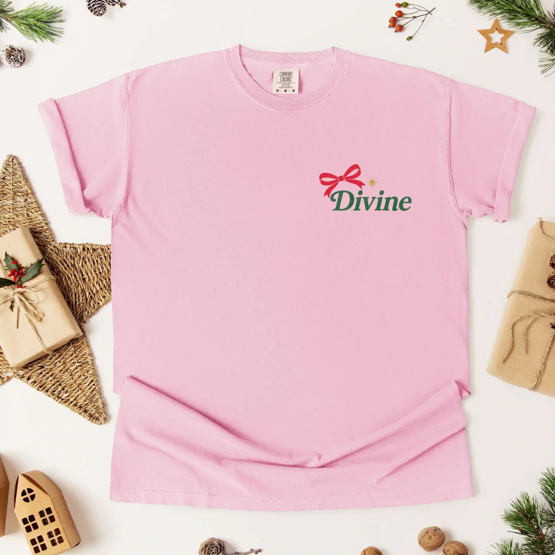 The front features the word “Divine” accented by a red bow and golden star, while the back showcases “Oh Holy Night” framed with soft snowflakes and a festive bow. A front-and-back print on a classic t-shirt perfect for candlelight services, Christmas Eve gatherings, or cozy winter nights.