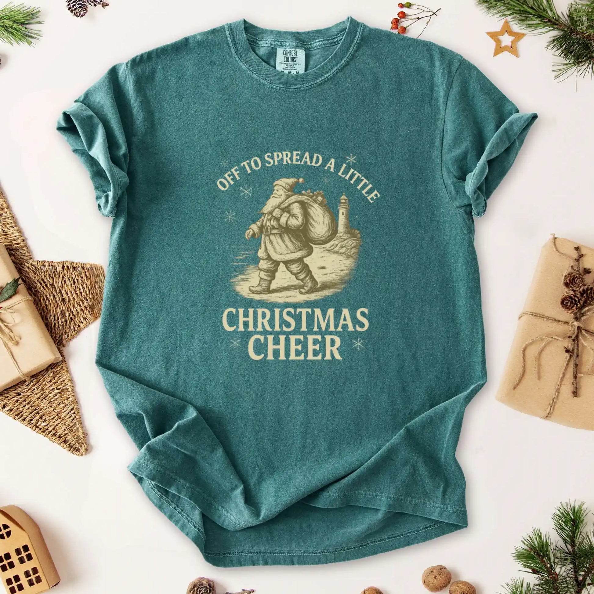 Features a vintage-style Santa carrying a toy sack with snowflakes and a lighthouse in the background beneath the phrase “Off to Spread a Little Christmas Cheer.” Front placement design perfect for cozy mornings, gift runs, or feeling festive wherever you go.