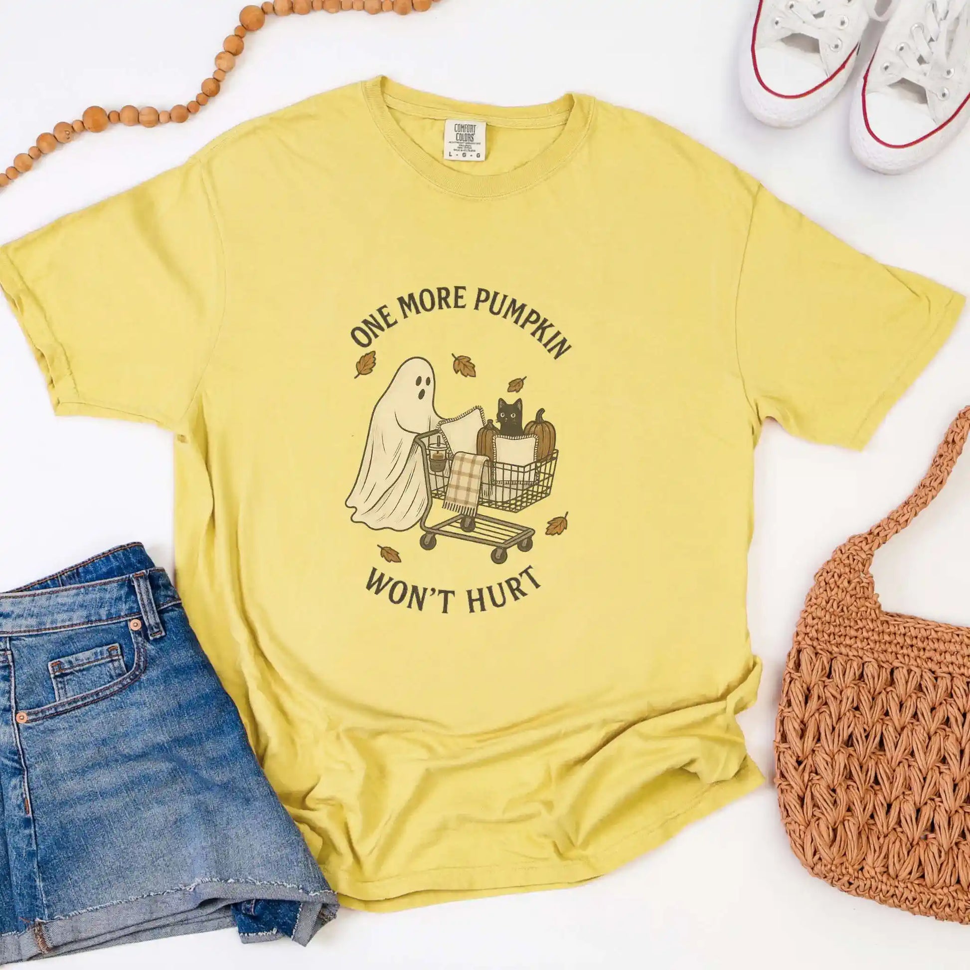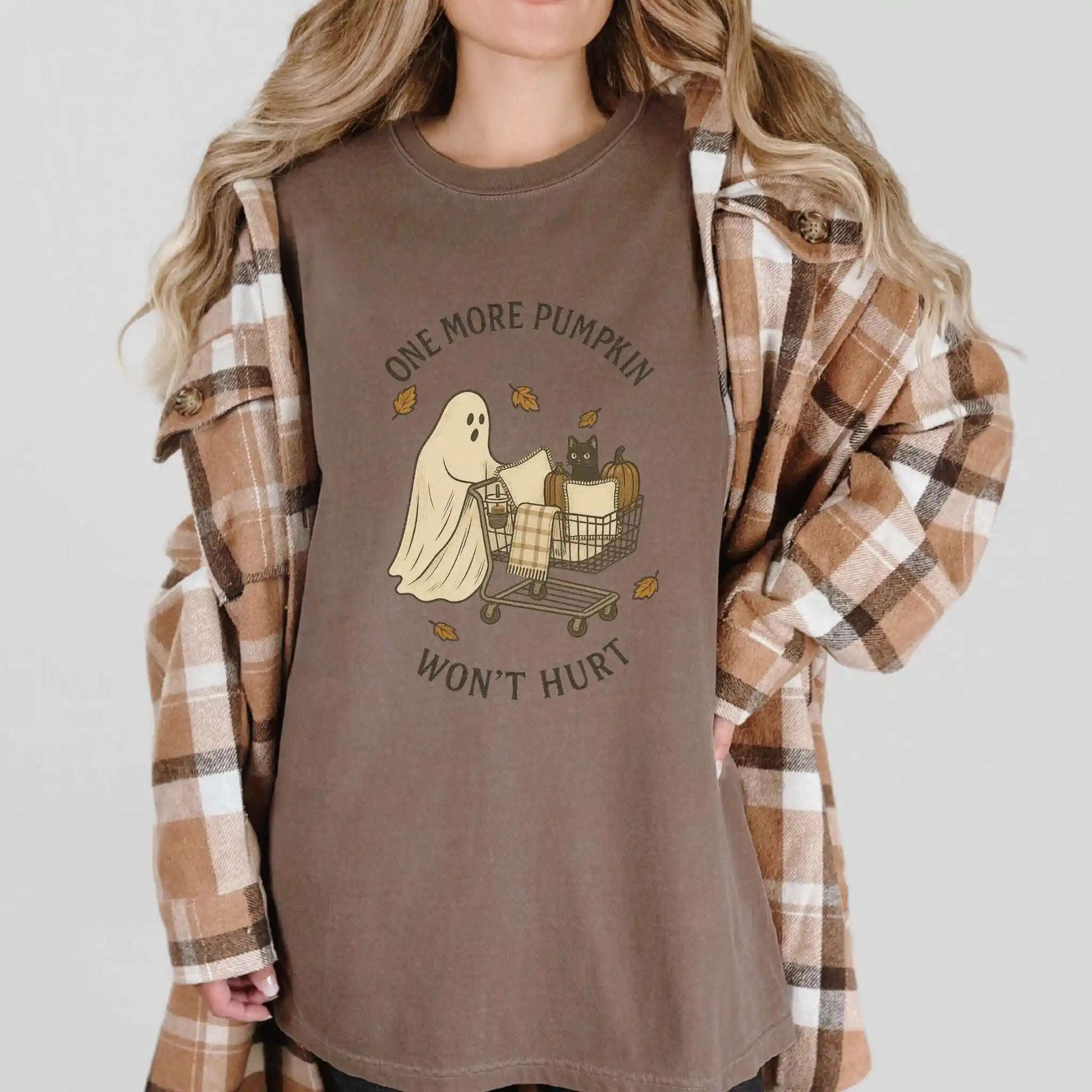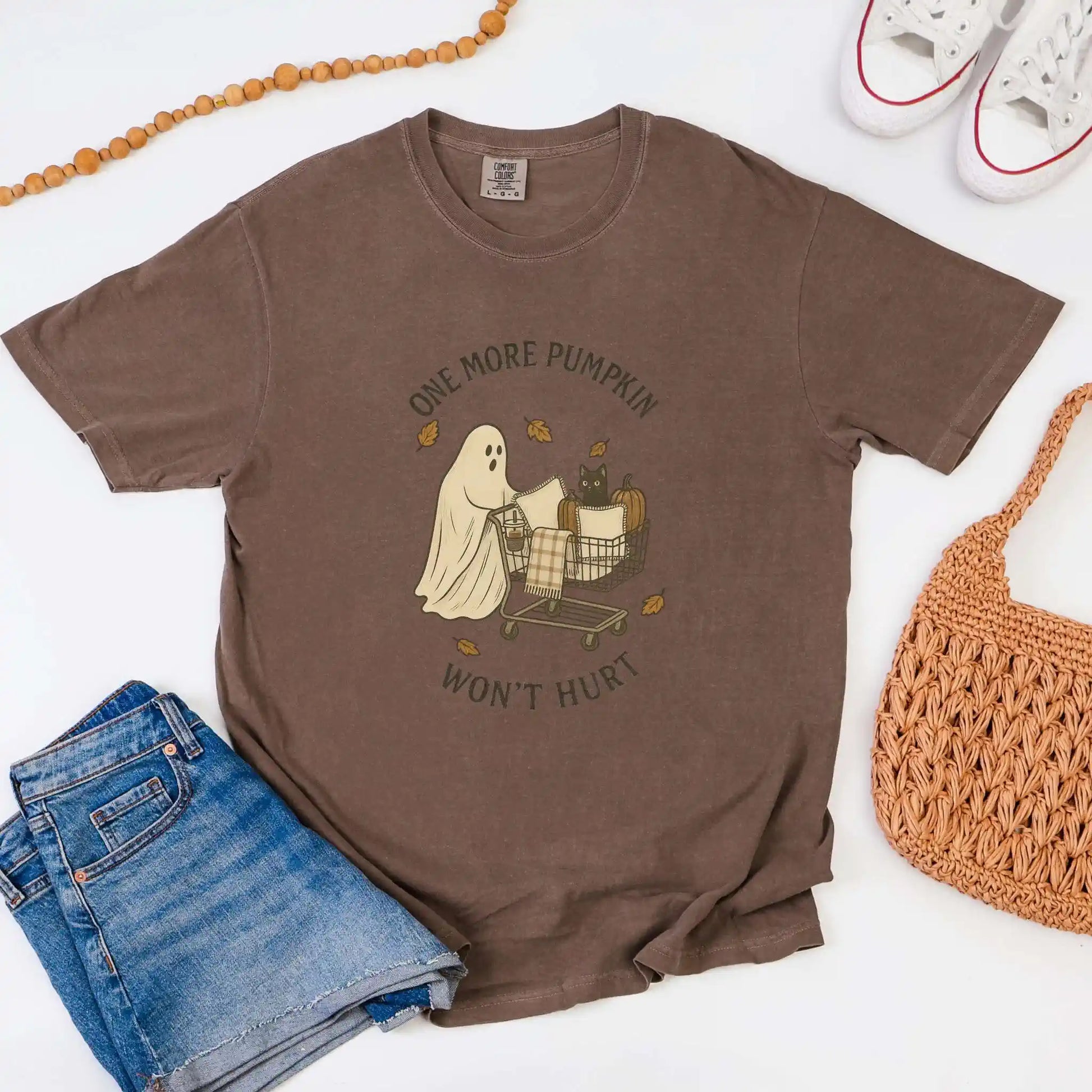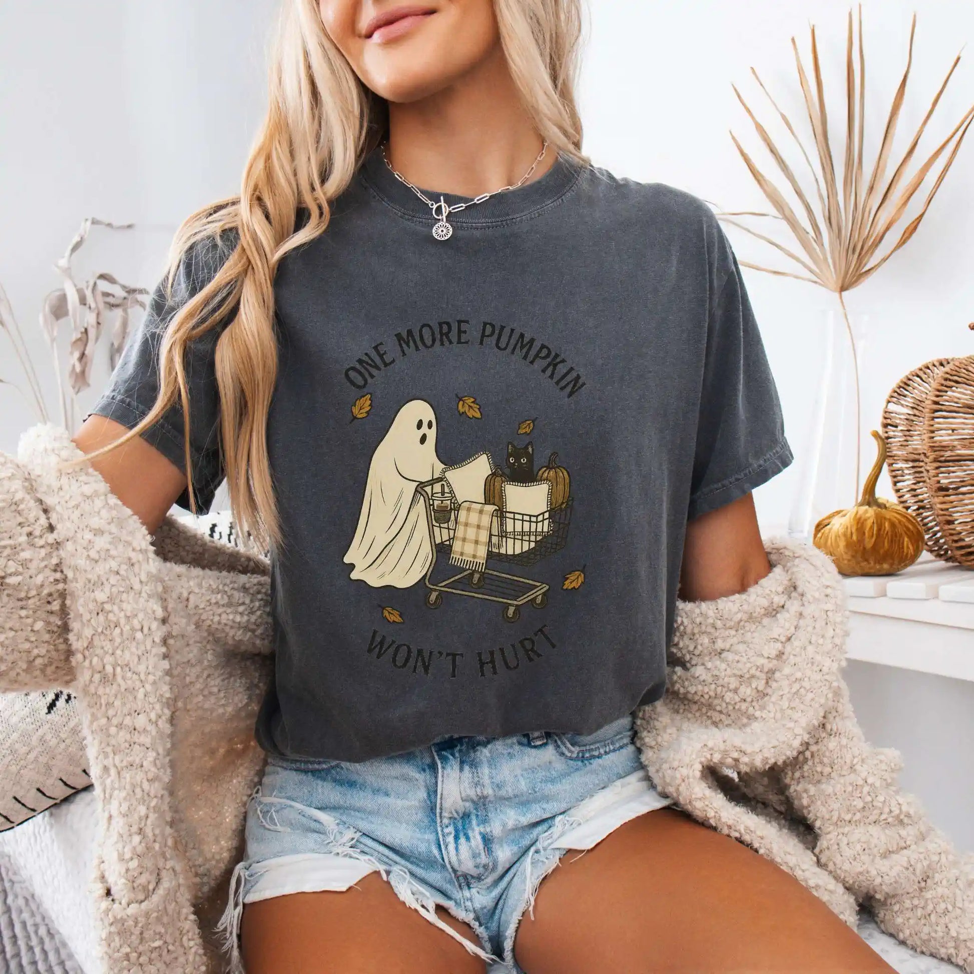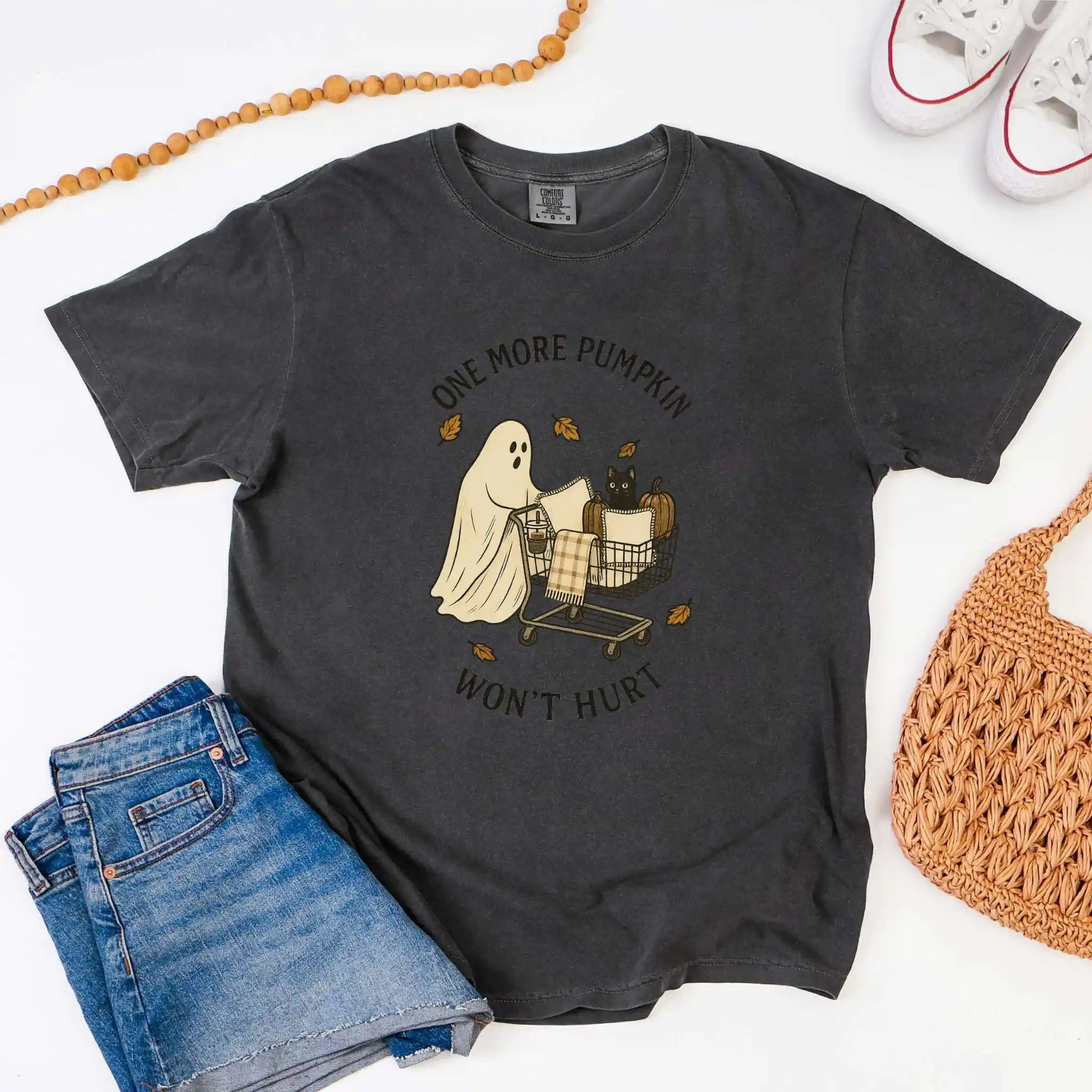 The design features a sweet ghost pushing a shopping cart filled with pumpkins, pillows, and a curious black cat, accented with swirling fall leaves. Printed on the front of a classic t-shirt, it’s a playful pick for seasonal outings, pumpkin patch strolls, or cozy nights in.