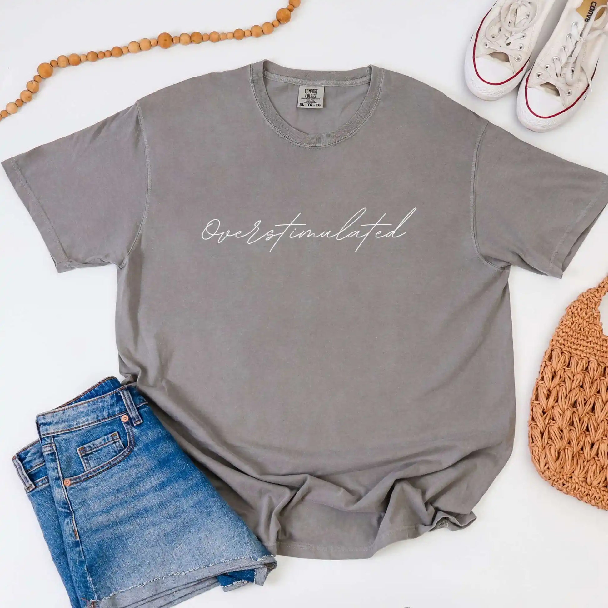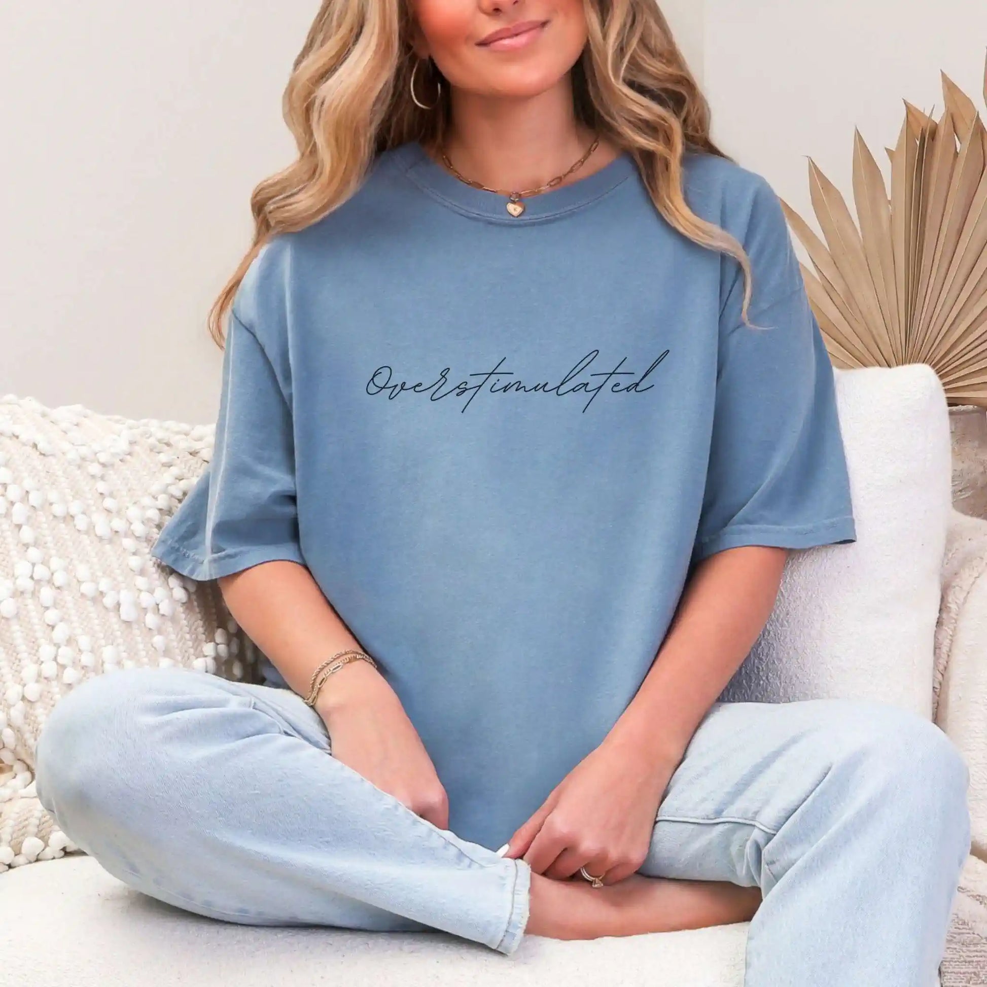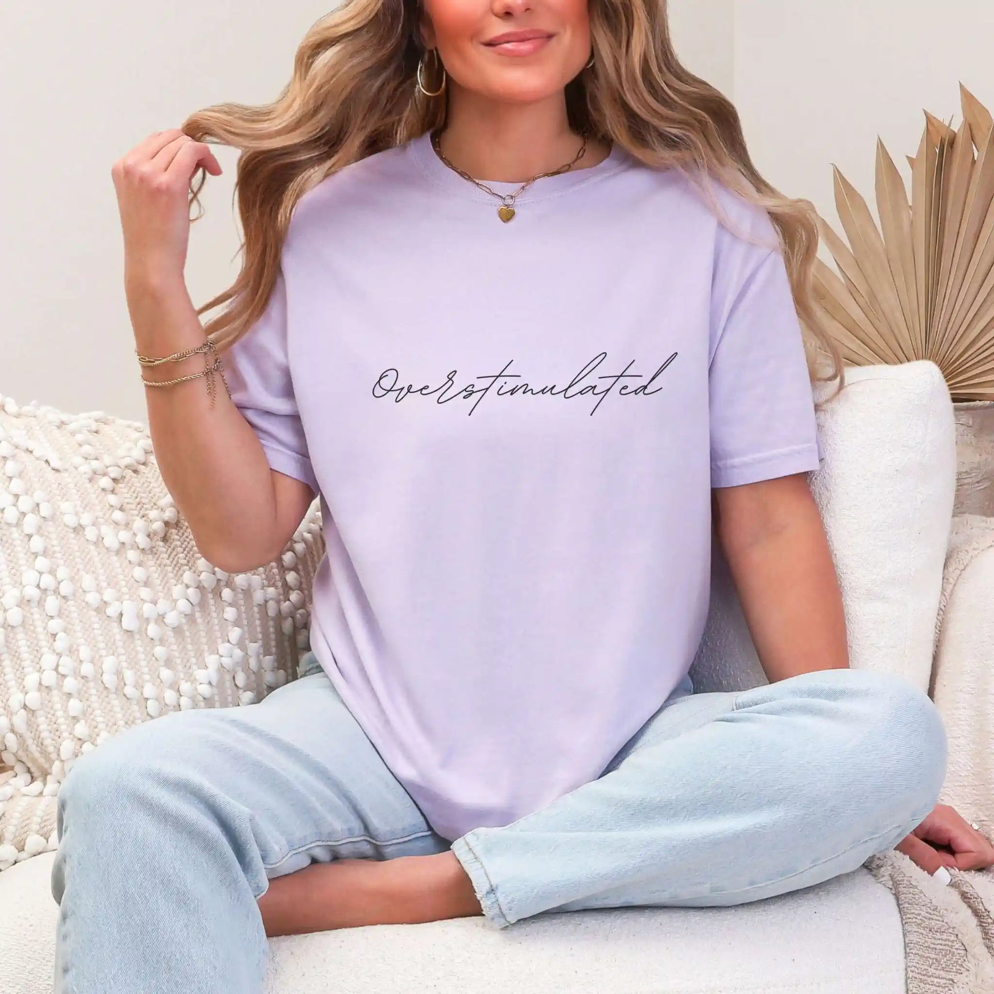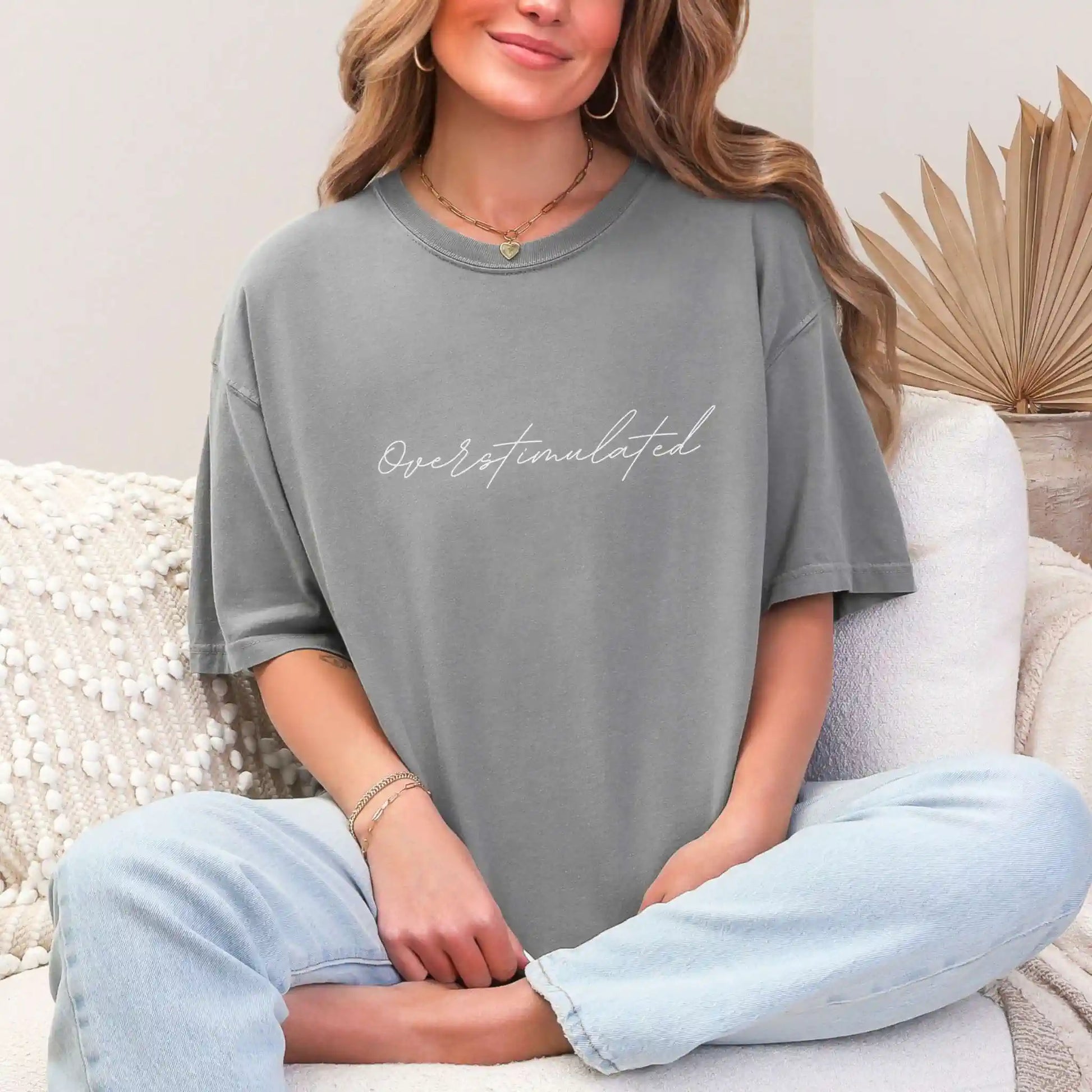 “Overstimulated” is the anthem of the touched-out and totally done — a tee for every over-it adult navigating the chaos.