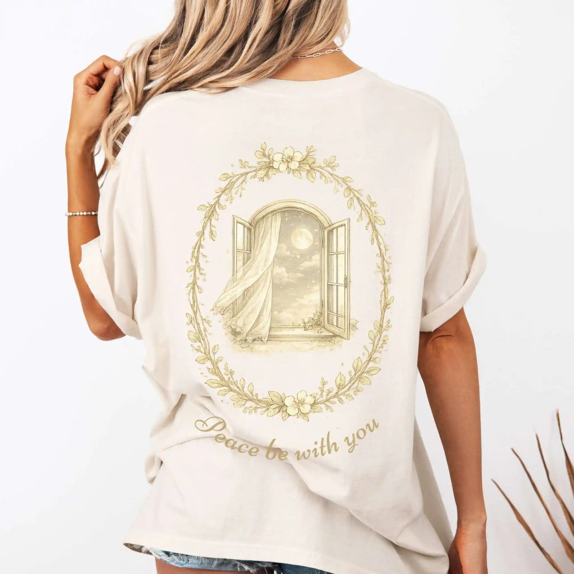 The back features an arched open window with flowing curtains, a glowing moon, and delicate floral framing, rendered in a warm, vintage-inspired style. The front includes a coordinating wreath detail with the phrase “Peace Be With You.” This t-shirt features a front-and-back design and feels thoughtful, calm, and timeless.