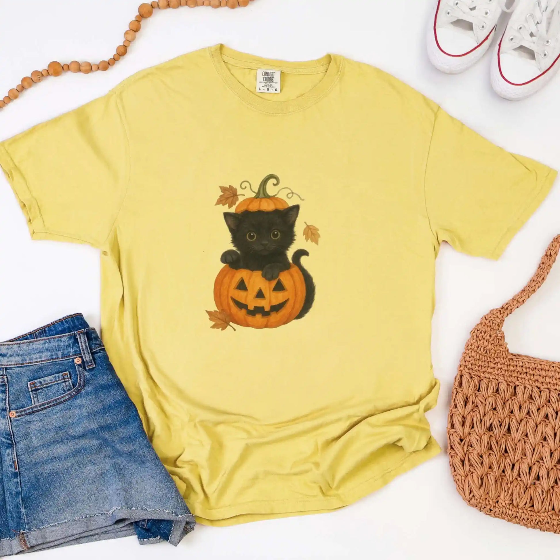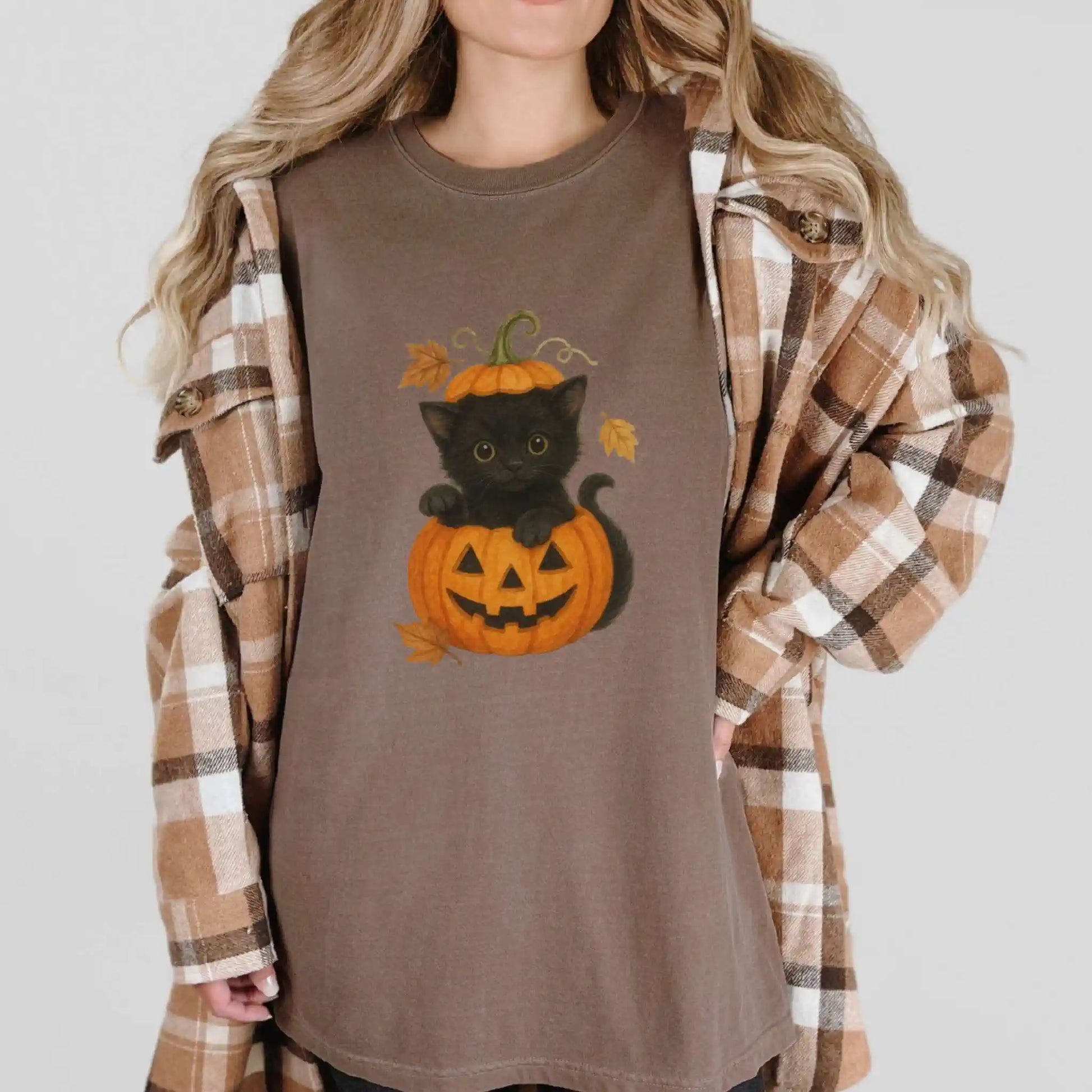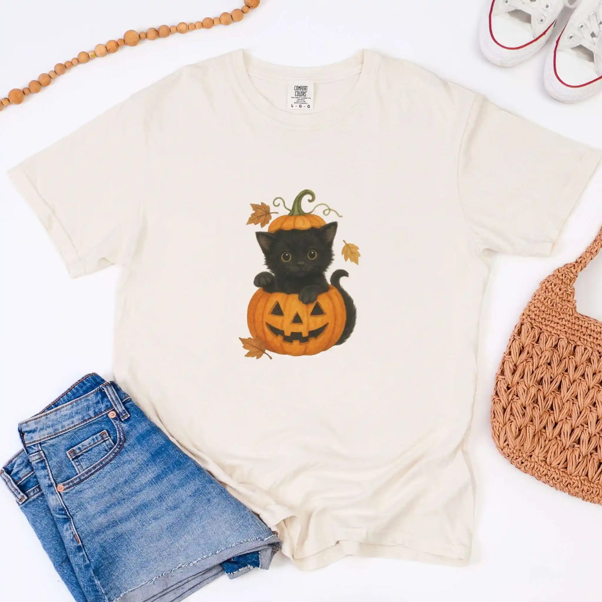 The front design features a wide-eyed black kitten peeking out of a glowing jack-o’-lantern, framed by falling autumn leaves. Printed on a classic t-shirt, it’s the perfect piece for pumpkin patch visits, Halloween fun, or cozy fall weekends.