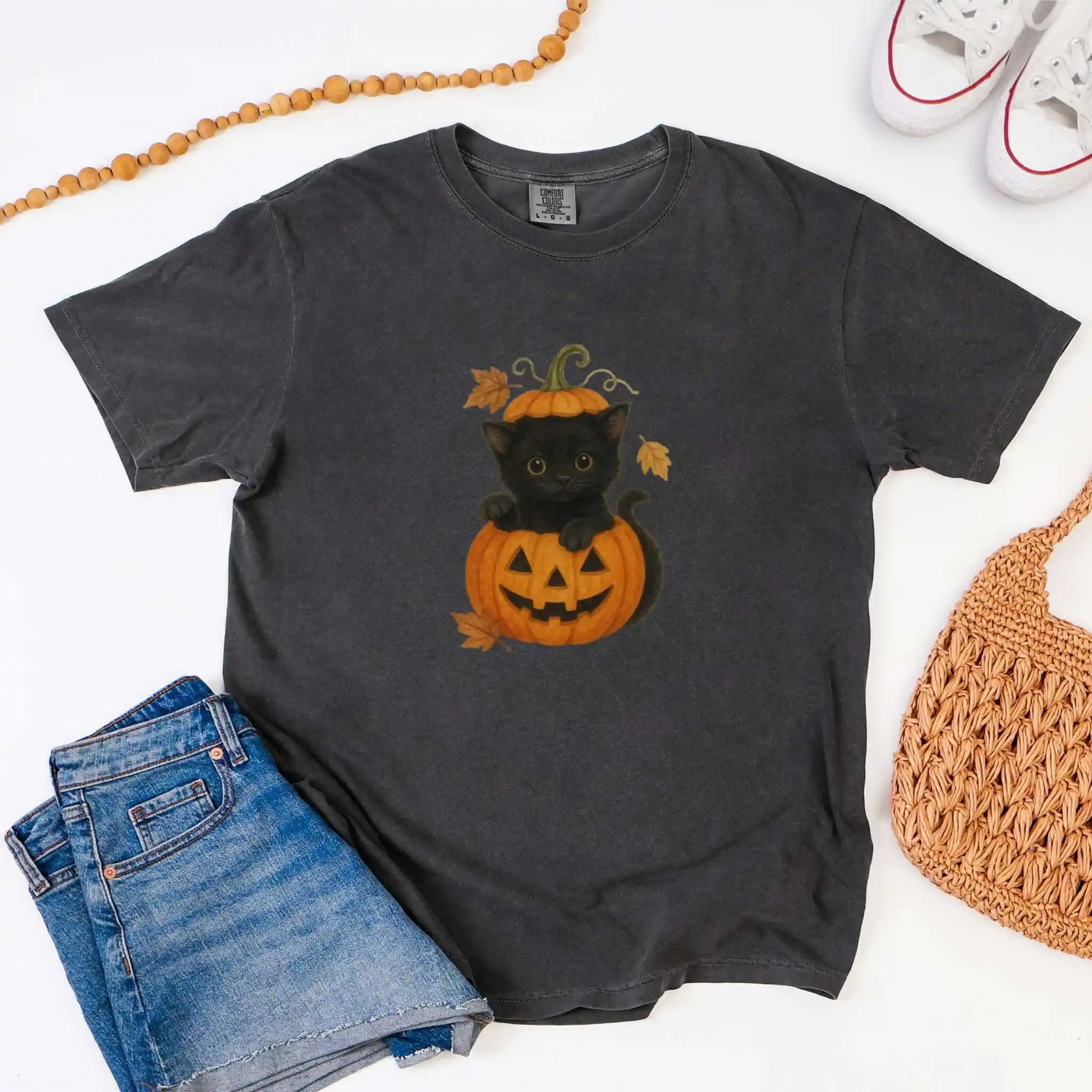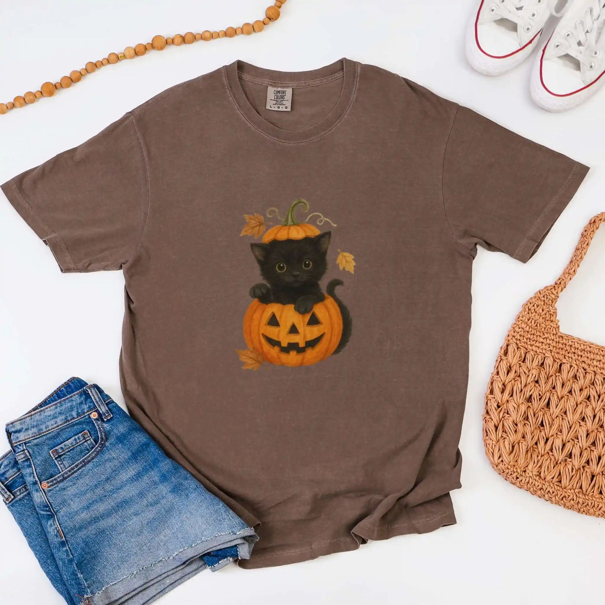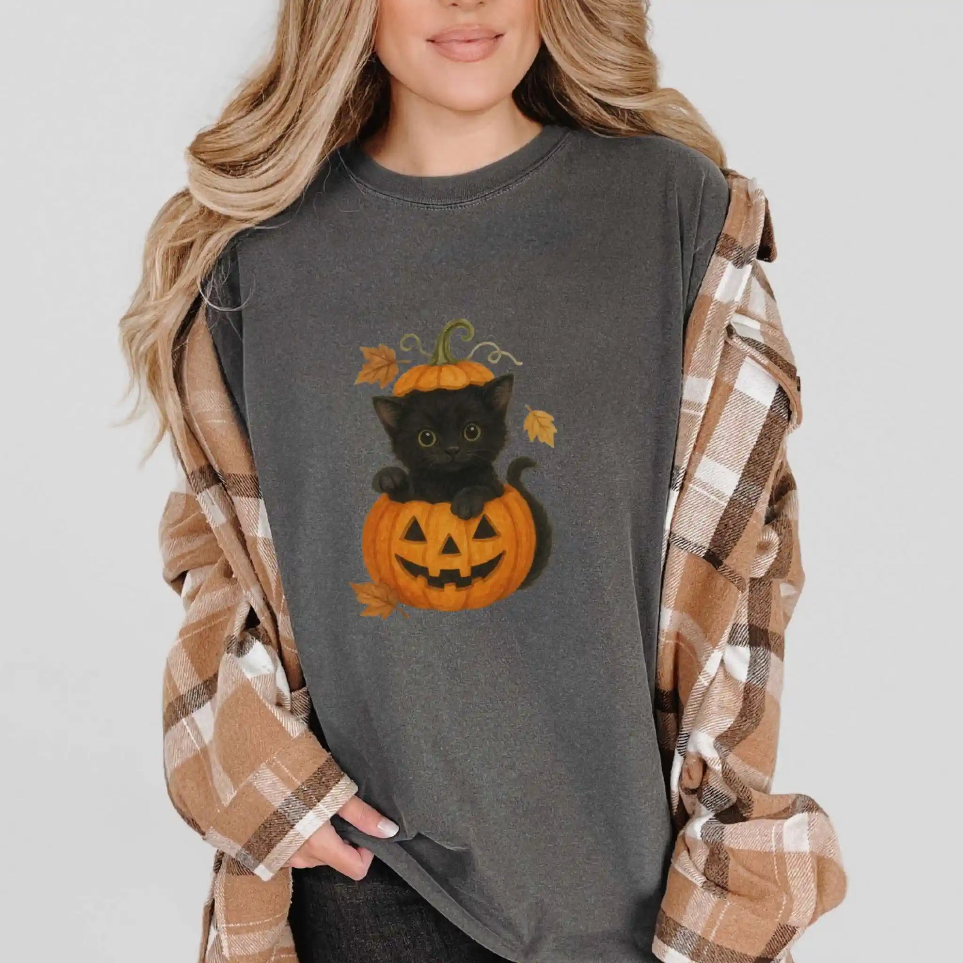 The front design features a wide-eyed black kitten peeking out of a glowing jack-o’-lantern, framed by falling autumn leaves. Printed on a classic t-shirt, it’s the perfect piece for pumpkin patch visits, Halloween fun, or cozy fall weekends.