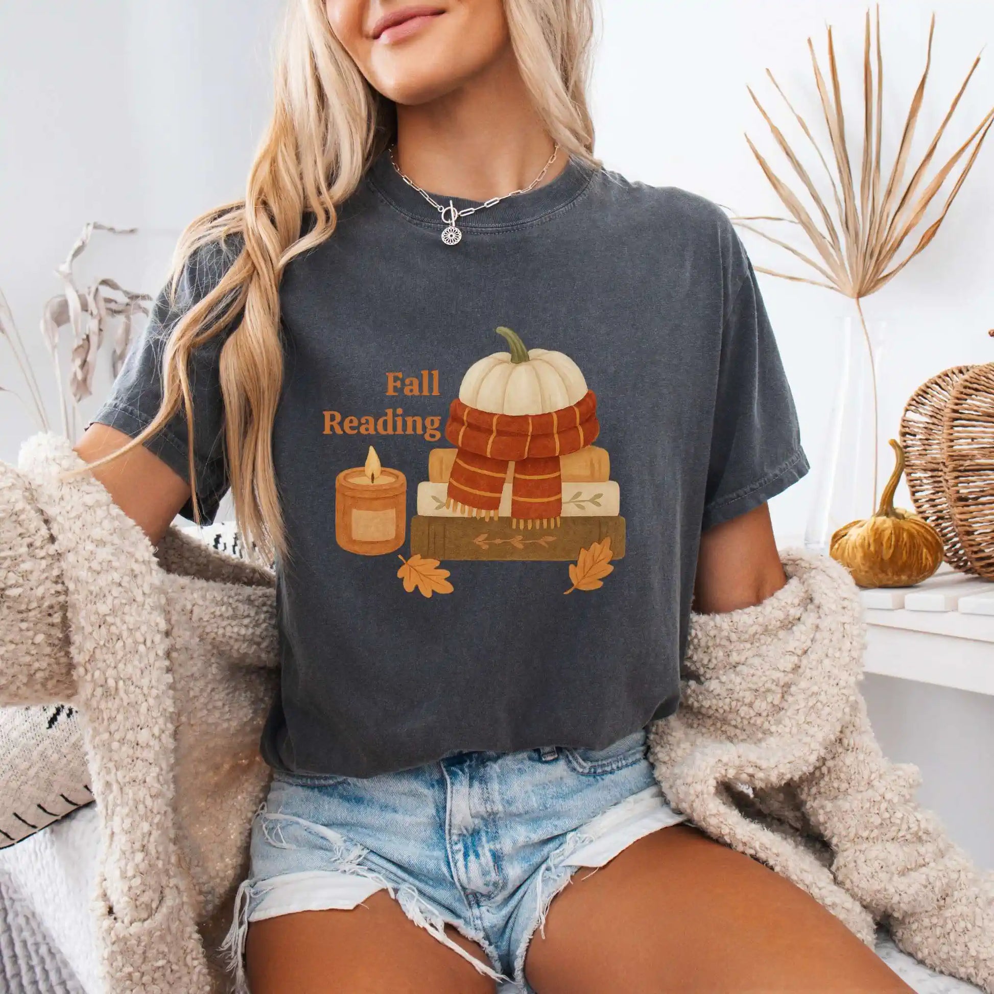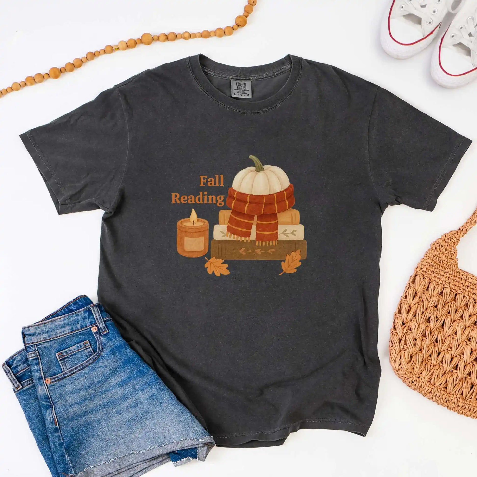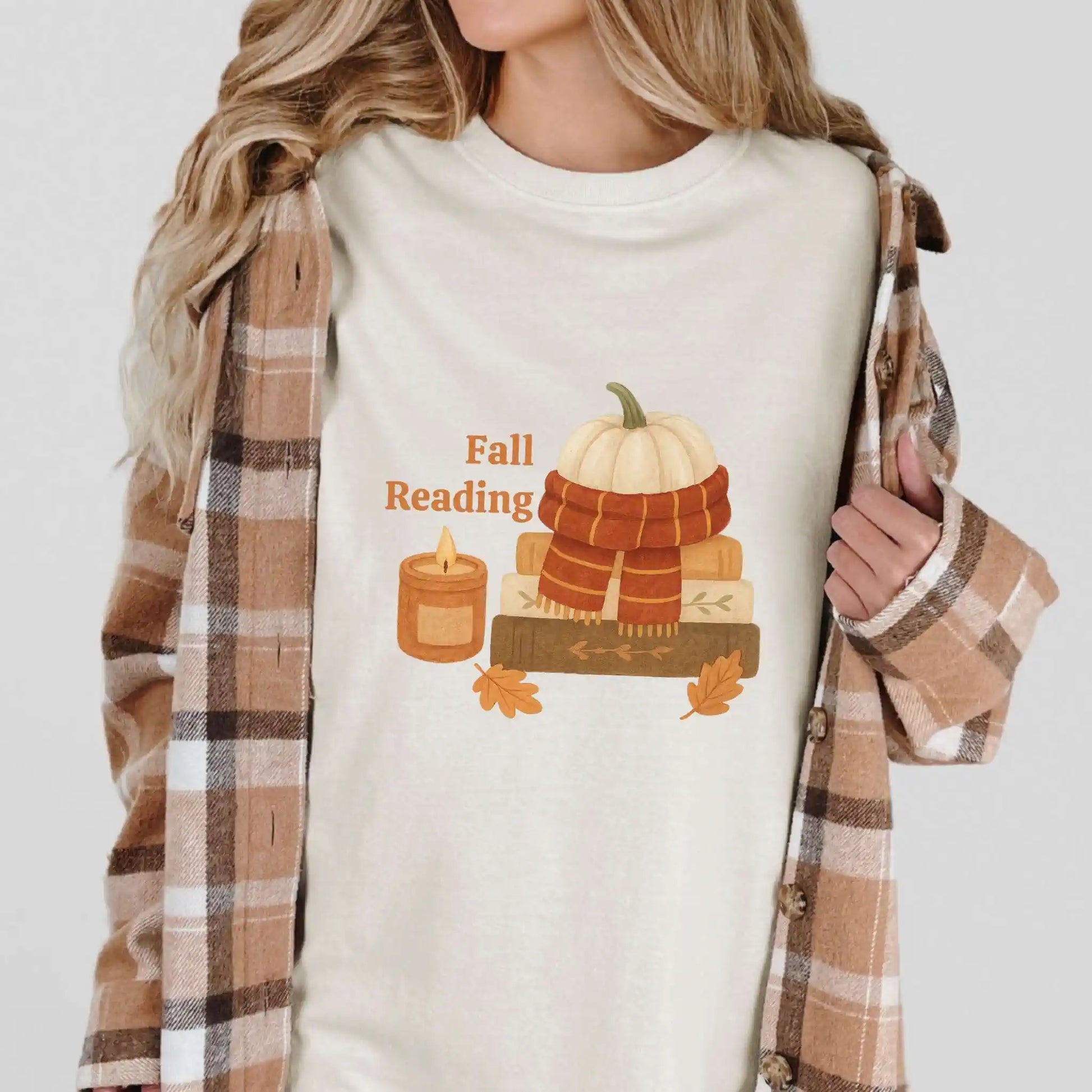 The front graphic shows a pumpkin wrapped in a scarf, stacked books, a glowing candle, and scattered leaves alongside the words “Fall Reading.” Printed on the front of a soft t-shirt, it’s ideal for coffee shop escapes, library visits, or curling up at home with your favorite novel.