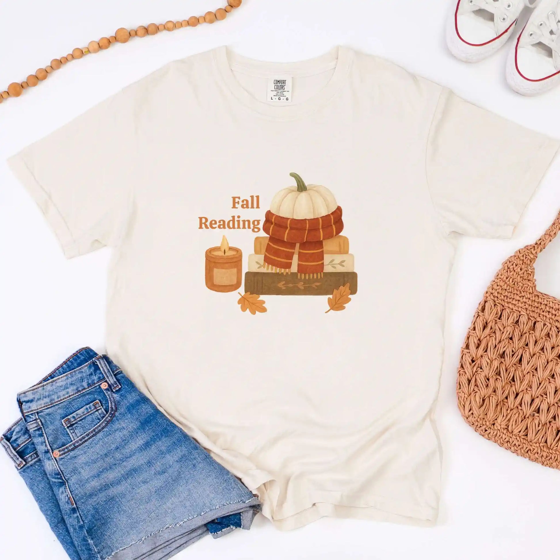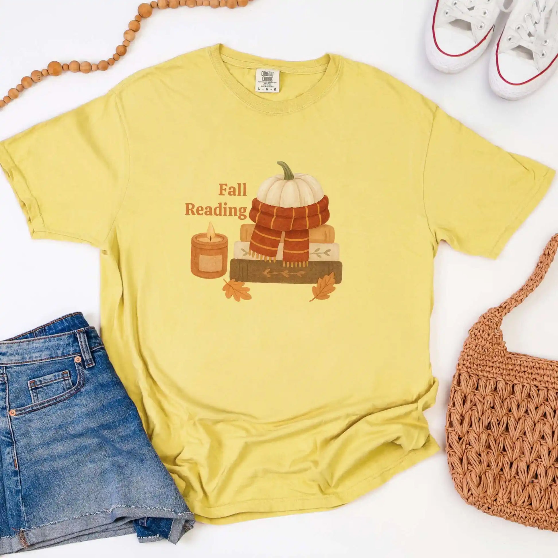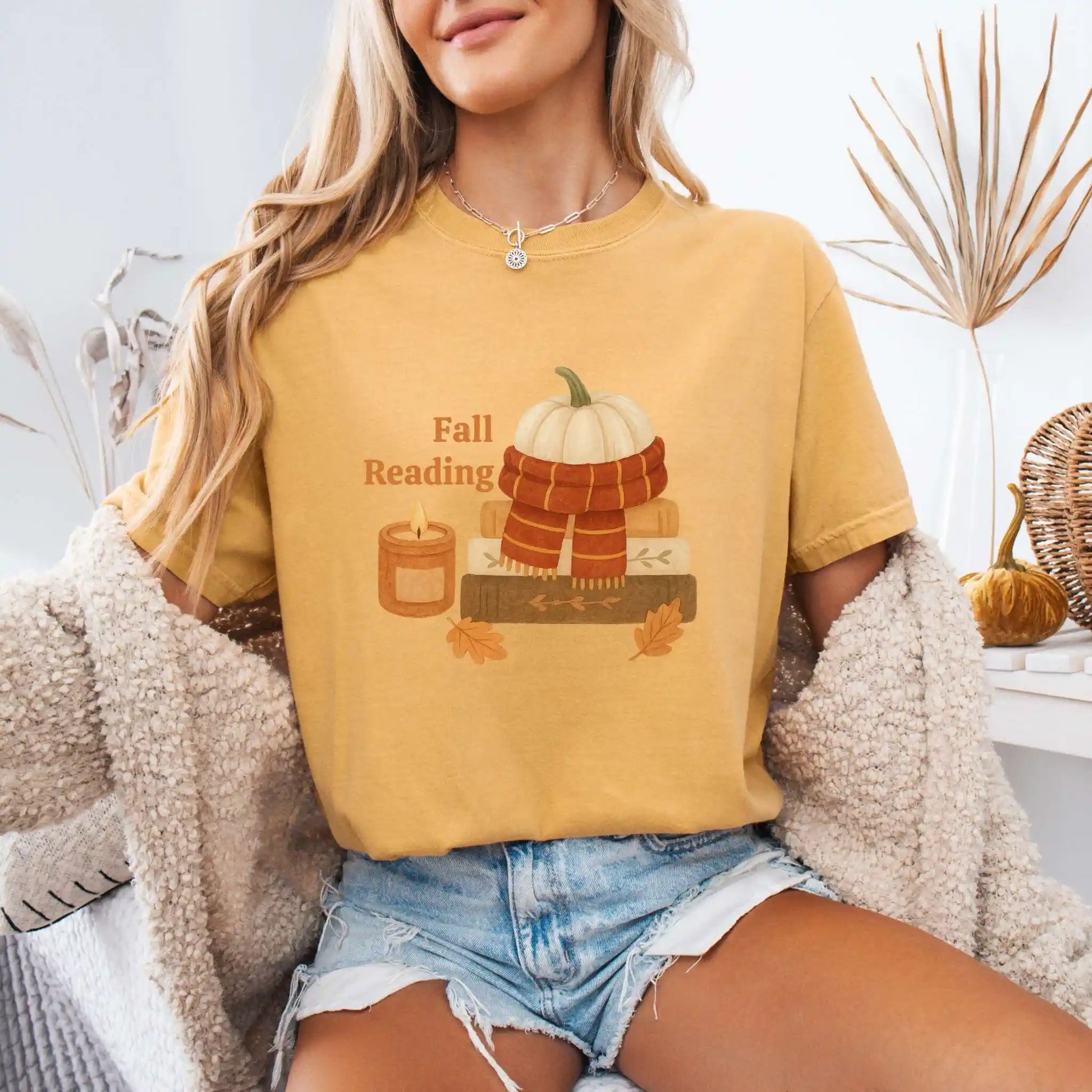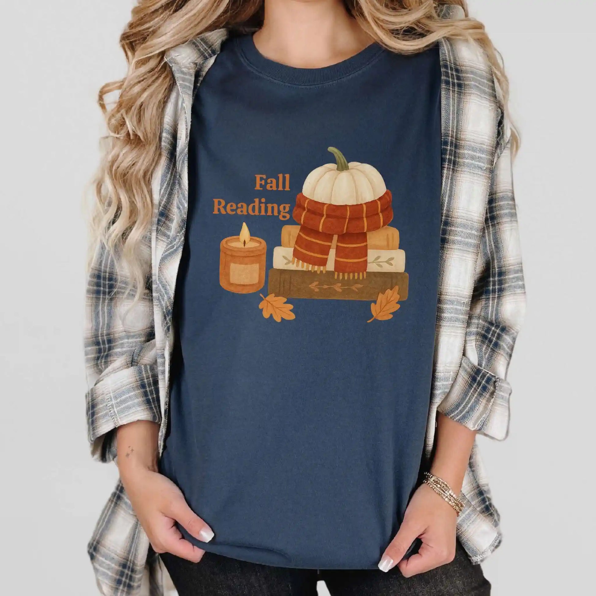 The front graphic shows a pumpkin wrapped in a scarf, stacked books, a glowing candle, and scattered leaves alongside the words “Fall Reading.” Printed on the front of a soft t-shirt, it’s ideal for coffee shop escapes, library visits, or curling up at home with your favorite novel.