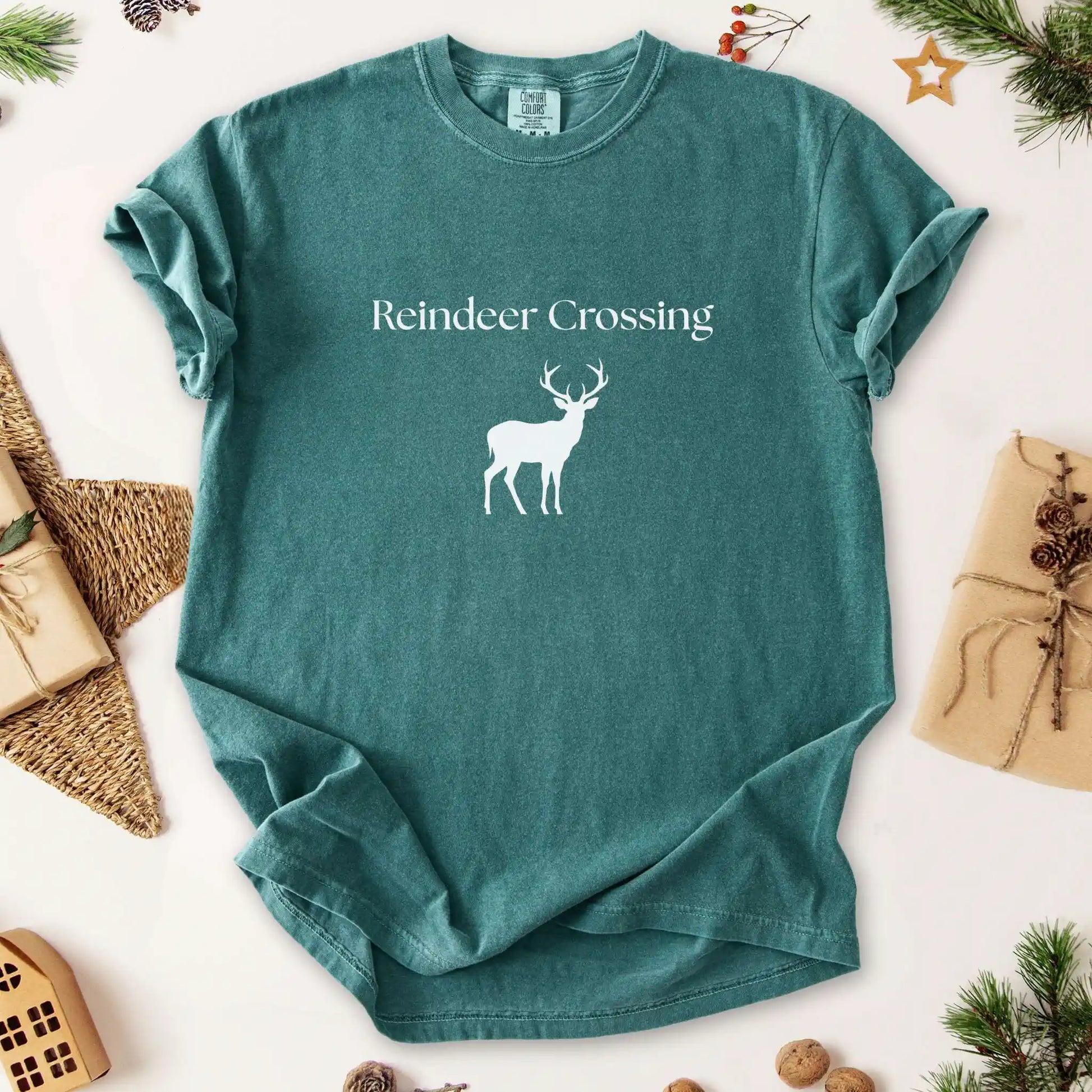 Features a silhouette of a reindeer beneath the phrase “Reindeer Crossing” in clean serif typography. A front-center design on a classic t-shirt perfect for everyday winter wear, holiday markets, or cozy nights under twinkling lights.