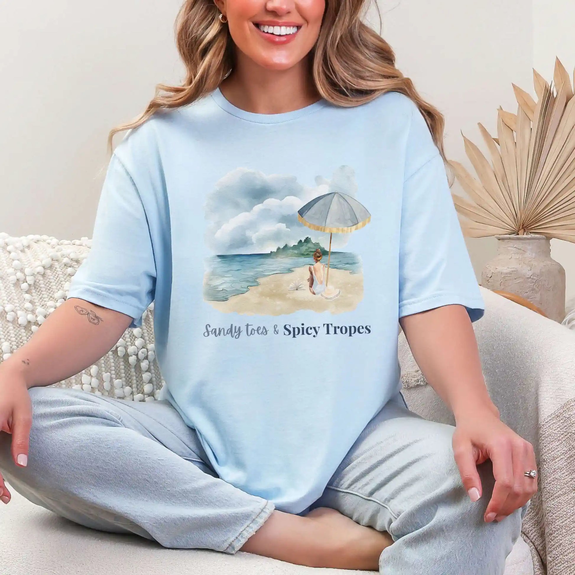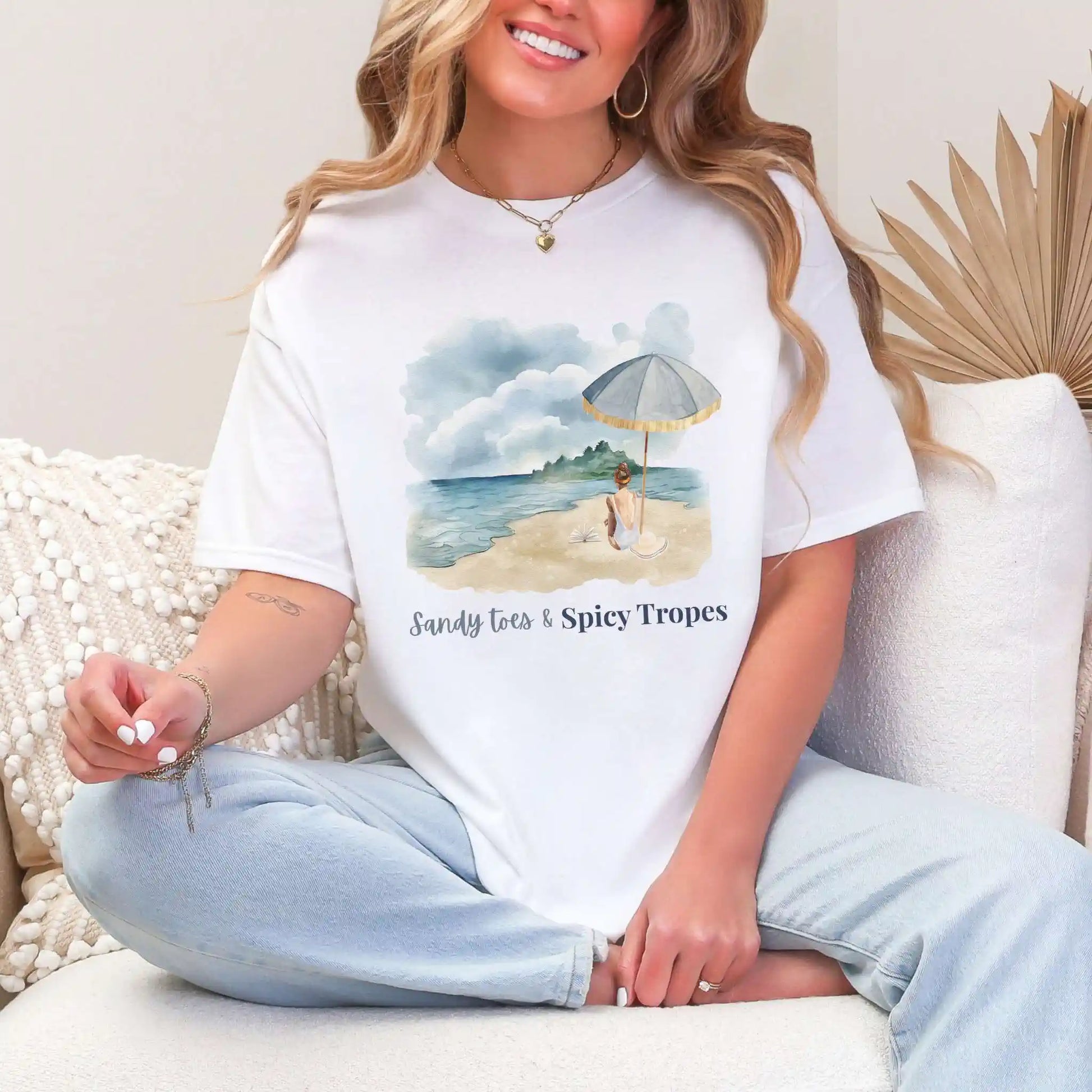 Our “Sandy Toes & Spicy Tropes” tee is made for beach loungers and book lovers — playful, warm, and full of summer storylines.