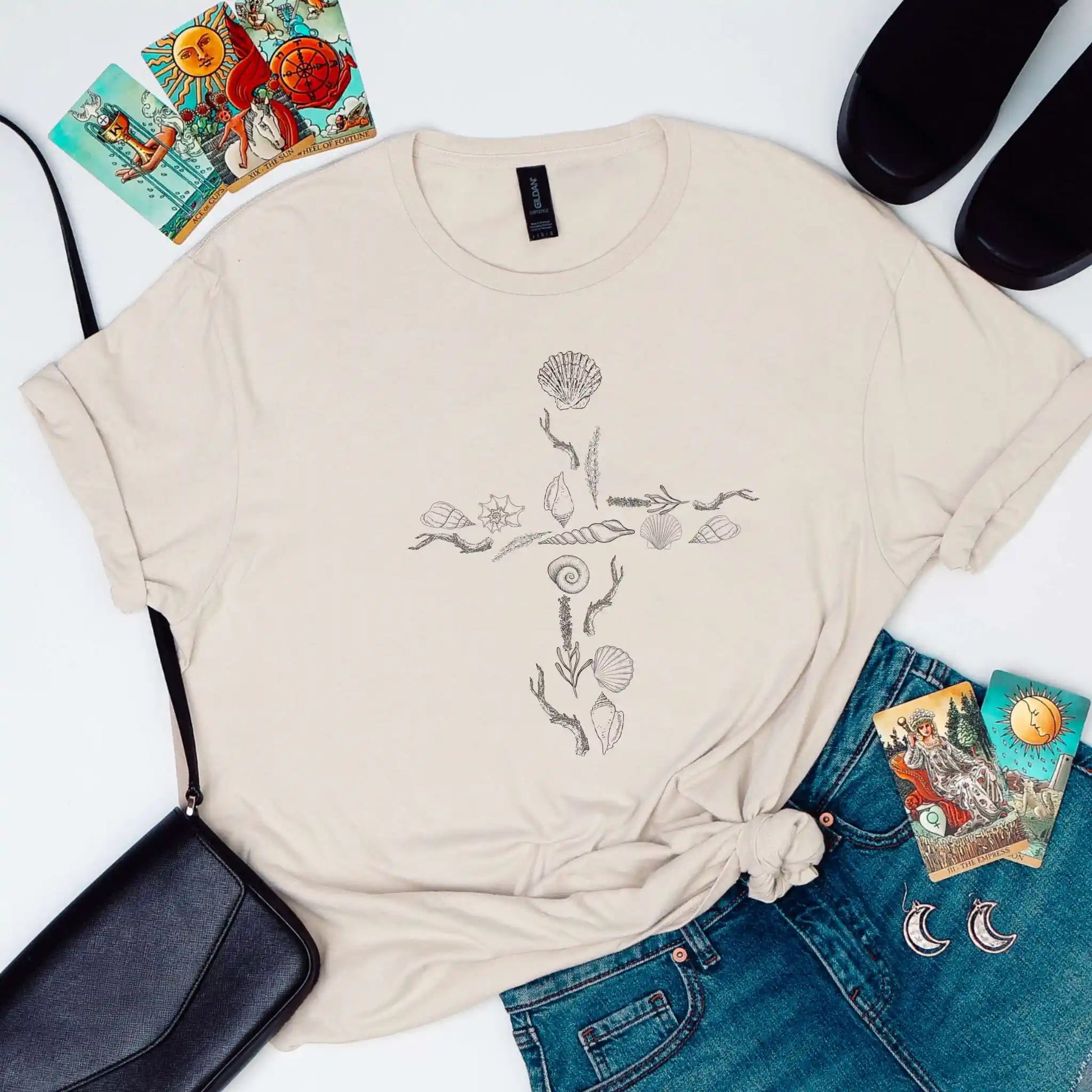 The design forms a cross entirely out of detailed sea shells, coral branches, and seaweed, arranged with delicate symmetry. It's an earthy, beachy take on a timeless spiritual icon — subtle, serene, and beautifully intentional.