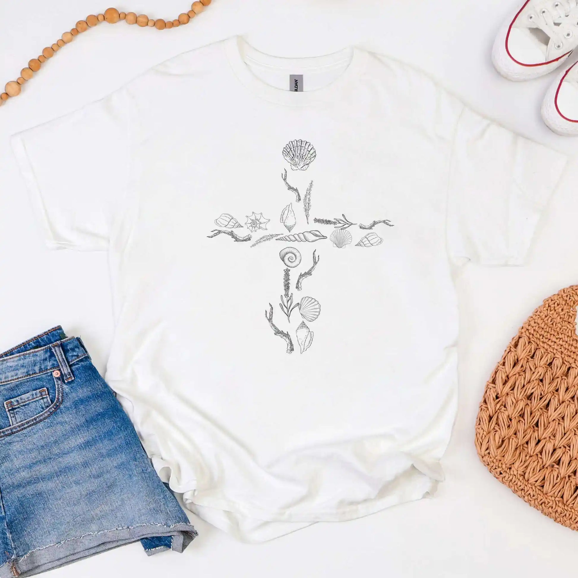 Where the shore meets the soul — this design blends the calm of coastal beauty with a symbol of faith. Whether you're drawn to the ocean or inspired by quiet spiritual moments, this tee holds a little piece of both.