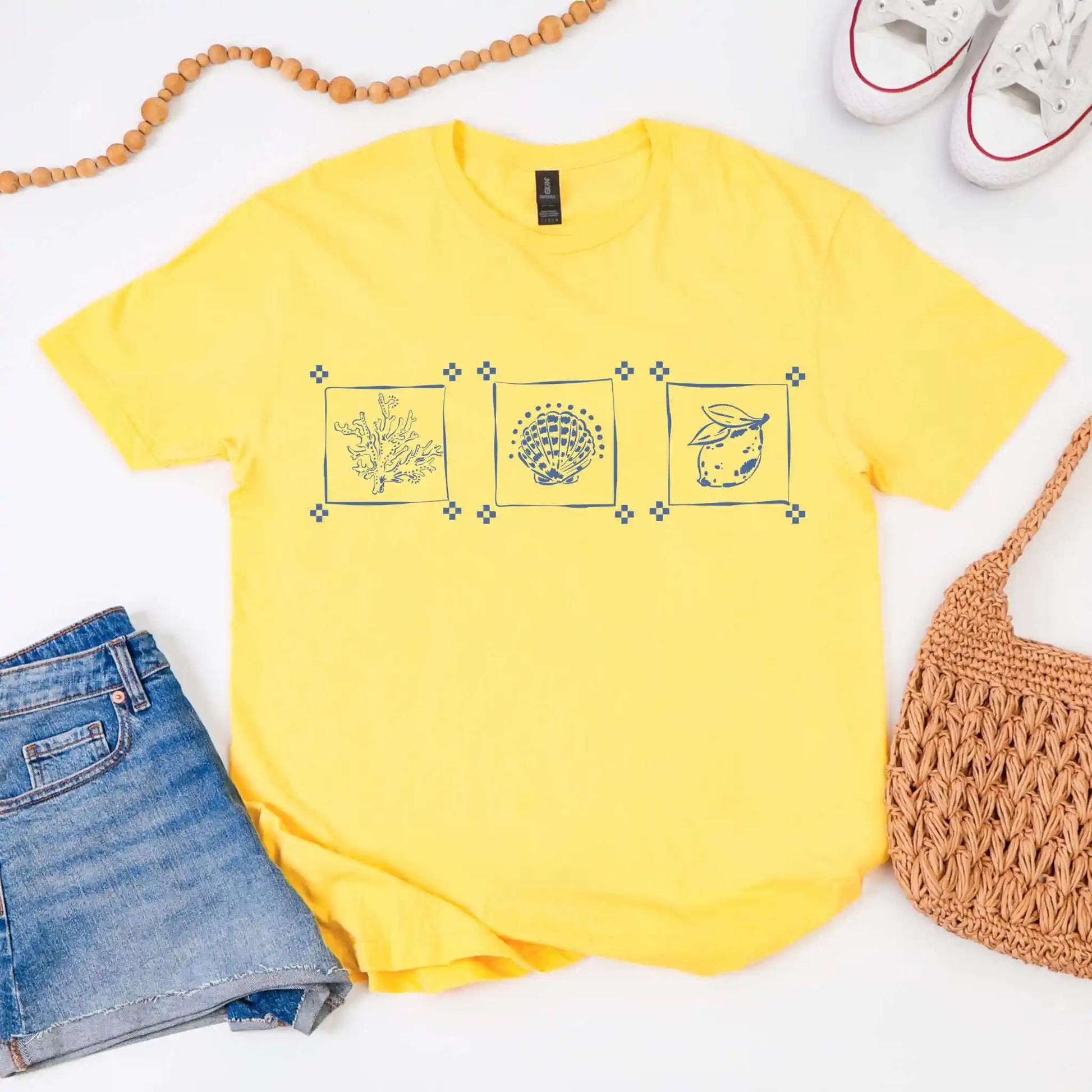 For the breezy, barefoot kind of days.bThis relaxed coastal tee brings together three icons of summer: citrus, sea, and serenity. It’s quiet, calm, and totally beach-ready.