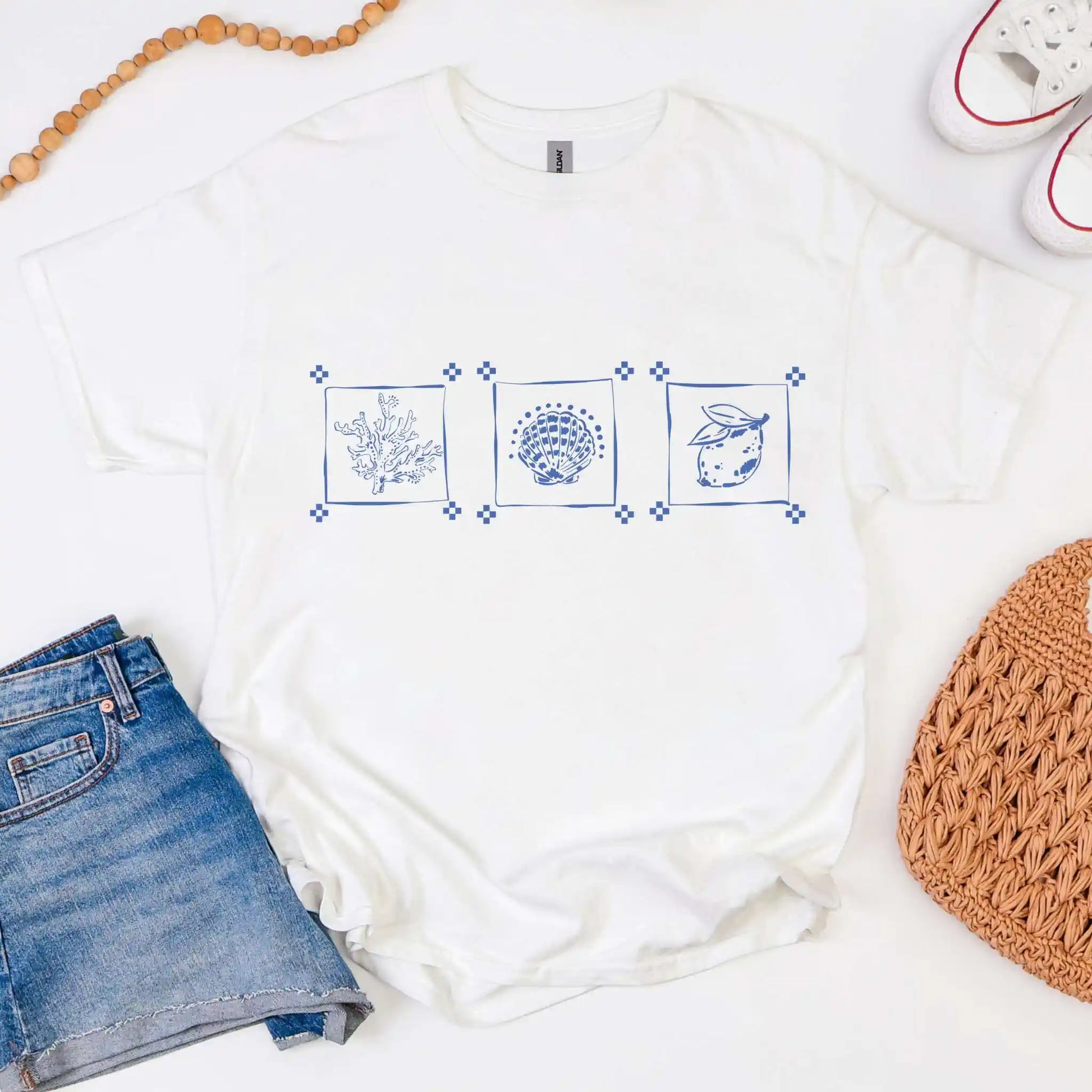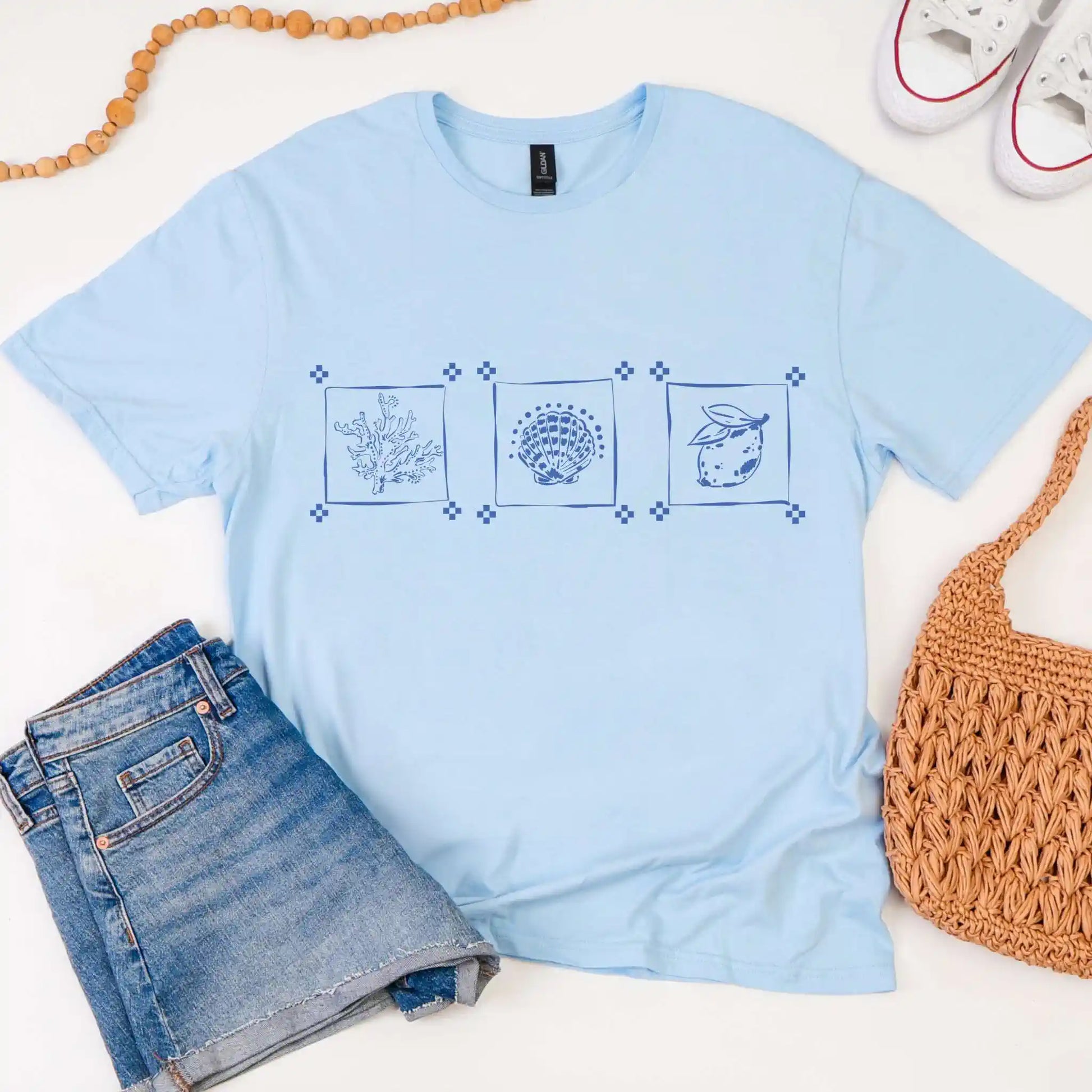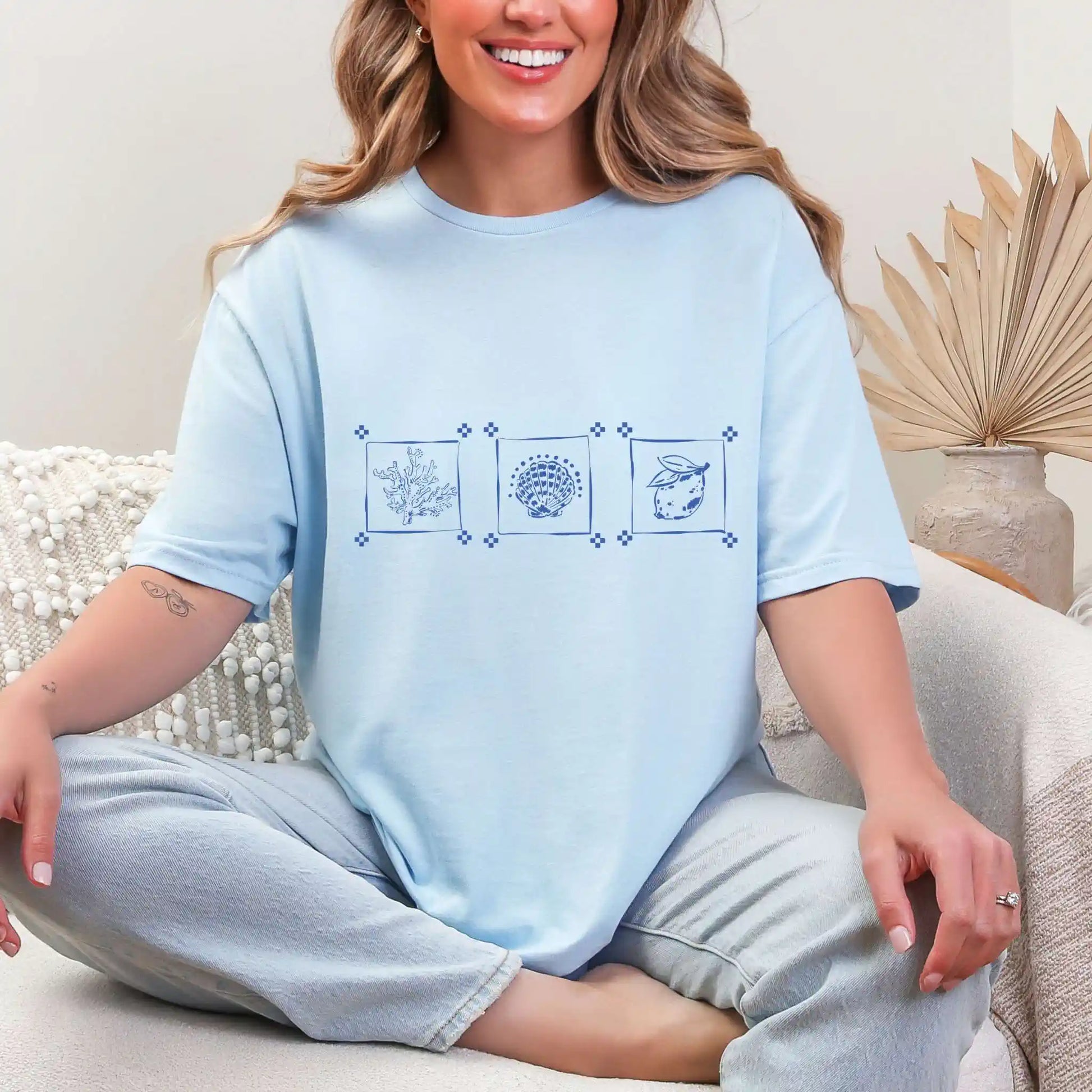 Three hand-drawn tiles in a row: a coral branch, a detailed scallop shell, and a lemon with leaves. Rendered in ocean blue with a loose, rustic style and delicate corner accents for a handmade feel.