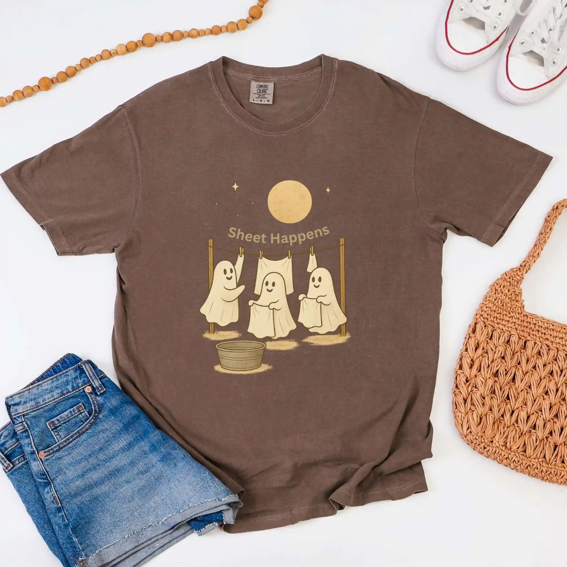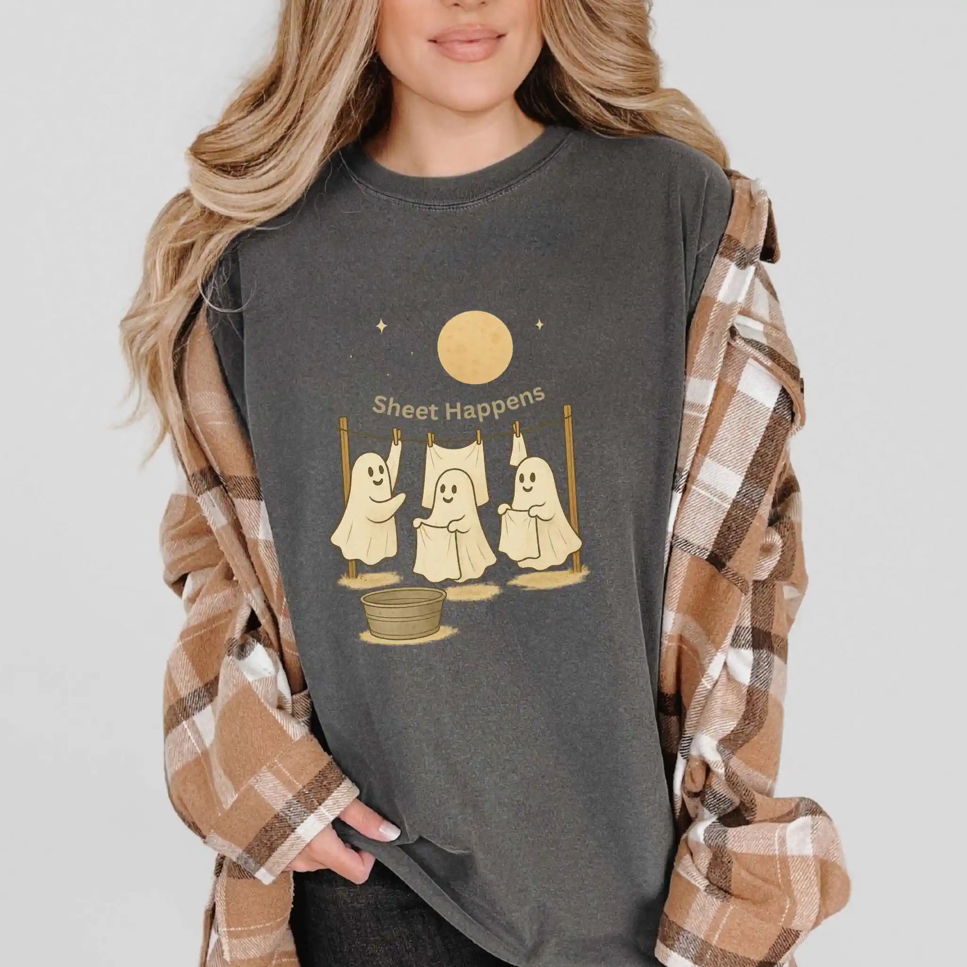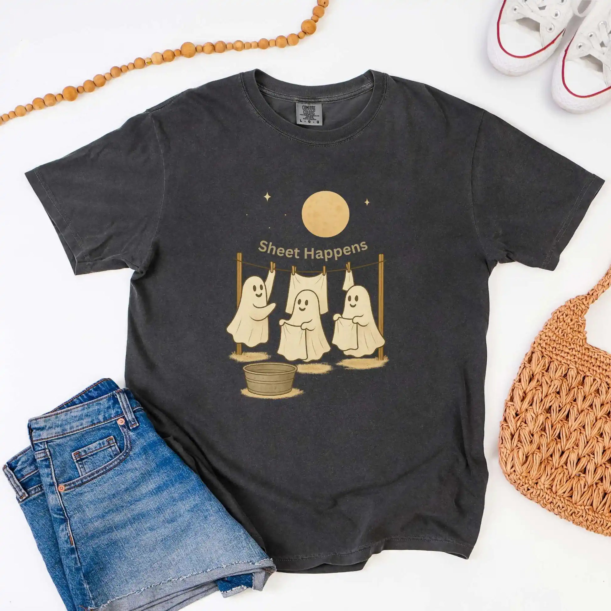 Features a front graphic of three happy ghosts at a clothesline with the phrase “Sheet Happens” above. Printed on the front of a t-shirt, this design is ideal for Halloween parties, fall outings, or anyone who enjoys playful seasonal humor.