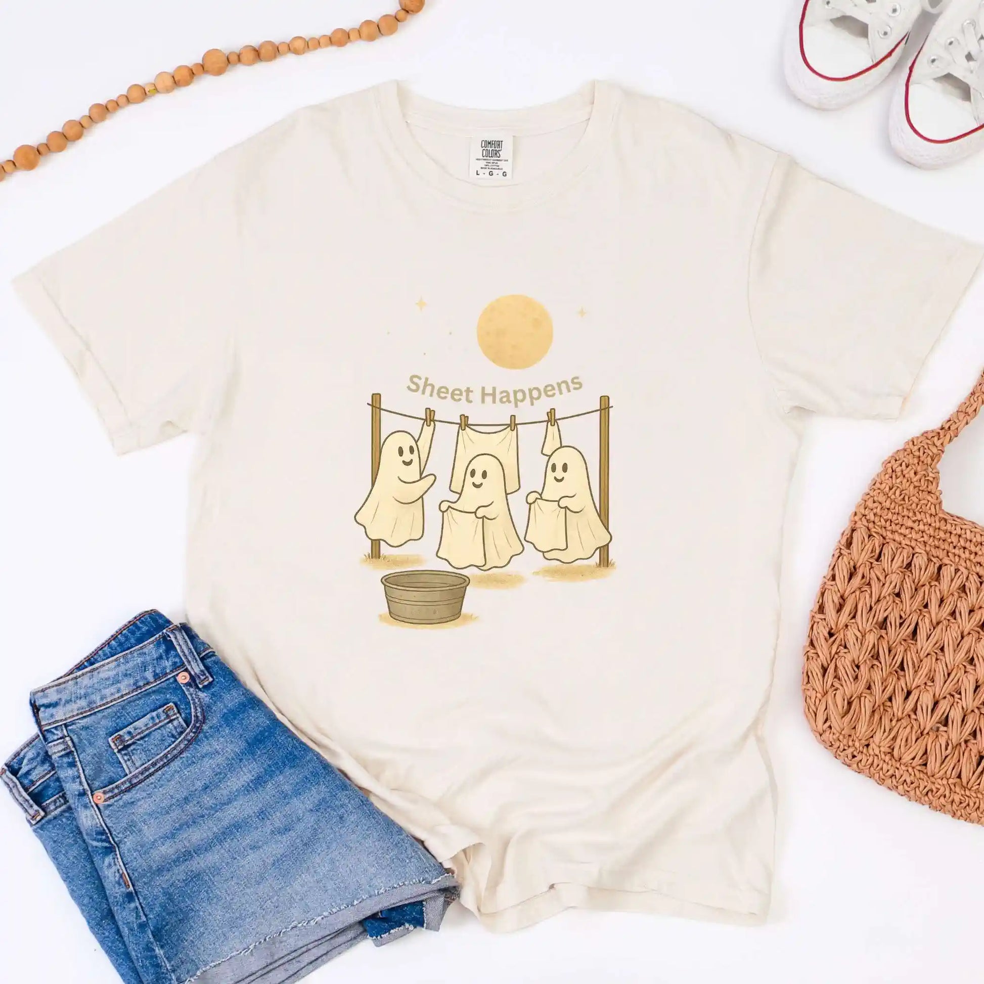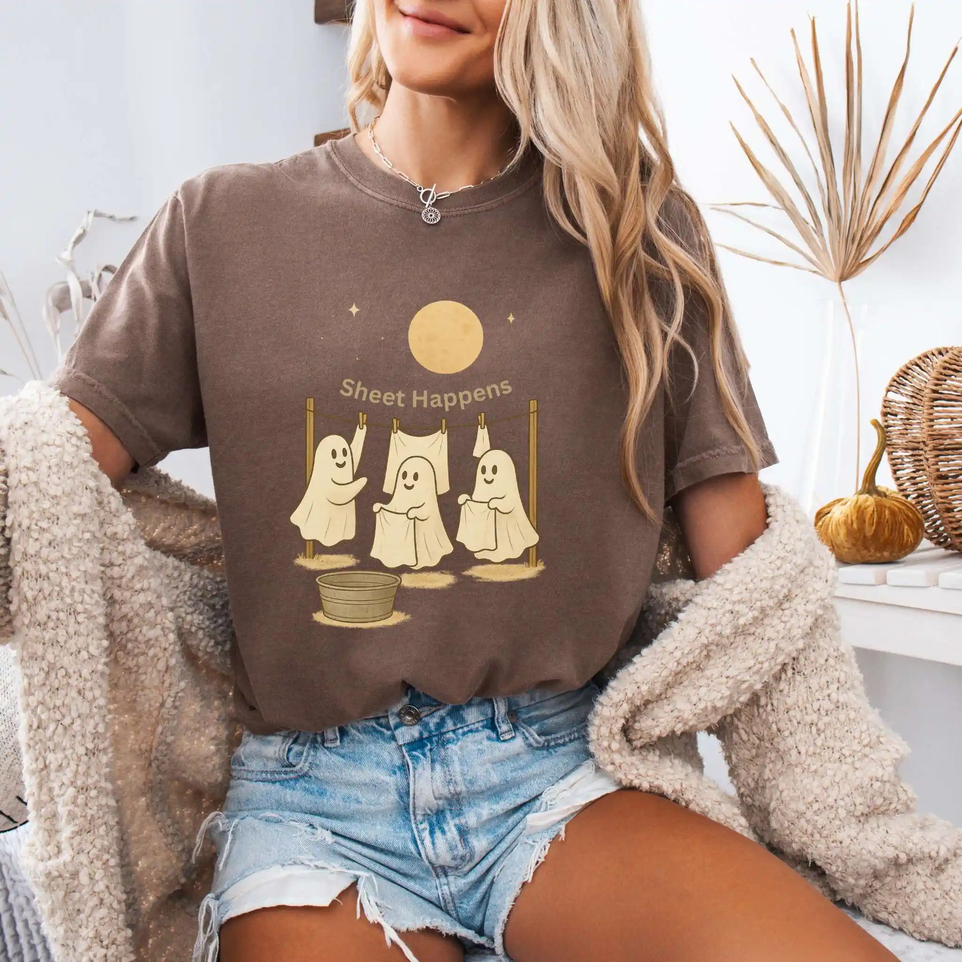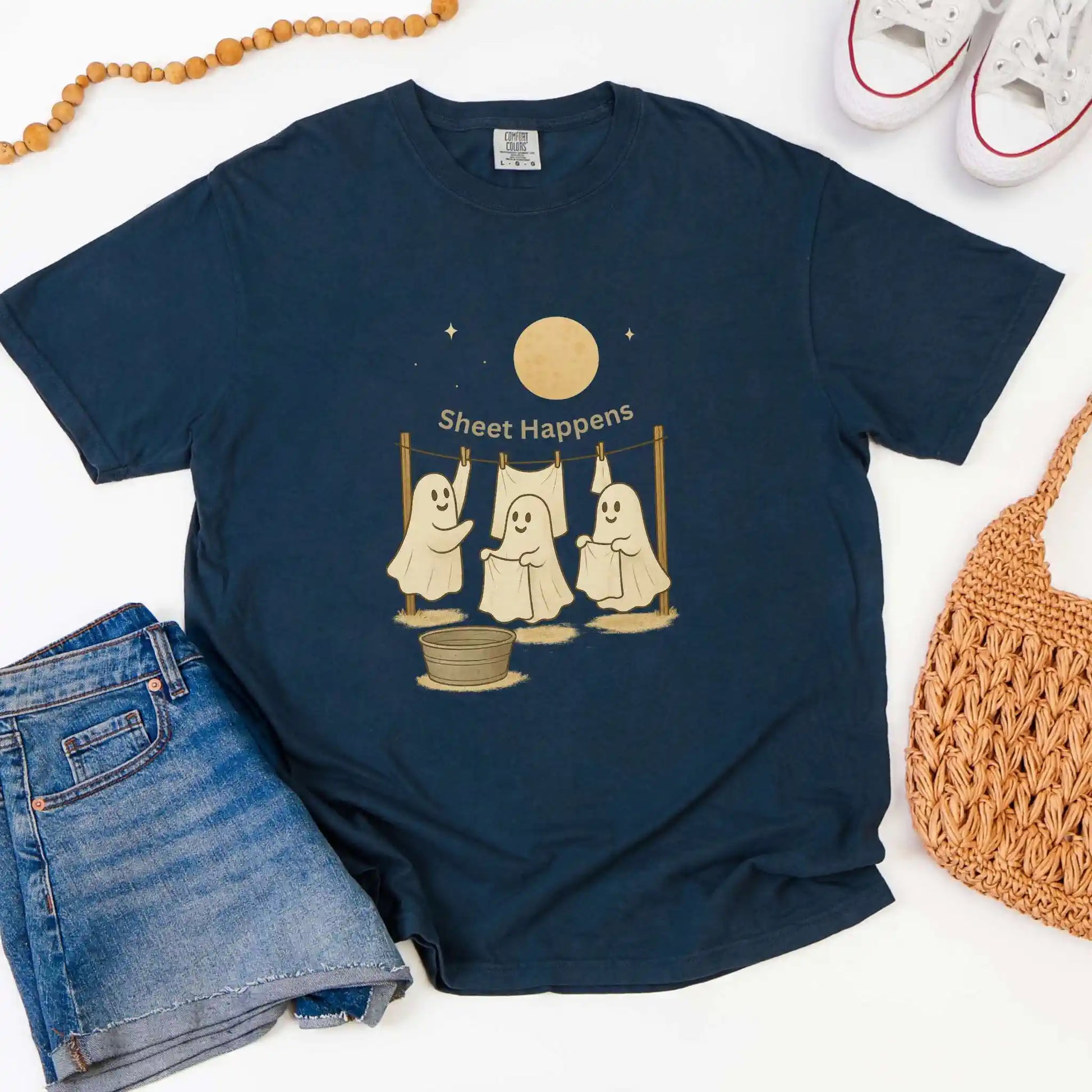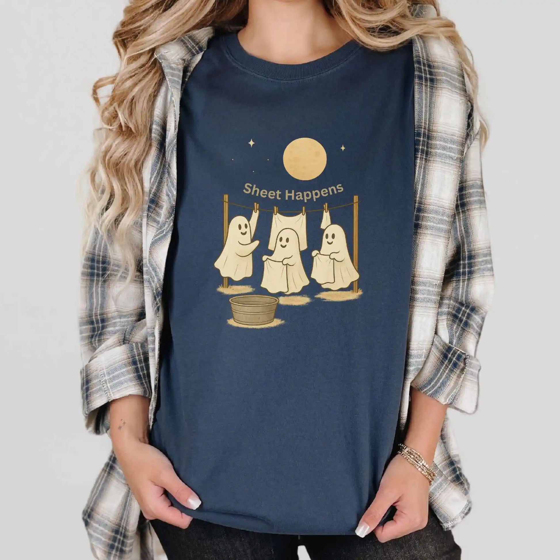 Features a front graphic of three happy ghosts at a clothesline with the phrase “Sheet Happens” above. Printed on the front of a t-shirt, this design is ideal for Halloween parties, fall outings, or anyone who enjoys playful seasonal humor.