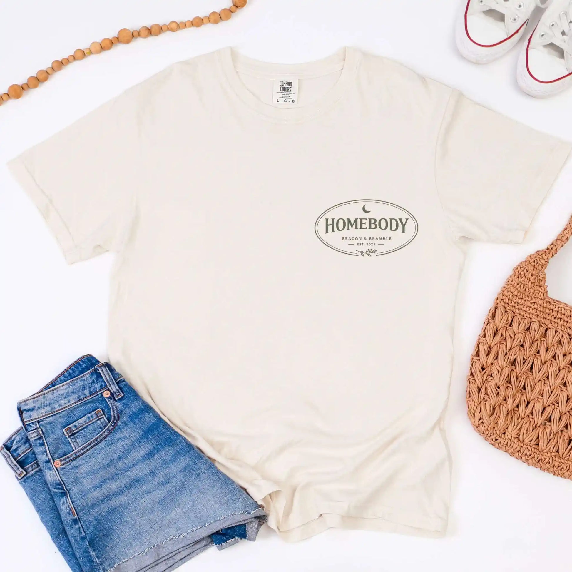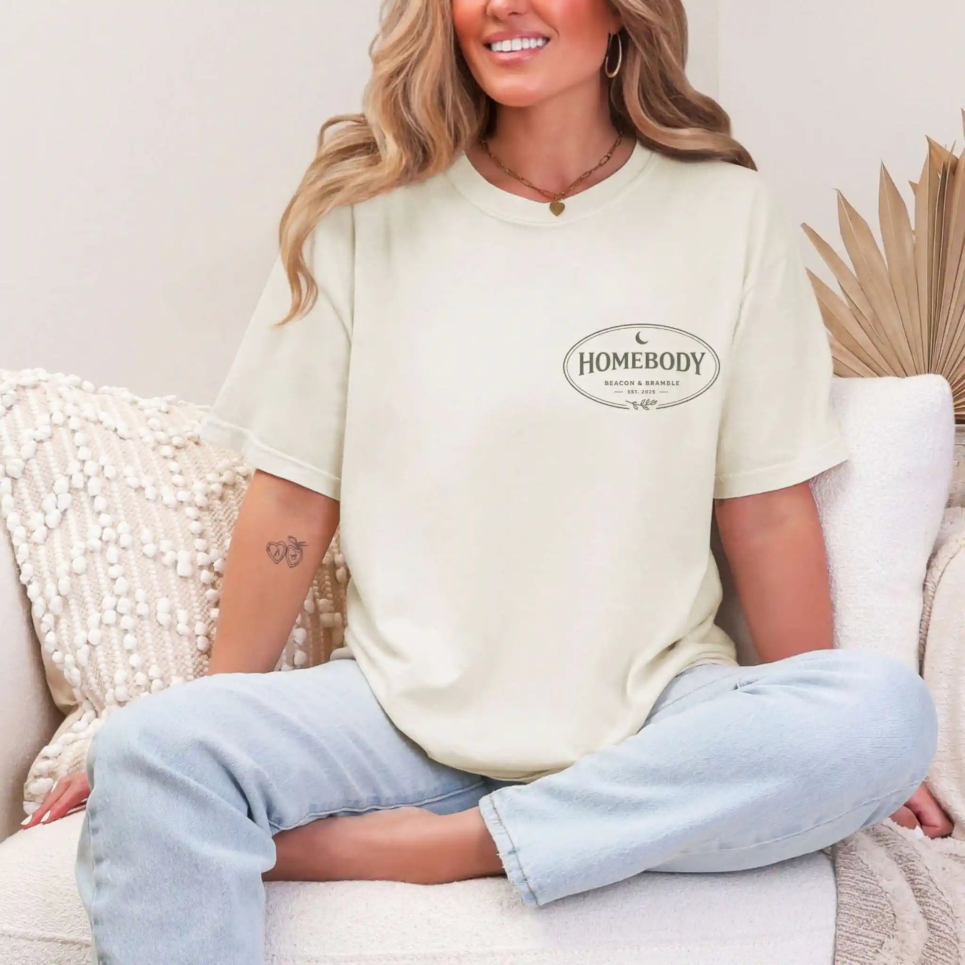 The front pocket design features a minimal homebody badge, while the back design presents stacked typography including “Quiet Life,” “Homebody,” and “No Rush.” This front-and-back t-shirt is ideal for relaxed weekends, reading nooks, and grounded days at home.