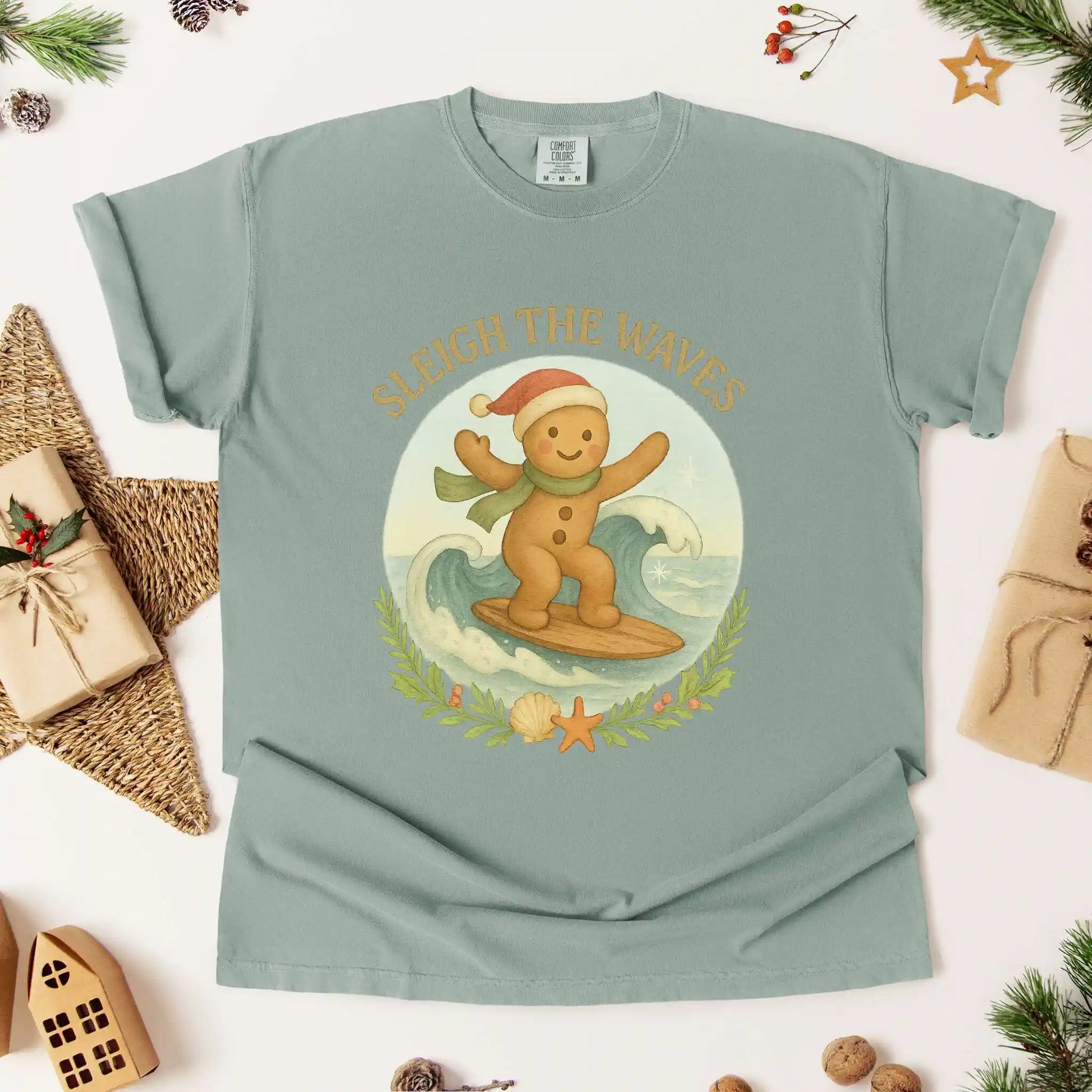 Catch a wave of Christmas spirit with our “Sleigh the Waves” tee.