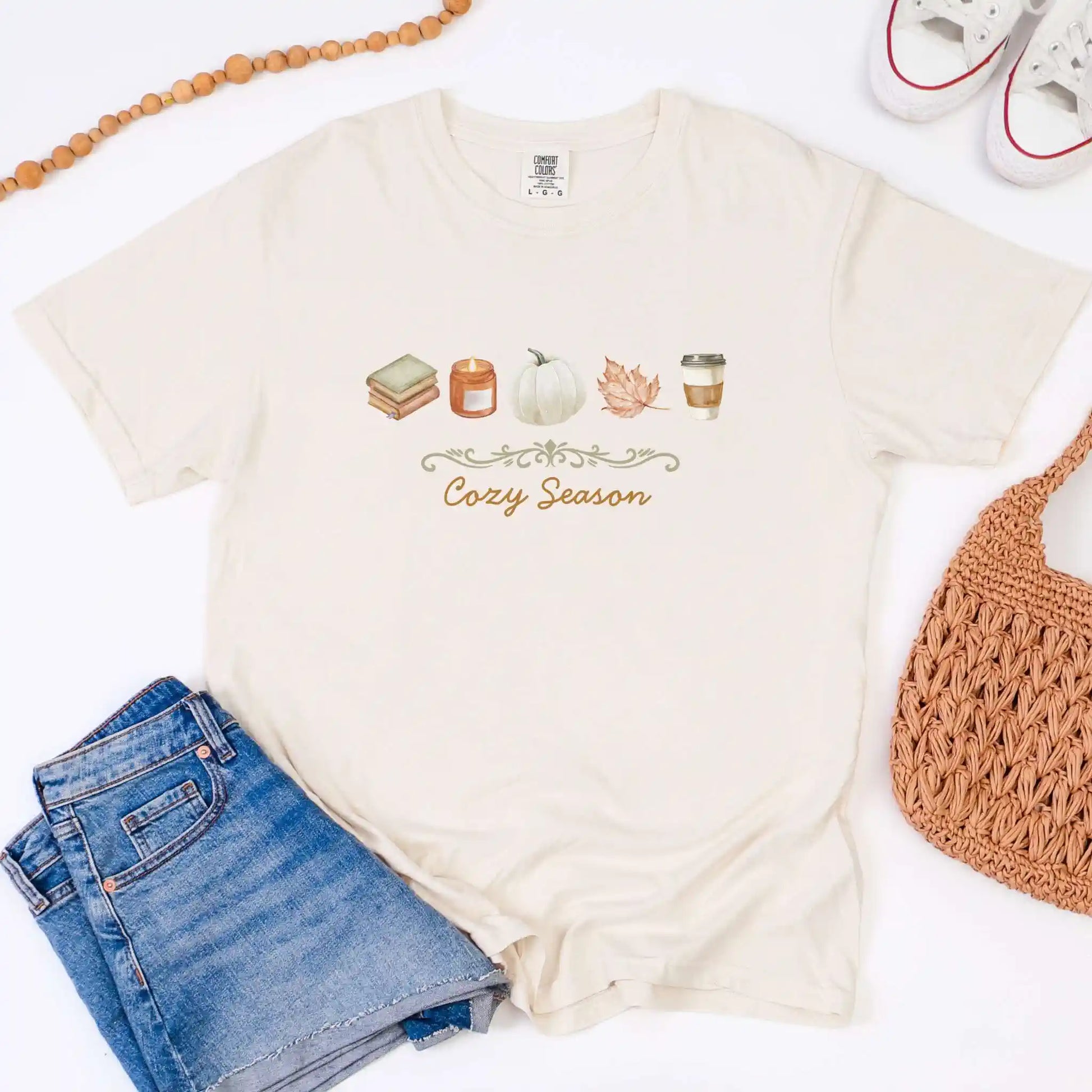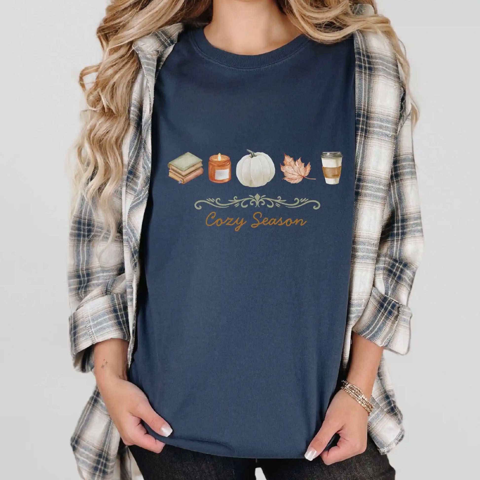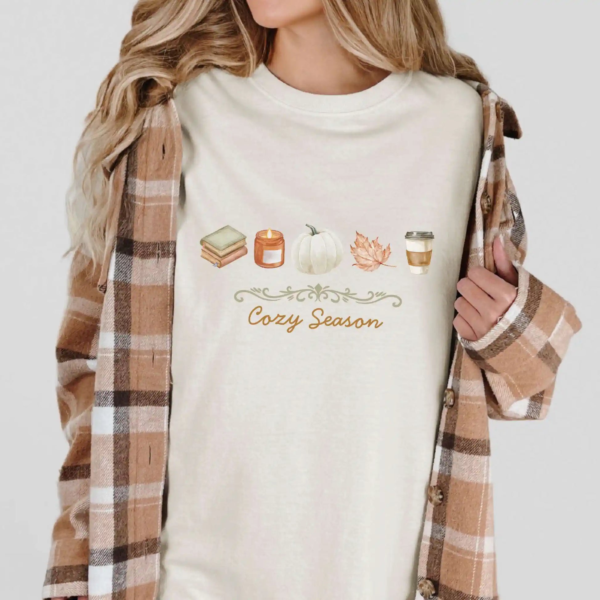 The front graphic features illustrated icons — stacked books, a glowing candle, a white pumpkin, a coffee cup, and scattered leaves — above the words “Cozy Season.” Printed on the front of a soft t-shirt, it’s perfect for reading days, coffee shop escapes, and slow autumn evenings.