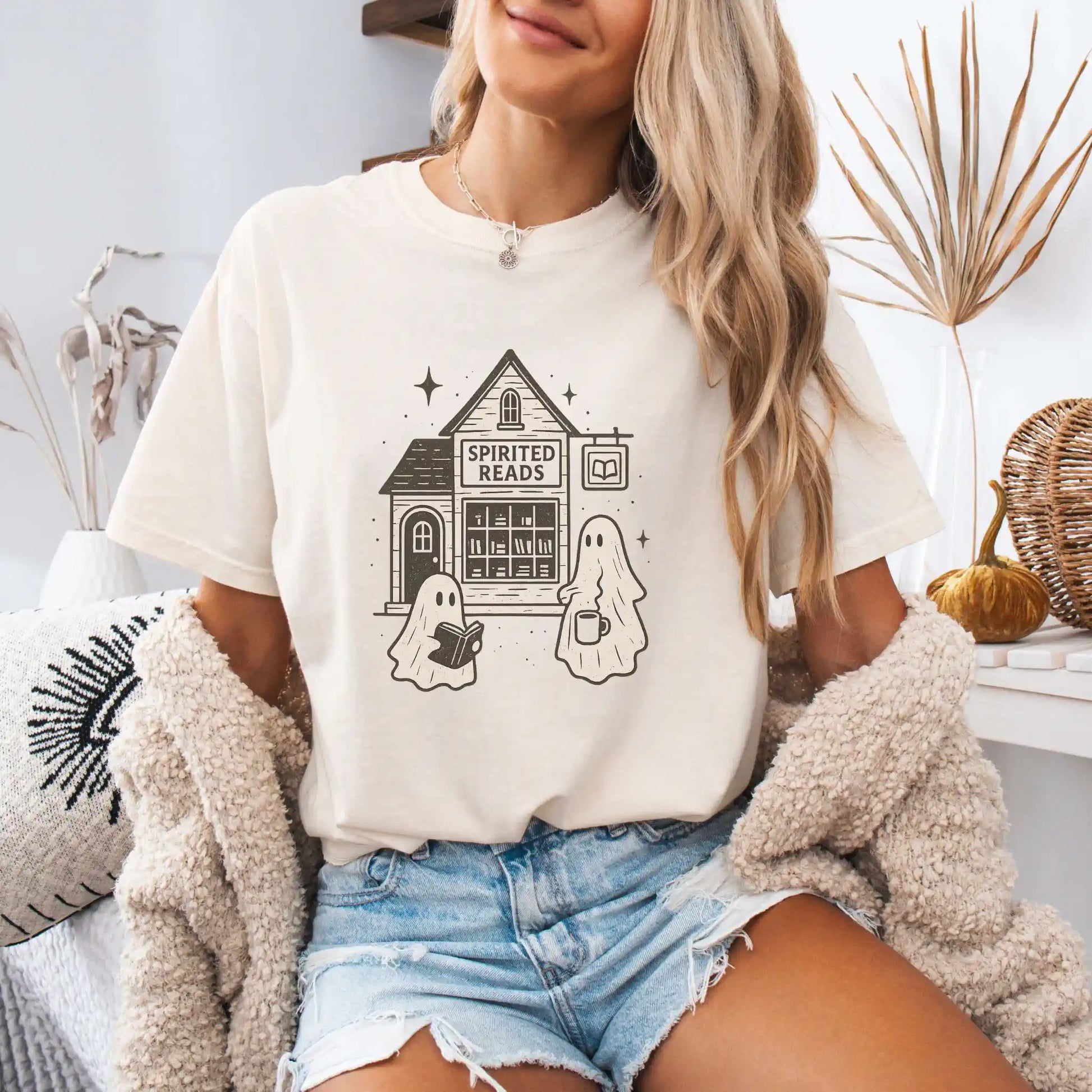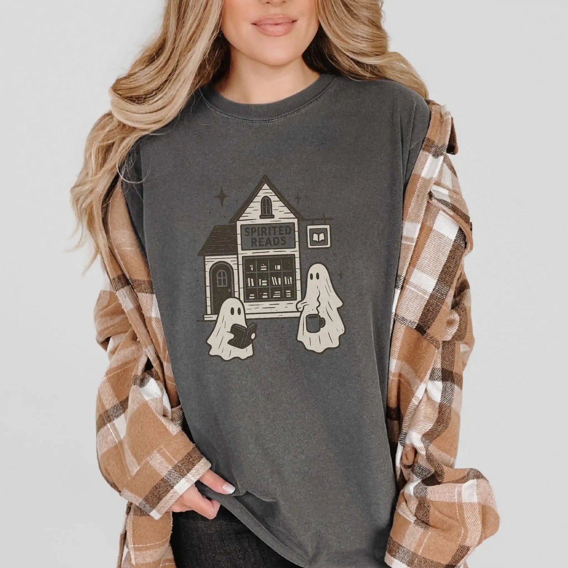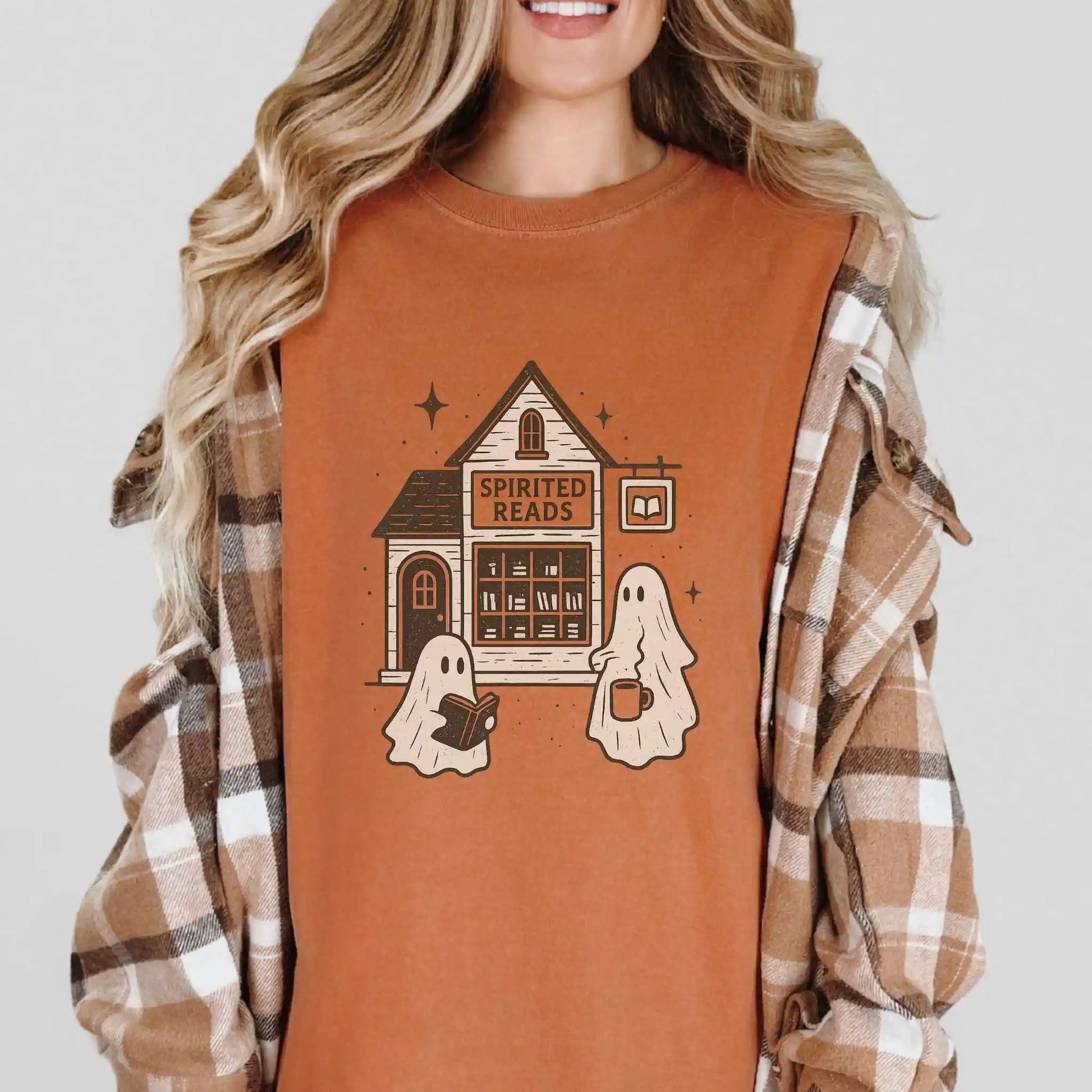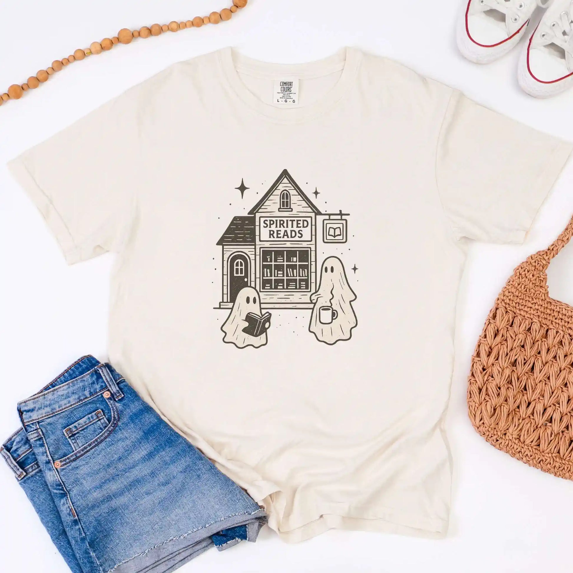 Features a front graphic of a quaint bookshop labeled “Spirited Reads,” with two friendly ghosts — one reading, one sipping coffee. Printed on the front of a t-shirt, this design is ideal for autumn evenings, library visits, or anyone who loves a spirited storytime.