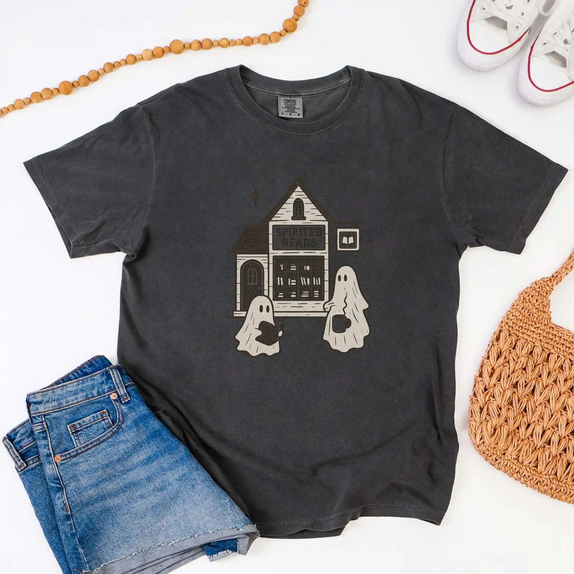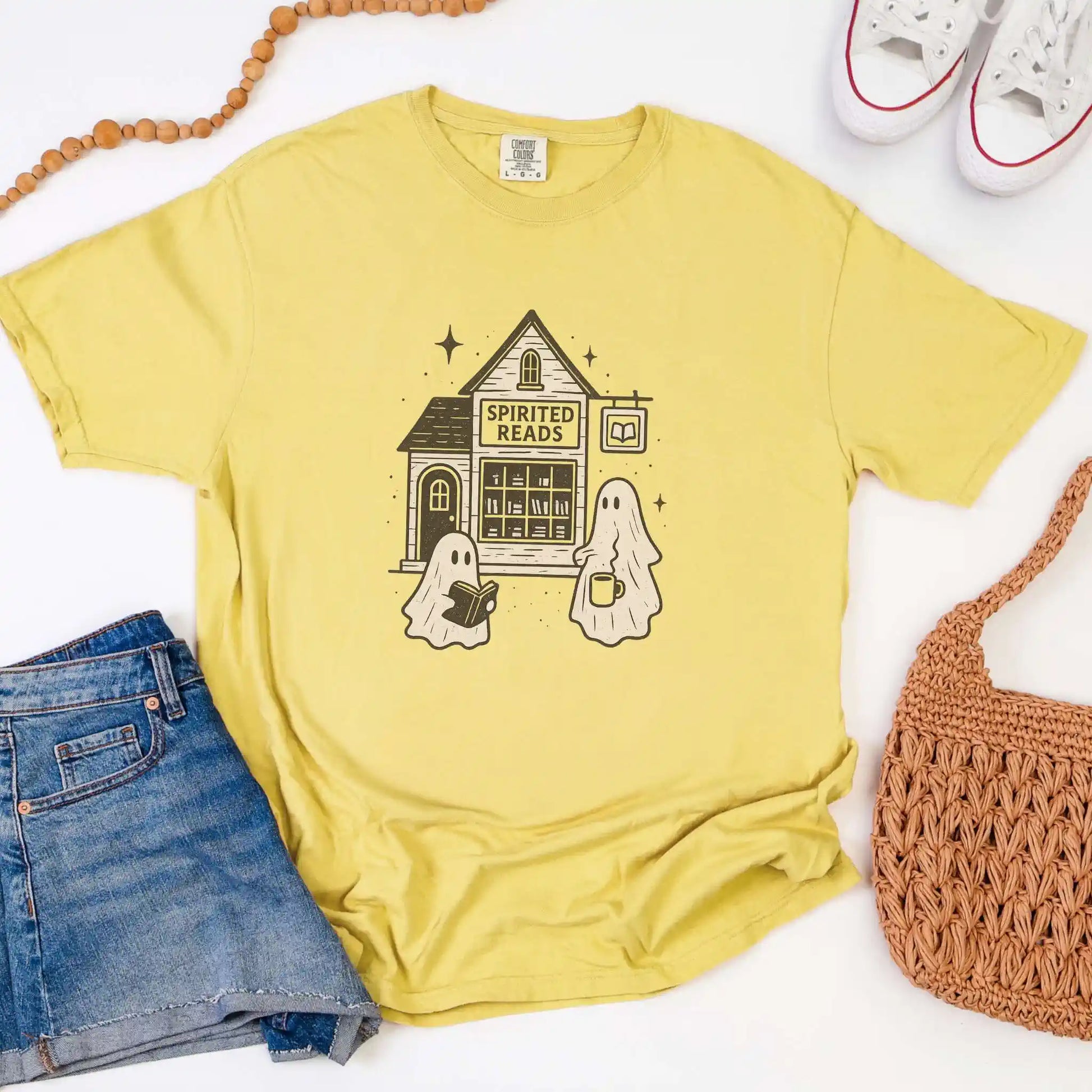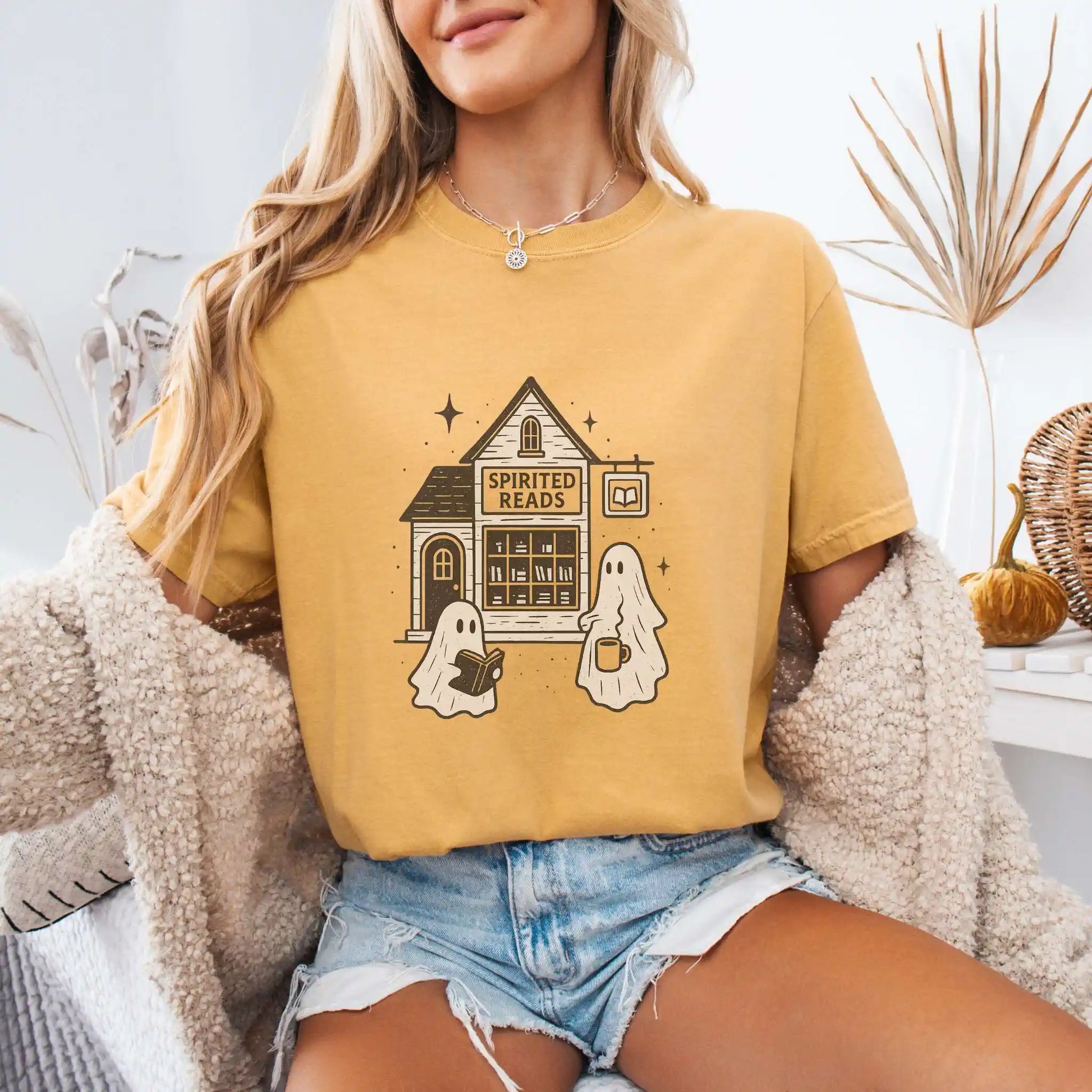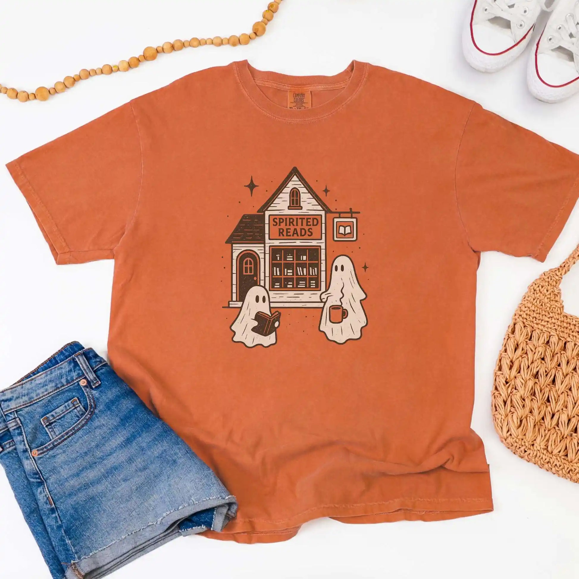 Features a front graphic of a quaint bookshop labeled “Spirited Reads,” with two friendly ghosts — one reading, one sipping coffee. Printed on the front of a t-shirt, this design is ideal for autumn evenings, library visits, or anyone who loves a spirited storytime.