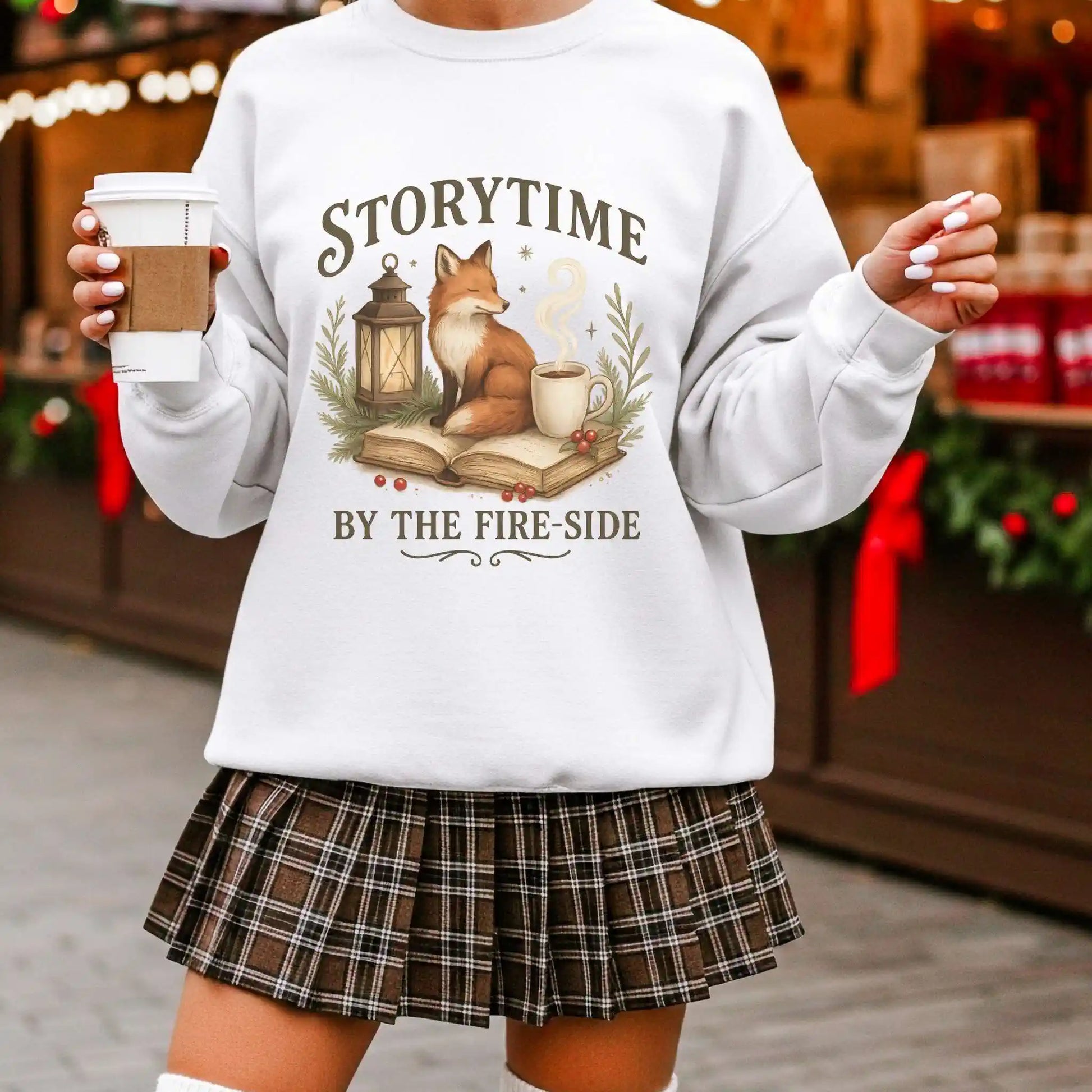 The front graphic features a peaceful fox seated on an open book, next to a steaming cup of cocoa and glowing lantern, surrounded by sprigs of greenery and winter berries. Printed on a cozy sweatshirt with a front centered design, it’s perfect for curling up with stories, gifting a book lover, or cozying up during the holidays.