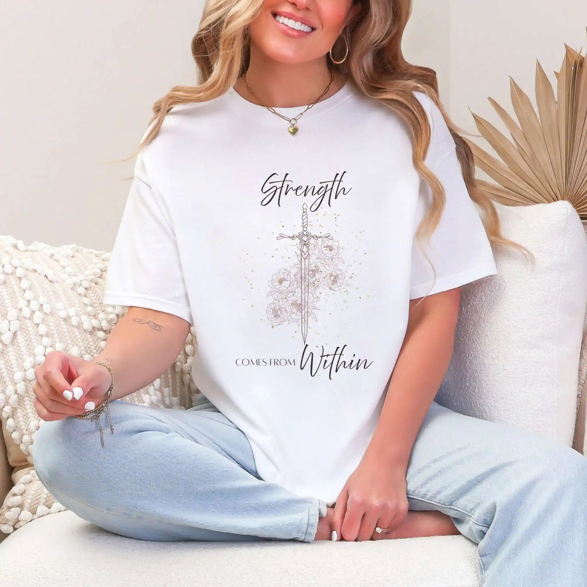 Printed on the front of a classic t‑shirt, this design makes a fierce yet feminine statement — perfect for anyone finding strength in softness.