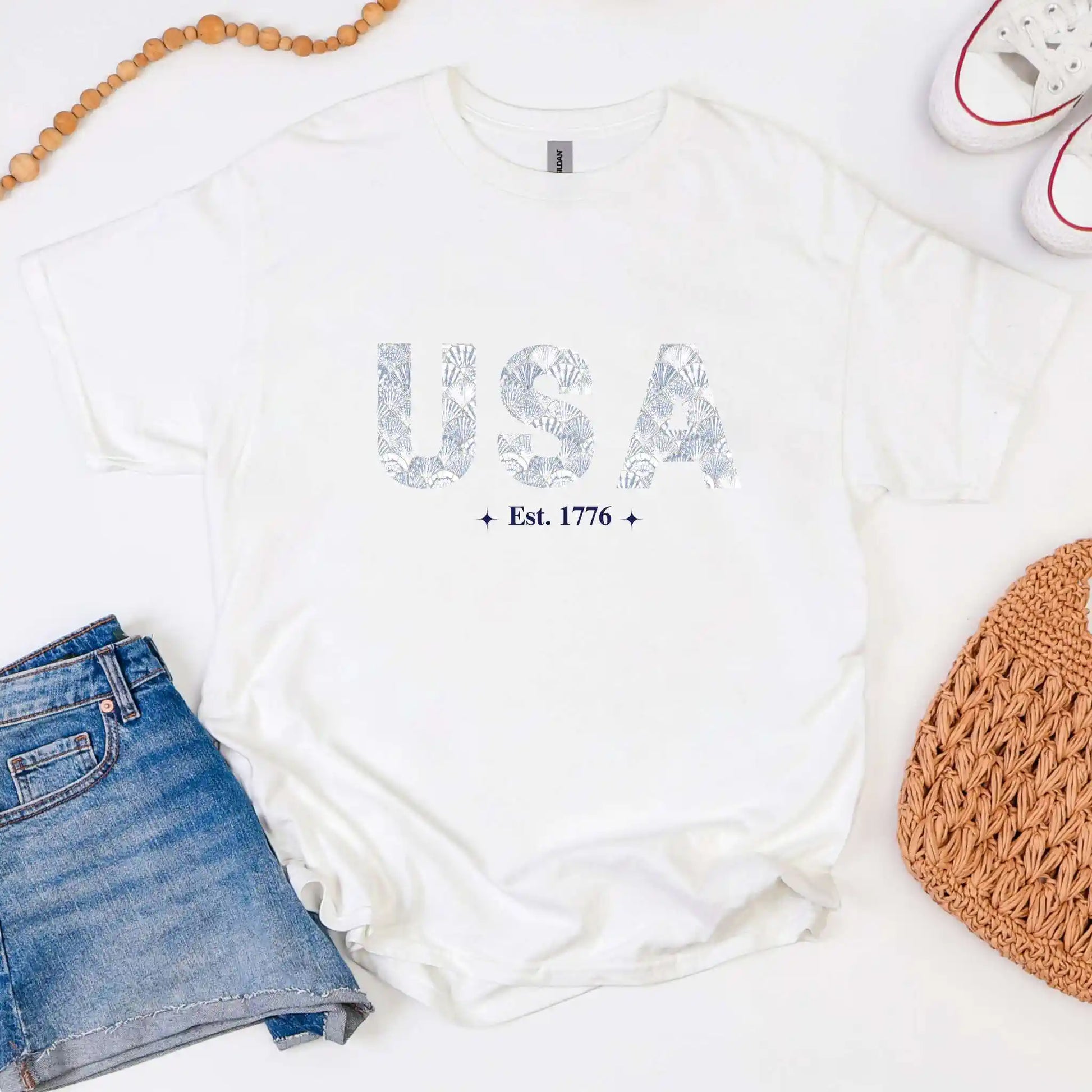 Front Design t-shirt of "USA" filled with an elegant blue and white seashell pattern, adorned with "Est. 1776". Embrace the spirit of the USA with a serene coastal twist in this eye-catching design, making it ideal for beach lovers and patriots alike.