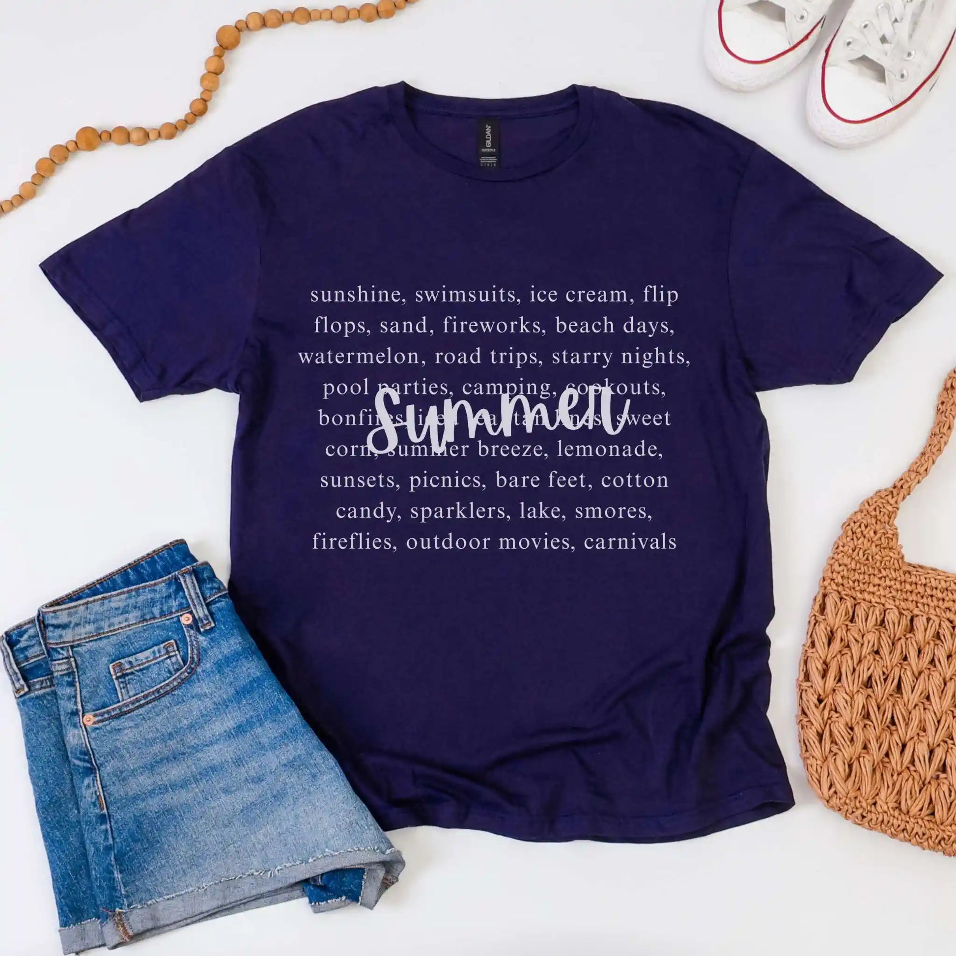 It’s all here — the sunshine, the ice cream, the fireworks. This tee celebrates the golden season of road trips, pool parties, cotton candy, and barefoot memories. It’s the kind of shirt that practically smells like sunscreen and sounds like a sparkler.
