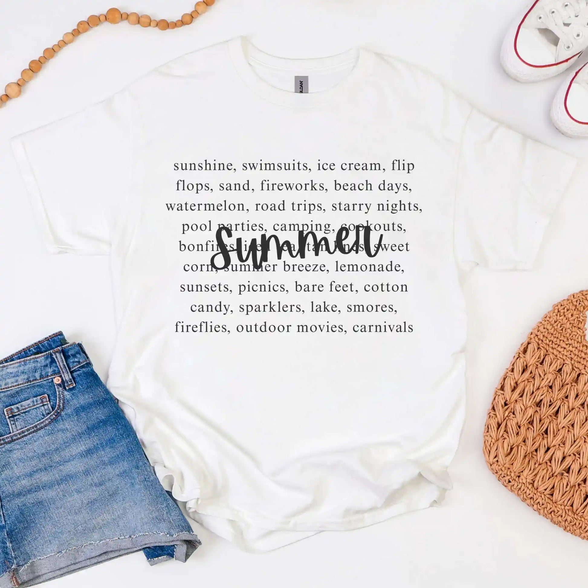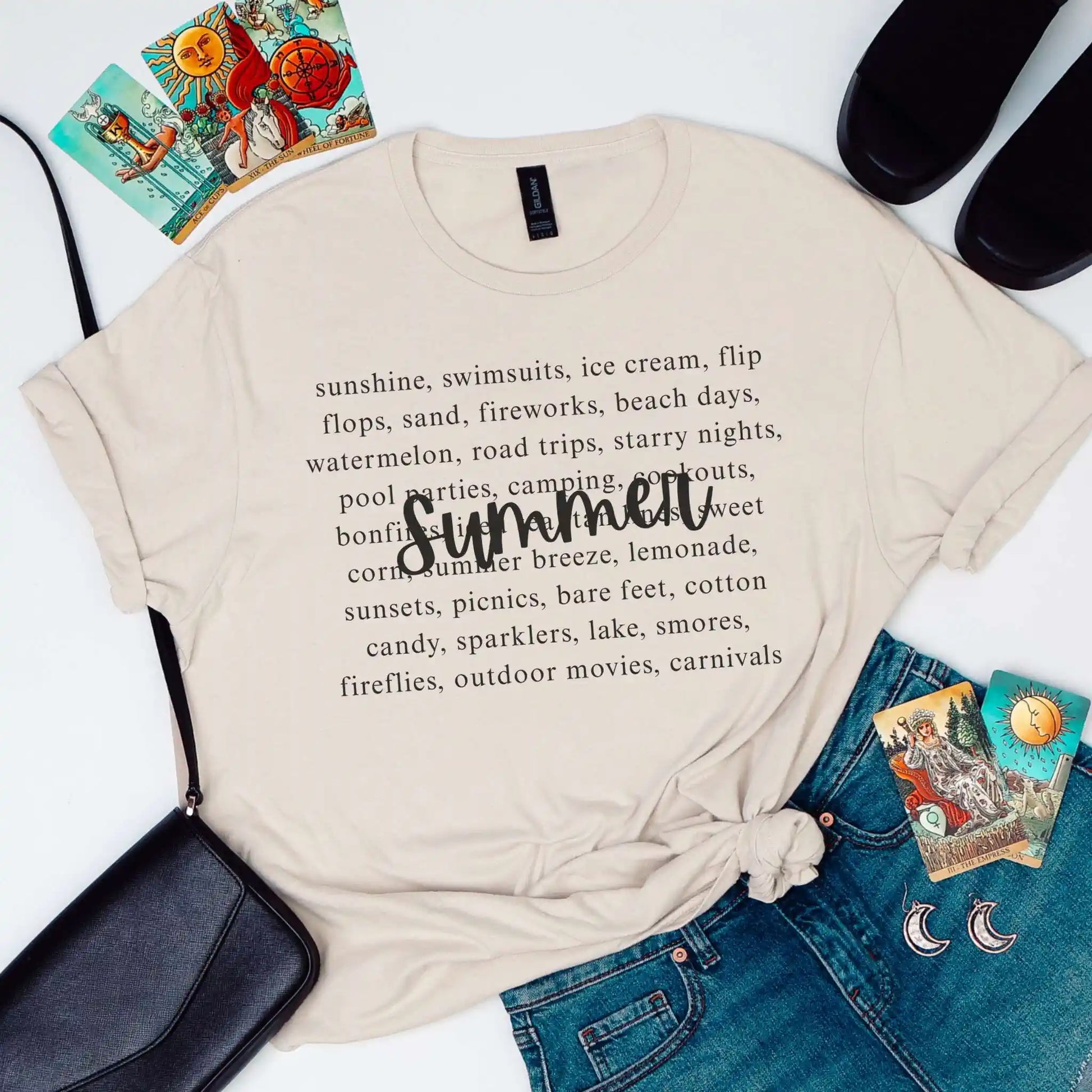 The design is a flowing list of summer joys like lemonade, fireflies, and beach days, all cascading behind a playful hand-drawn "Summer" across the center. It’s a warm, whimsical tribute to everything that makes this season feel like freedom.