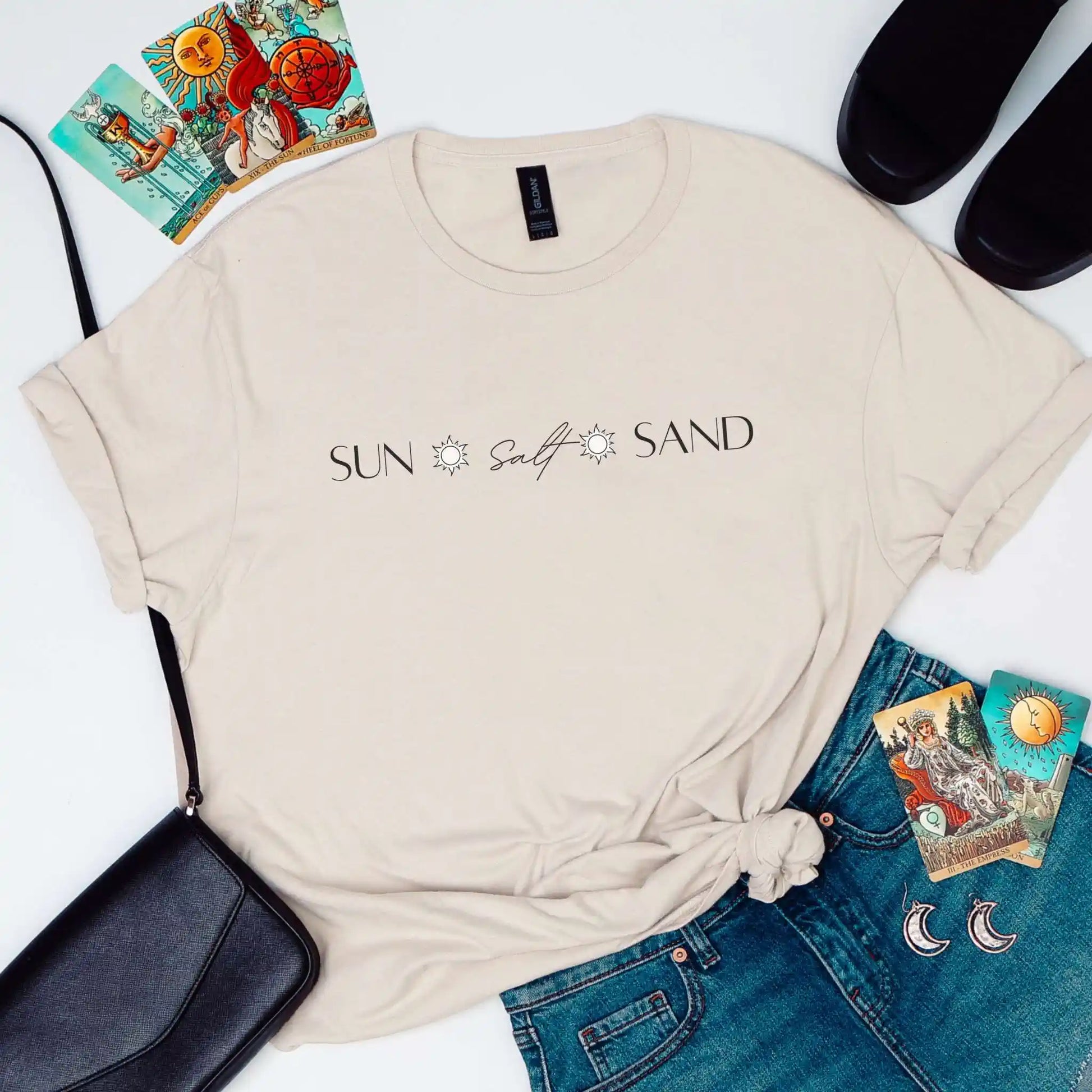 “Sun, Salt, & Sand” is your go-to for beach days that don’t quit — packed with bold color and summer soul.