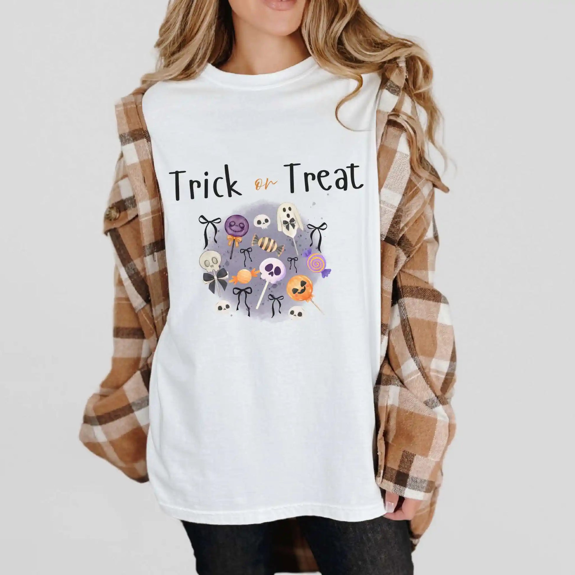 This t-shirt features a front design of scattered Halloween candies, ghost pops, and bow accents against a soft watercolor backdrop. Ideal for festive nights, candy swaps, and seasonal gatherings.